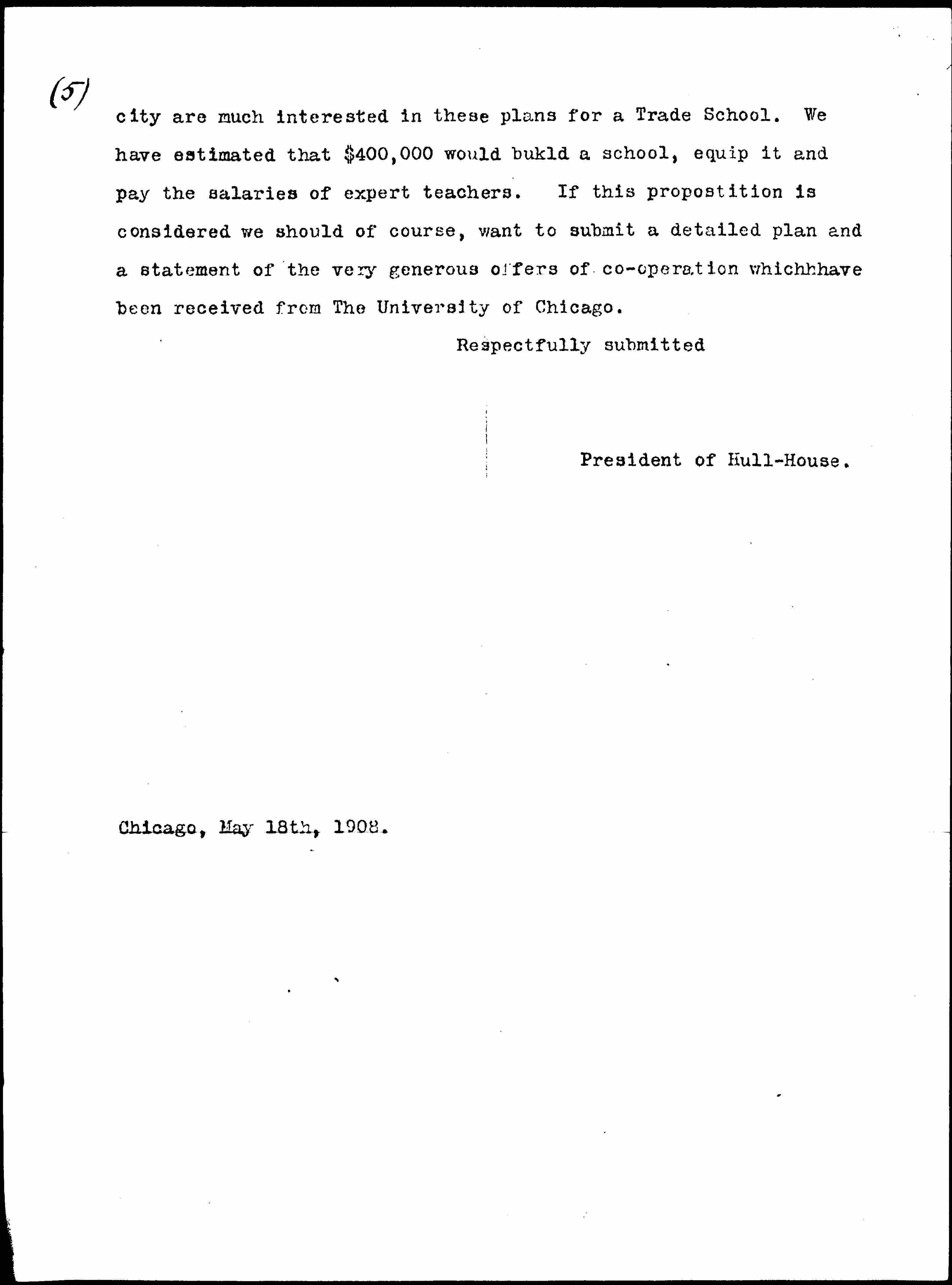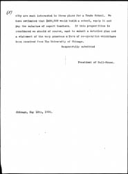 Mrs. Charles Henrotin and other leading women of the [page 2] city are much interested in these plans for a Trade School. We have estimated that $400,000 would build a school, equip it and pay the salaries of expert teachers. If this proposition is considered we should of course, want to submit a detailed plan and a statement of the very generous offers of [cooperation] which have been received from The University of Chicago.