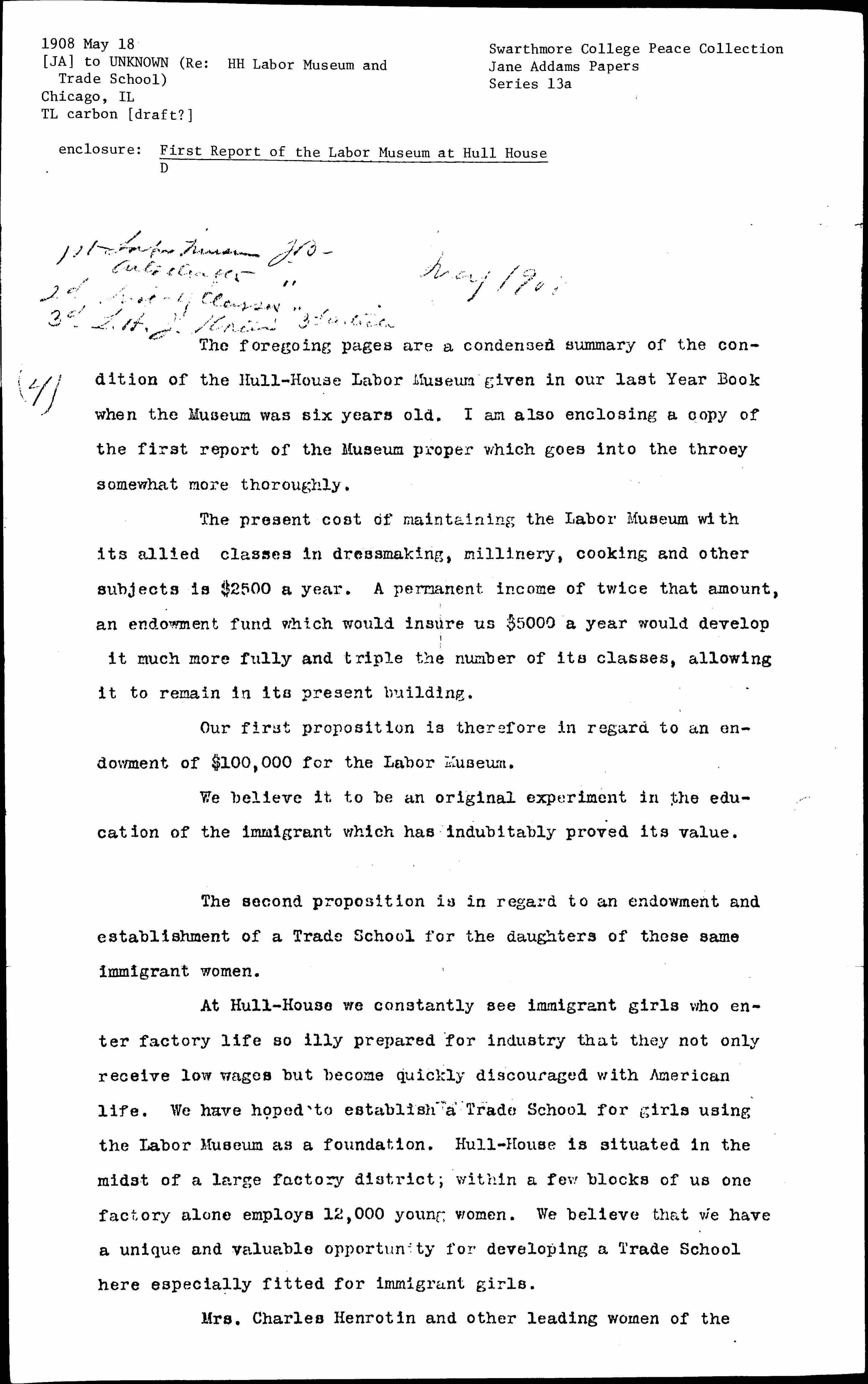 The present cost of maintaining the Labor Museum with its allied classes in dressmaking, millinery, cooking and other subjects is $2500 a year. A permanent income of twice that amount, an endowment fund which would [ensure] us $5000 a year would develop it much more fully and triple the number of its classes, allowing it to remain in its present building.
