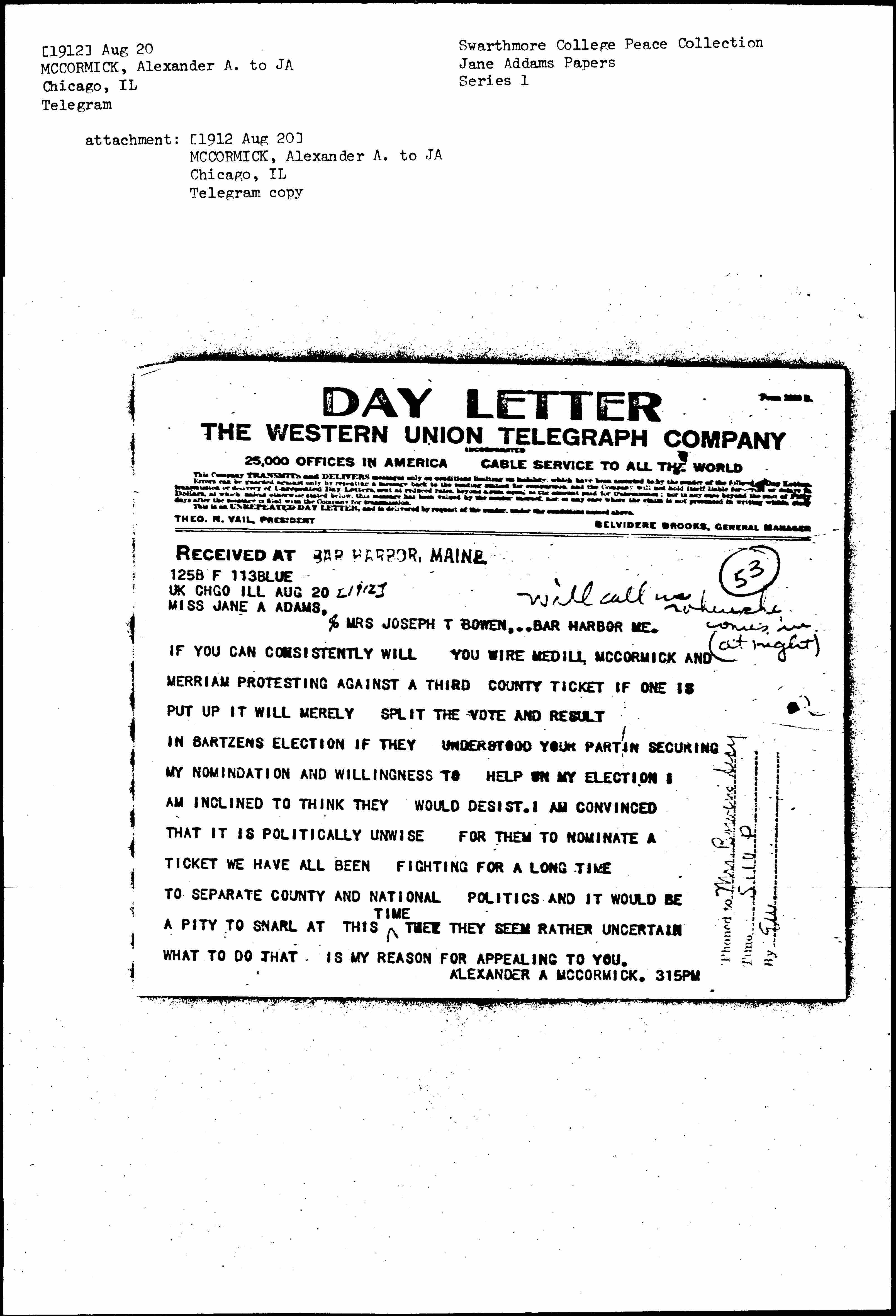 IF YOU CAN CONSISTENTLY WILL YOU WIRE MEDILL, MCCORMICK AND MERRIAM PROTESTING AGAINST A THIRD COUNTY TICKET IF ONE IS PUT UP IT WILL MERELY SPLIT THE VOTE AND RESULT IN BARTZENS ELECTION IF THEY UNDERSTOOD YOUR PART IN SECURING MY NOMINATION AND WILLINGNESS TO HELP ON MY ELECTION I AM INCLINED TO THINK THEY WOULD DESIST. I AM CONVINCED THAT IT IS POLITICALLY UNWISE FOR THEM TO NOMINATE A TICKET WE HAVE ALL BEEN FIGHTING FOR A LONG TIME TO SEPARATE COUNTY AND NATIONAL POLITICS AND IT WOULD BE A PITY TO SNARL AT THIS <TIME> THEY THEY SEEM RATHER UNCERTAIN WHAT TO DO THAT IS MY REASON FOR APPEALING TO YOU.
