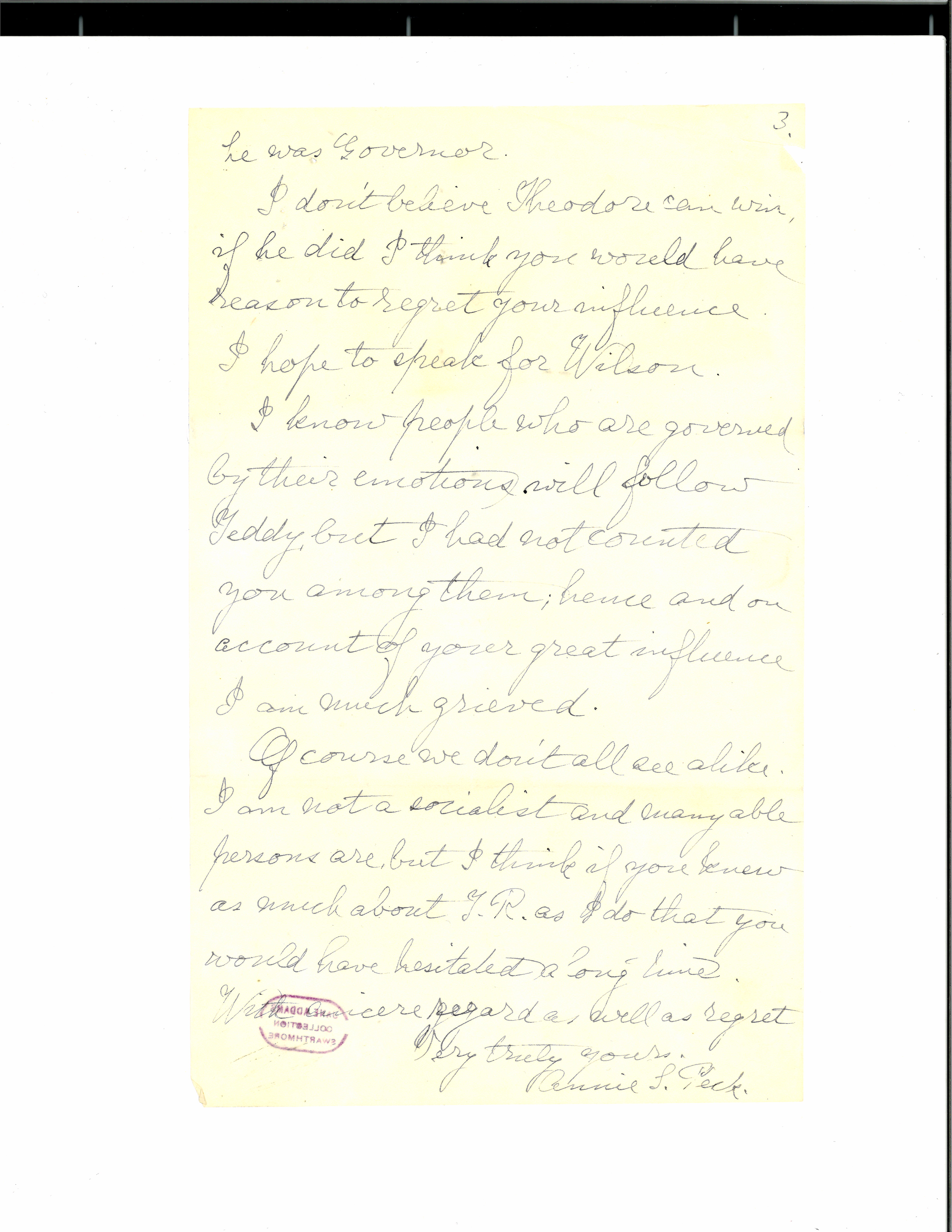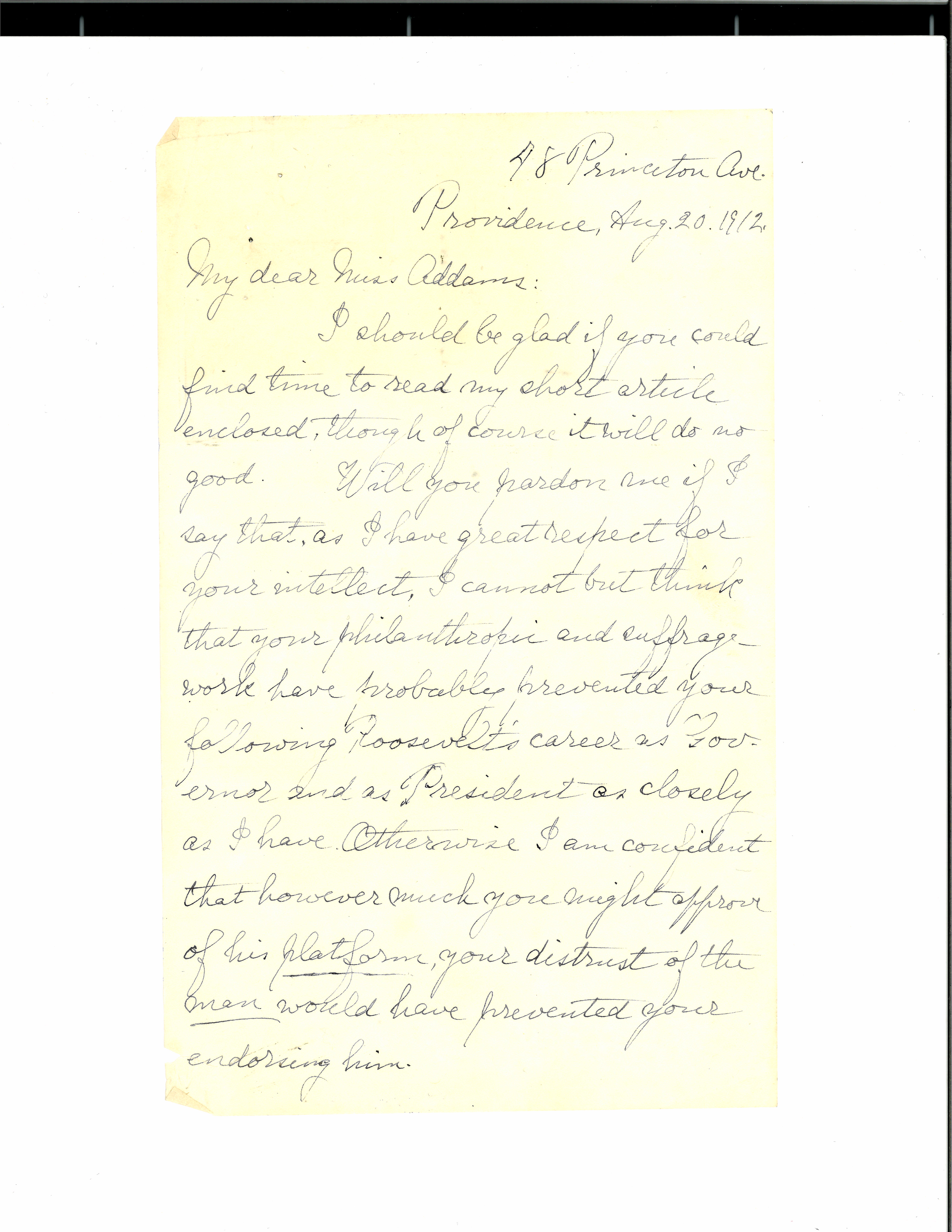 I should be glad if you could find time to read my short article enclosed, though of course it will do no good. Will you pardon me if I say that, as I have great respect for your intellect, I cannot but think that your philanthropic and suffrage work have probably prevented your following Roosevelt's career as Governor and as President as closely as I have. Otherwise I am confident that however much you might approve of his platform, your distrust of the man would have prevented your endorsing him. [page 2]