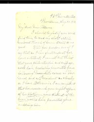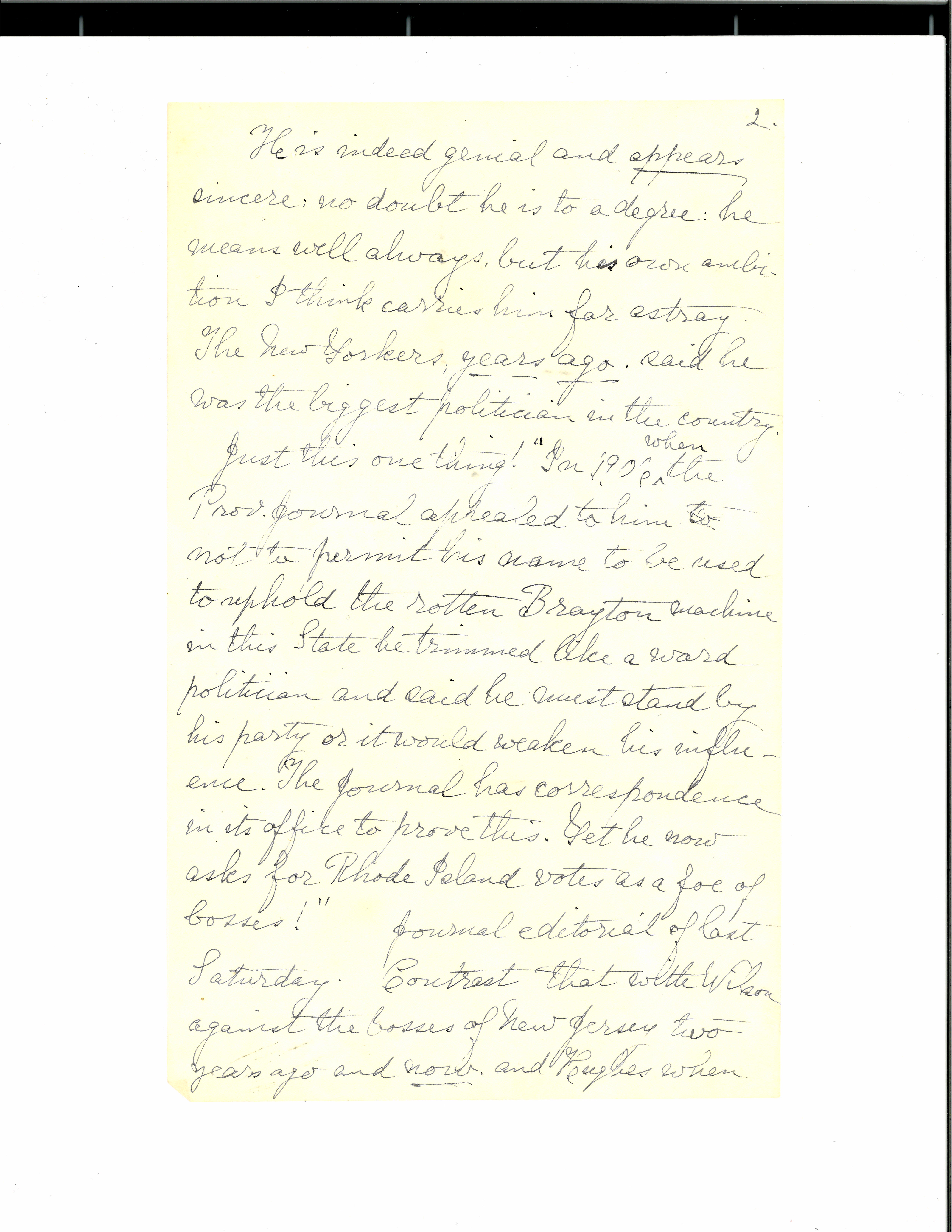 Just this one thing! "In 1906 <when> the Prov. Journal appealed to him to not to permit his name to be used to uphold the rotten Brayton machine in this State he trimmed like a ward politician and said he must stand by his party or it would weaken his influence. The Journal has correspondence in its office to prove this. Yet he now asks for Rhode Island votes as a foe of bosses!" Journal editorial of last Saturday. Contrast that with Wilson against the bosses of New Jersey two years ago and now and Hughes when [page 3] he was Governor.