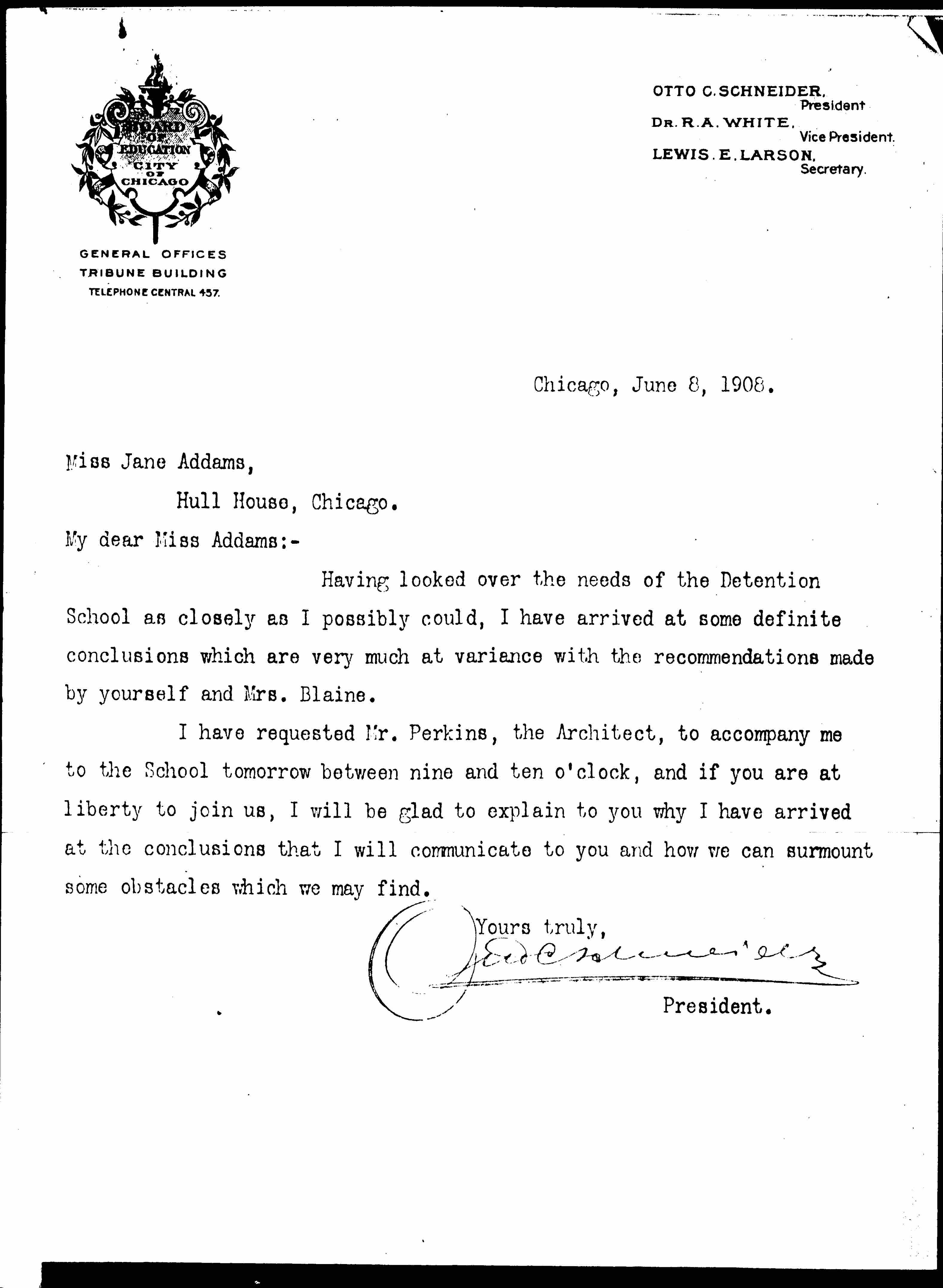 I have requested Mr. Perkins, the Architect, to accompany me to the School tomorrow between nine and ten o'clock, and if you are at liberty to join us, I will be glad to explain to you why I have arrived at the conclusions that I will communicate to you and how we can surmount some obstacles which we may find.