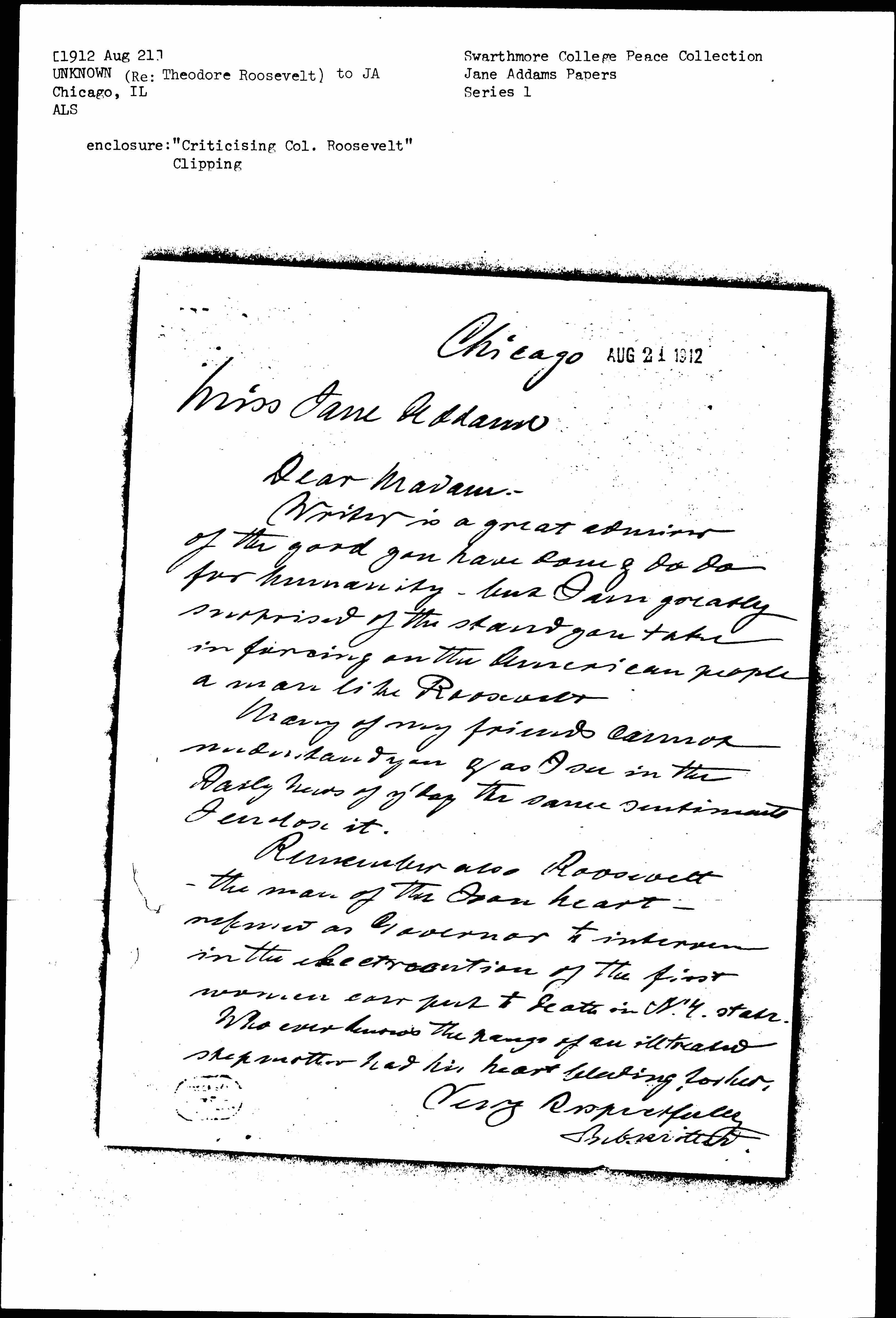 Writer is a great admirer of the good you have done & do do for humanity, but I am greatly surprised of the stand you take in forcing on the American people a man like Roosevelt