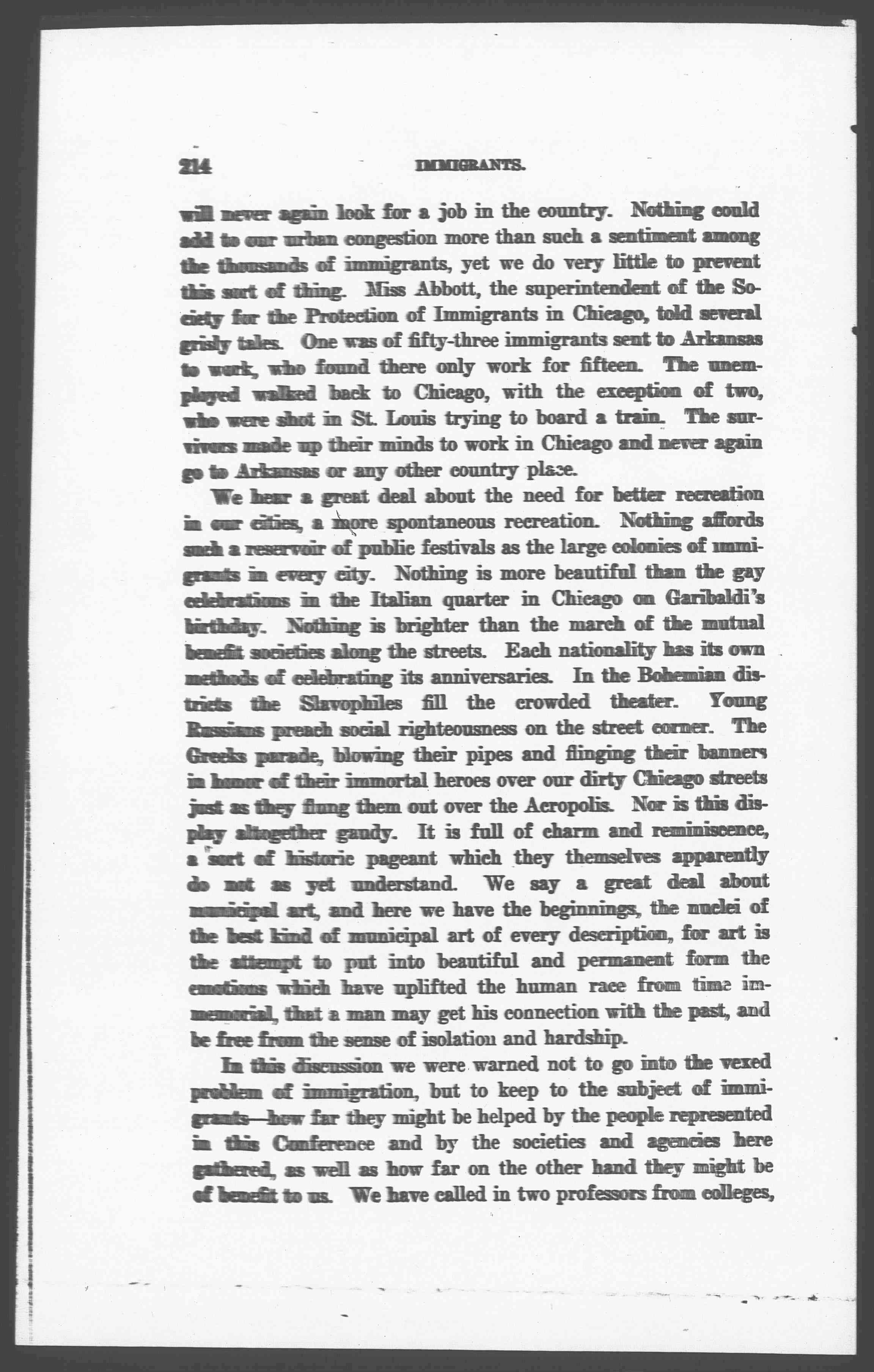 We talk about the congestion of our cities, and say the immigrants are adding to that congestion every year. But what do we do to help them out into the country? At one of the section meetings it was said that immigrants sent out into the country by existing employment agencies have suffered such bitter hardships that when they get back to the city they are firmly resolved that whatever else may happen to them they [page 2] will never again look for a job in the country. Nothing could add to our urban congestion more than such a sentiment among the thousands of immigrants, yet we do very little to prevent this sort of thing. Miss Abbott, the superintendent of the Society for the Protection of Immigrants in Chicago, told several grisly tales. One was of fifty-three immigrants sent to Arkansas to work, who found there only work for fifteen. The unemployed walked back to Chicago, with the exception of two, who were shot in St. Louis trying to board a train. The survivors made up their minds to work in Chicago and never again go to Arkansas or any other country place.