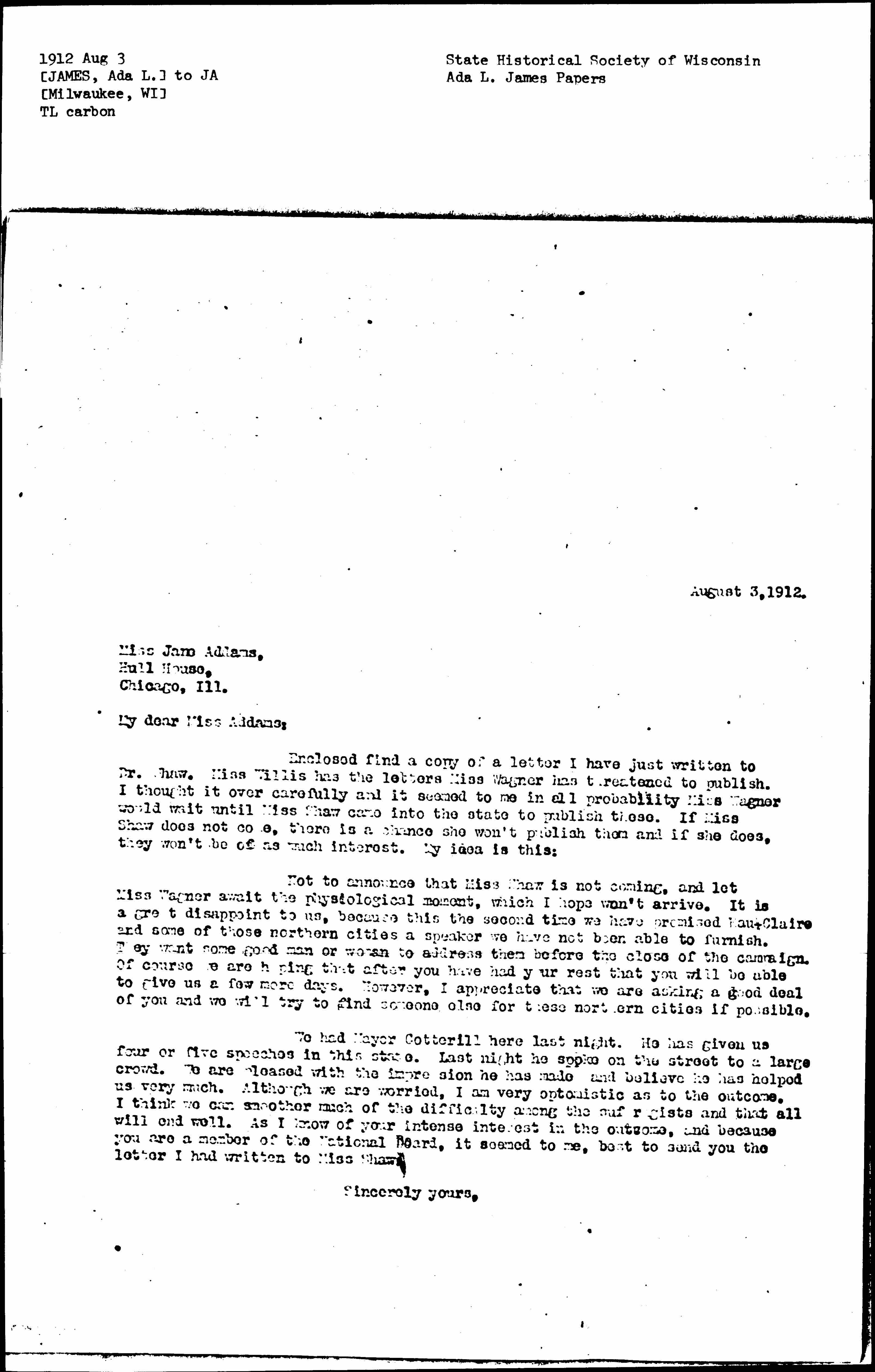 Not to announce that Miss Shaw is not coming, and let Miss Wagner await the physiological moment, which I hope won't arrive. It is a great disappoint to us, because this the second time we have promised [Eau Claire] and some of those northern cities a speaker we have not been able to furnish. They want some good man or woman to address them before the close of the campaign. Of course we are hoping that after you have had your rest that you will be able to give us a few more days. However, I appreciate that we are asking a good deal of you and we will try to find someone else for these northern cities if possible.