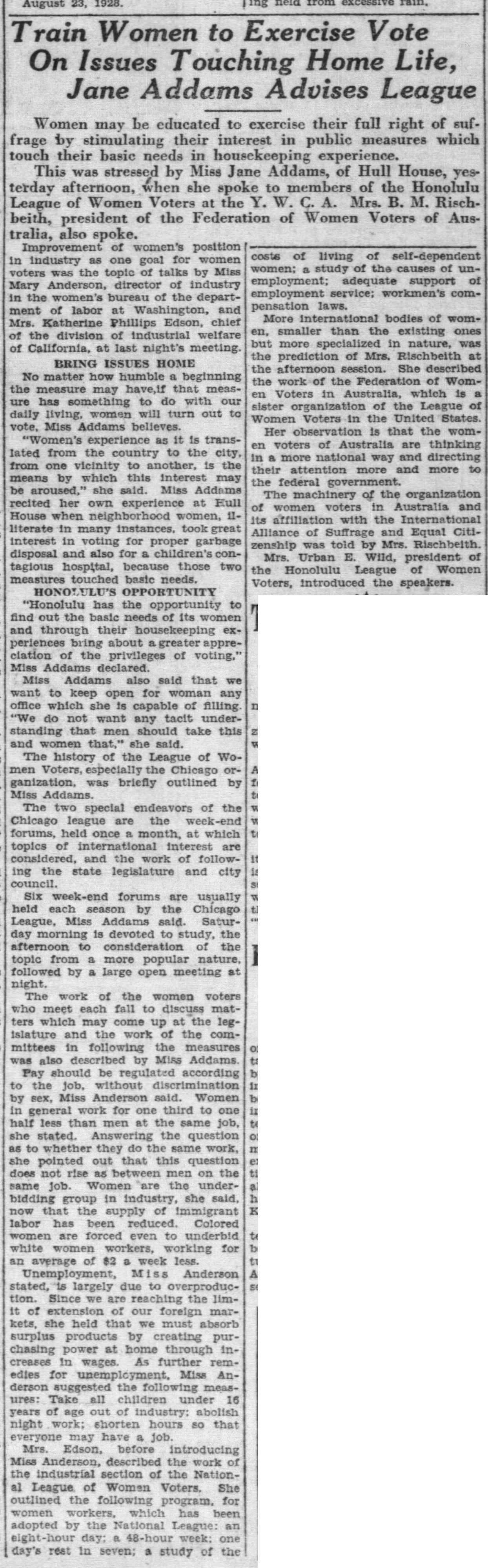 Speech to the Honolulu League of Women Voters, August 23, 1928 (summary)