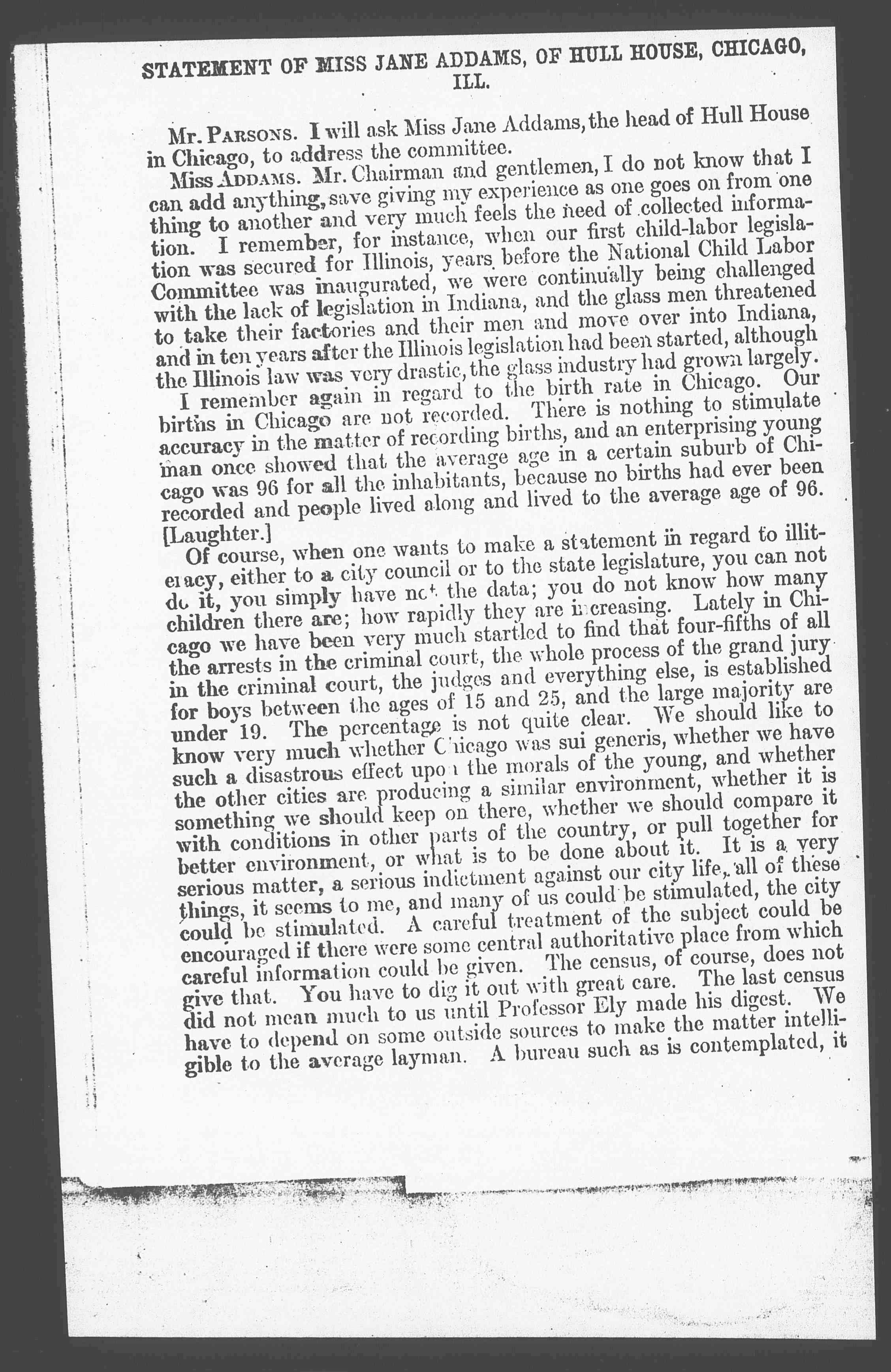 Mr. PARSONS. I will ask Miss Jane Addams, the head of Hull House in Chicago, to address the committee.