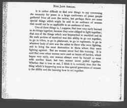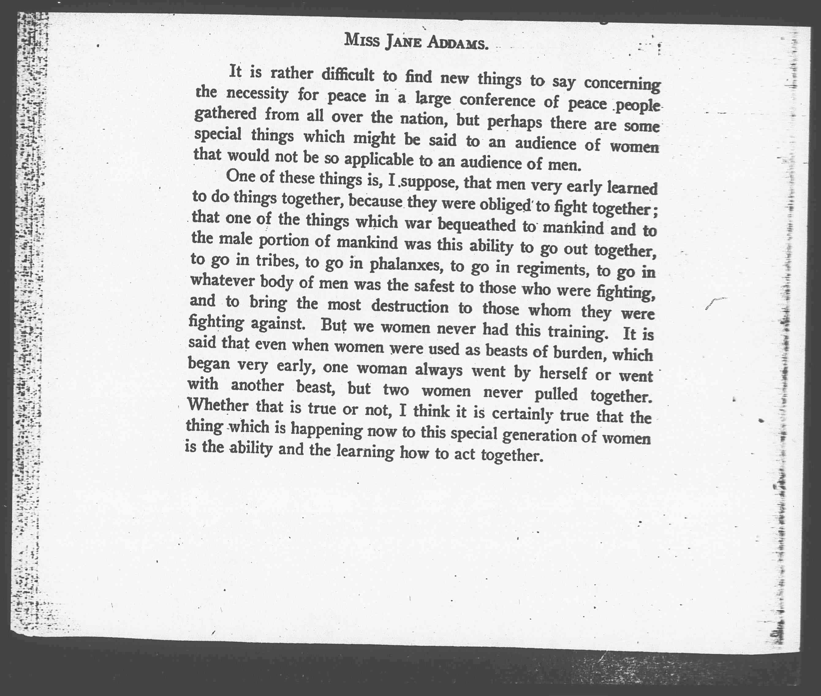One of these things is, I suppose, that men very early learned to do things together, because they were obliged to fight together; that one of the things which war bequeathed to mankind and to the male portion of mankind was this ability to go out together, to go in tribes, to go in phalanxes, to go in regiments, to go in whatever body of men was the safest to those who were fighting, and to bring the most destruction to those whom they were fighting against. But we women never had this training. It is said that even when women were used as beasts of burden, which began very early, one woman always went by herself or went with another beast, but two women never pulled together. Whether that is true or not, I think it is certainly true that the thing which is happening now to this special generation of women is the ability and the learning how to act together. [page 2]