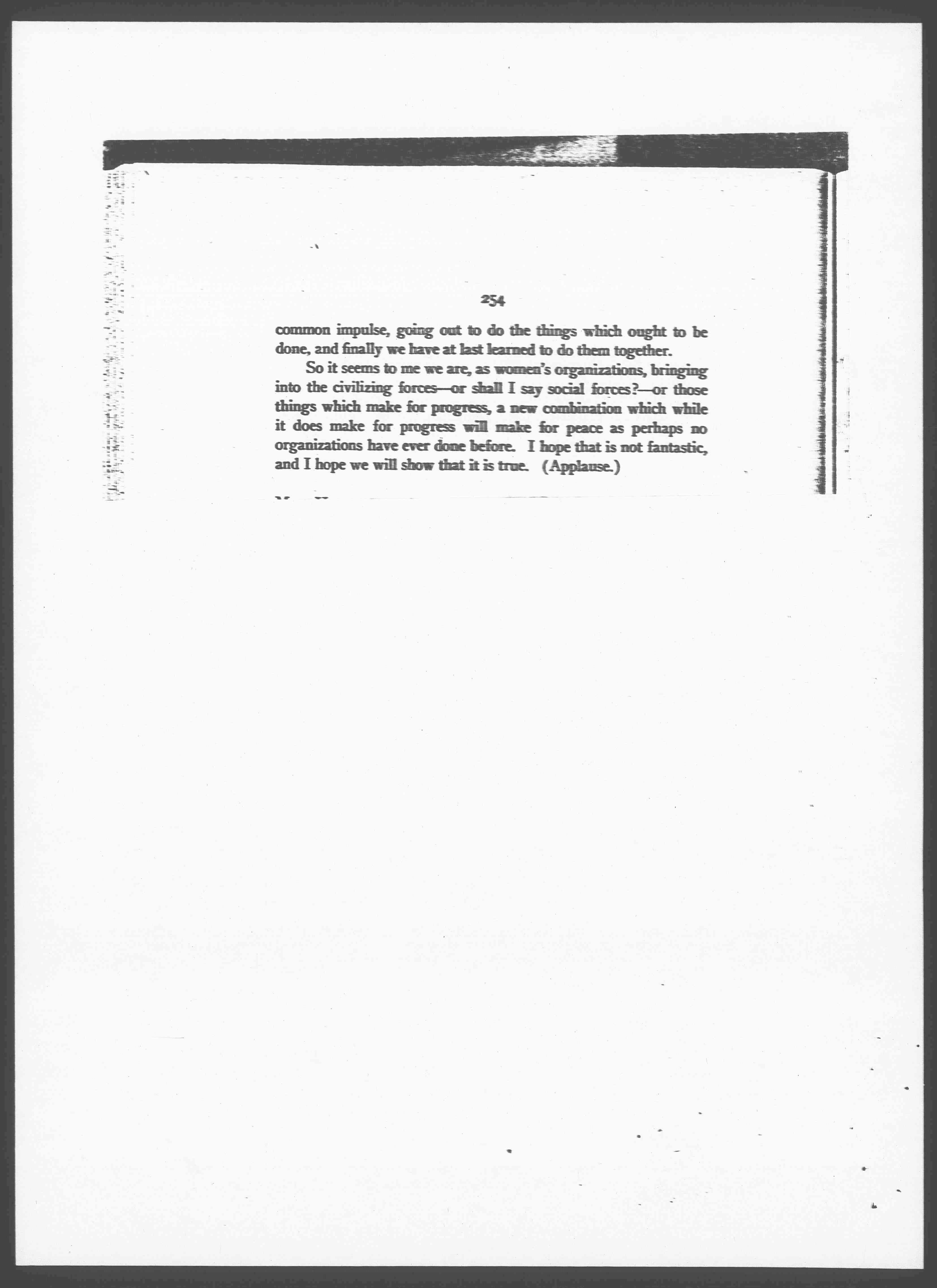So it seems to me we are, as women's organizations, bringing into the civilizing forces -- or shall I say social forces? -- or those things which make for progress, a new combination which while it does make for progress will make for peace as perhaps no organizations have ever done before. I hope that it is not fantastic, and I hope we will show that it is true. (Applause.)
