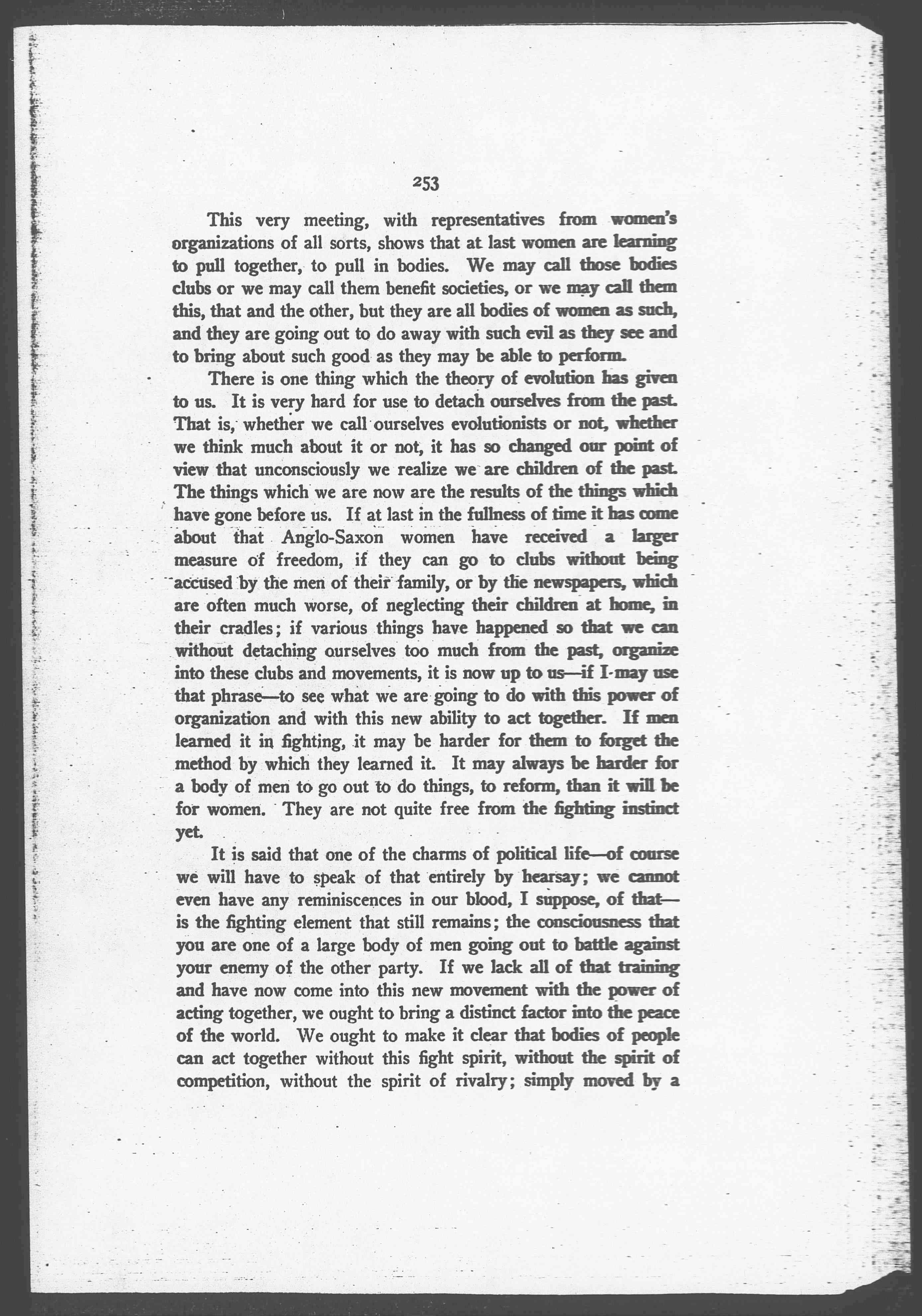 There is one thing which the theory of evolution has given to us. It is very hard for us to detach ourselves from the past. That is, whether we call ourselves evolutionists or not, whether we think much about it or not, it has so changed our point of view that unconsciously we realize we are children of the past. The things which we are now are the results of the things which have gone before us. If at last in the fullness of time it has come about that Anglo-Saxon women have received a larger measure of freedom, if they can go to clubs without being accused by the men of their family, or by the newspapers, which are often much worse, of neglecting their children at home, in their cradles; if various things have happened so that we can without detaching ourselves too much from the past, organize into these clubs and movements, it is now up to us -- if I may use that phrase -- to see what we are going to do with this power of organization and with this new ability to act together. If men learned it in fighting, it may be harder for them to forget the method by which they learned it. It may always be harder for a body of men to go out to do things, to reform, than it will be for women. They are not quite free from the fighting instinct yet.
