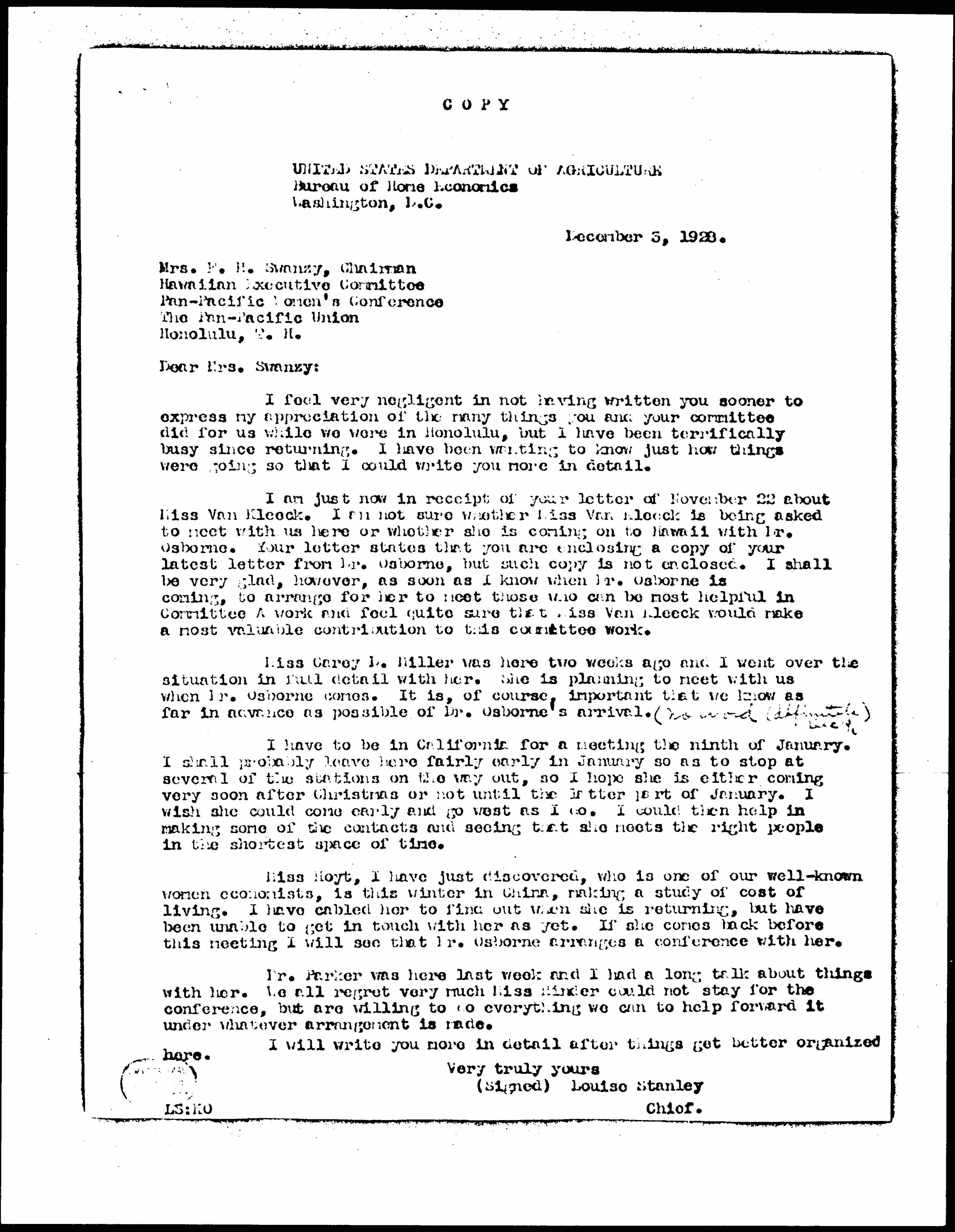 Louise Stanley to Julie Judd Swanzy, December 3, 1928