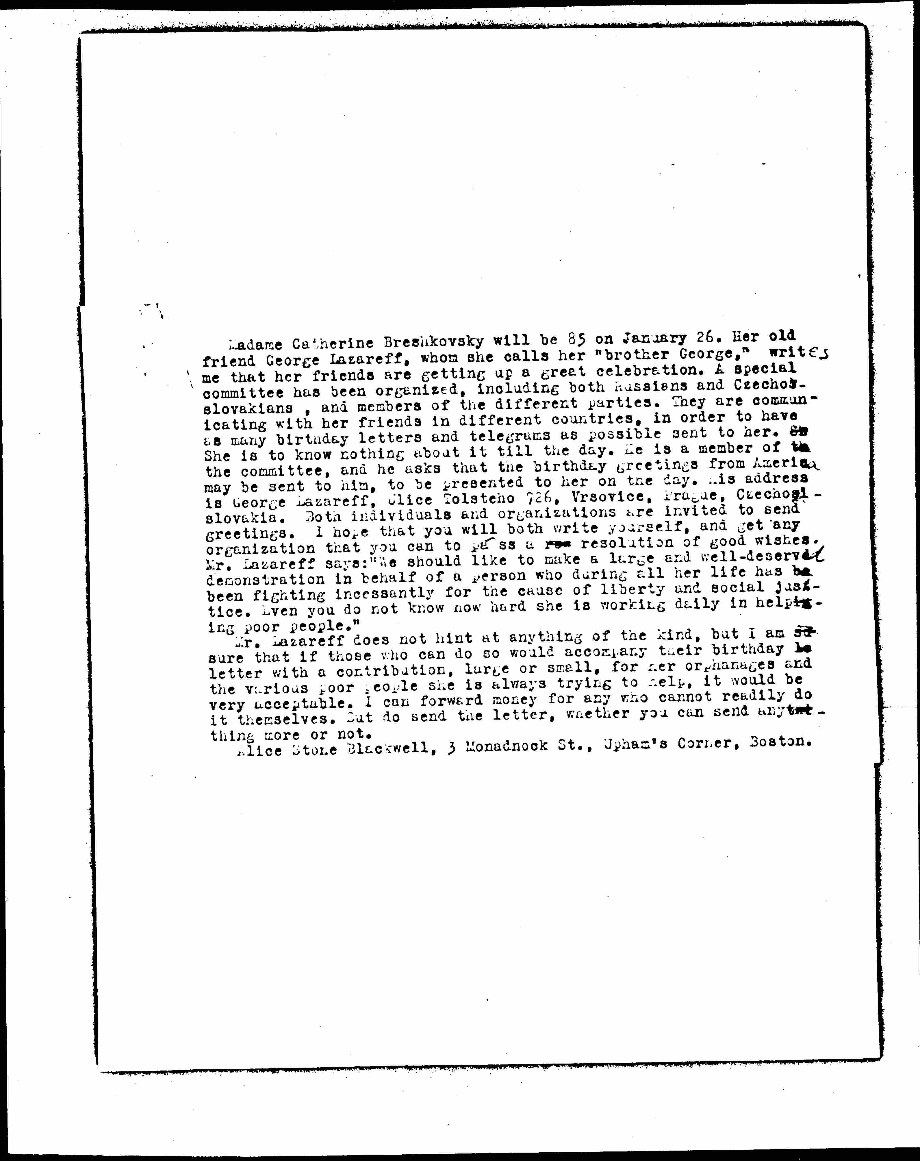 Catherine Breshkovsky Birthday Party Announcement, ca. December, 1928