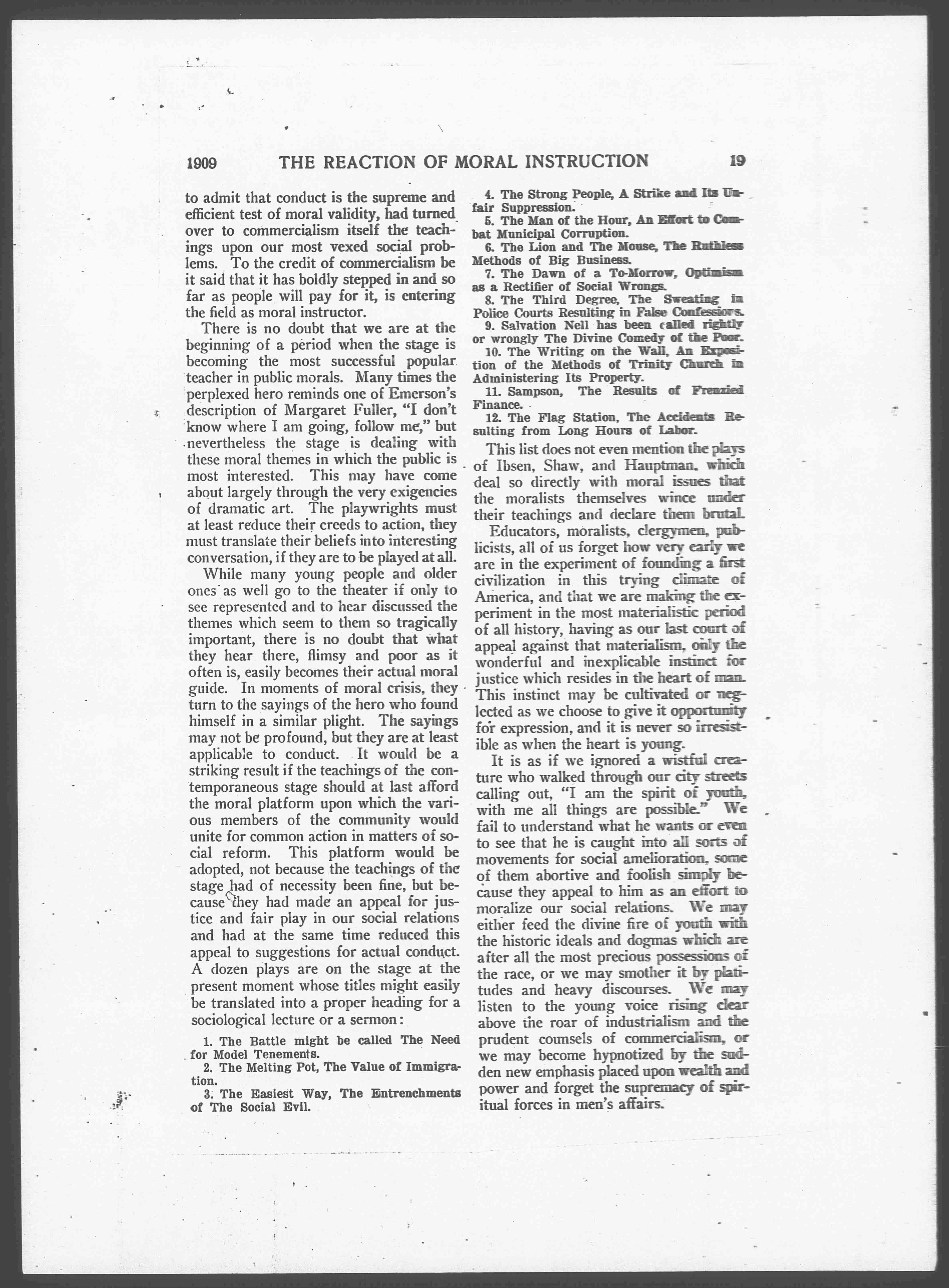 It seems sometimes as if the church and the school, because they are so reluctant [page 3] to admit that conduct is the supreme and efficient test of moral validity, had turned over to commercialism itself the teachings upon our most vexed social problems. To the credit of commercialism be it said that it has boldly stepped in and so far as people will pay for it, is entering the field as moral instructor.