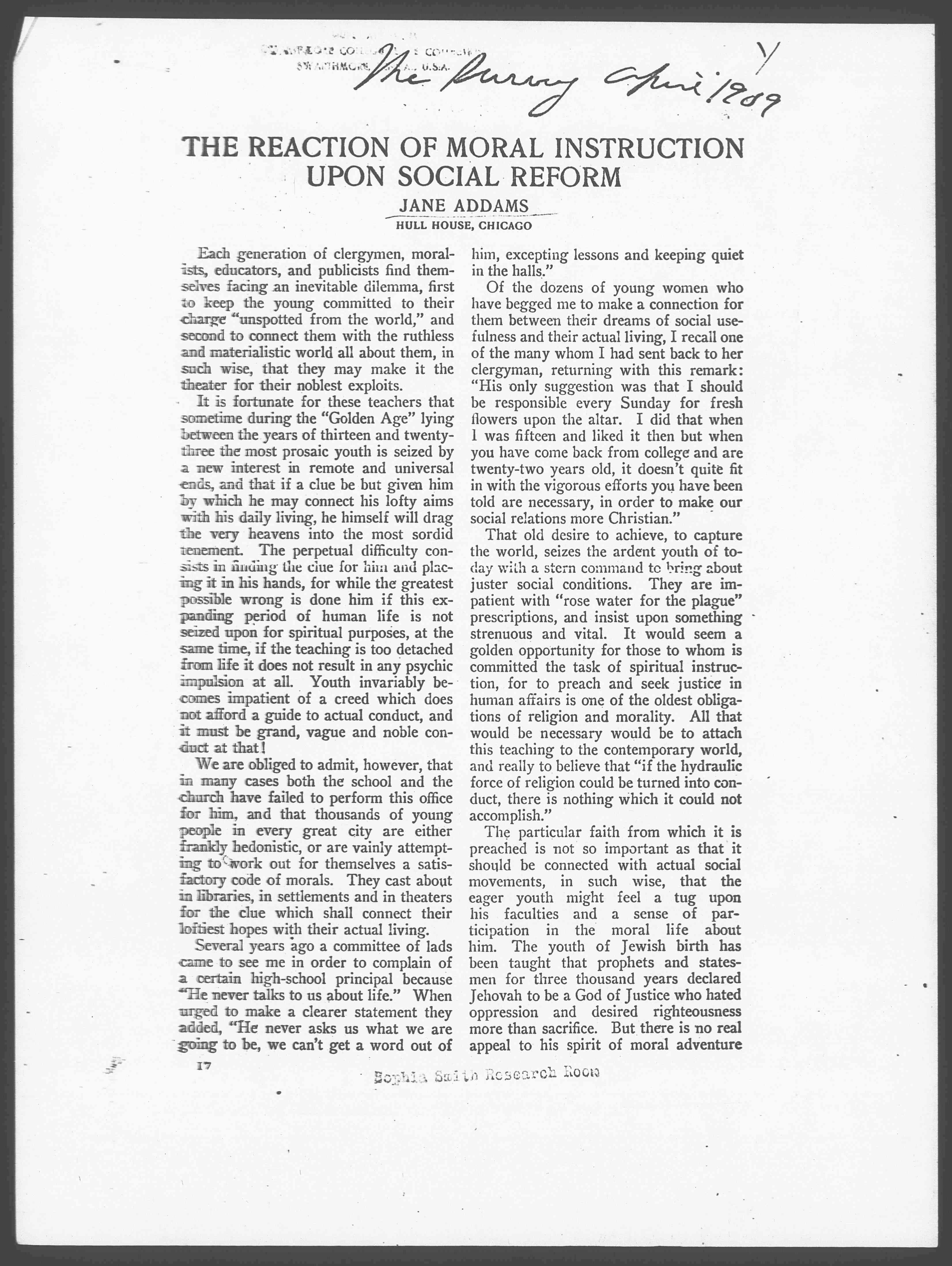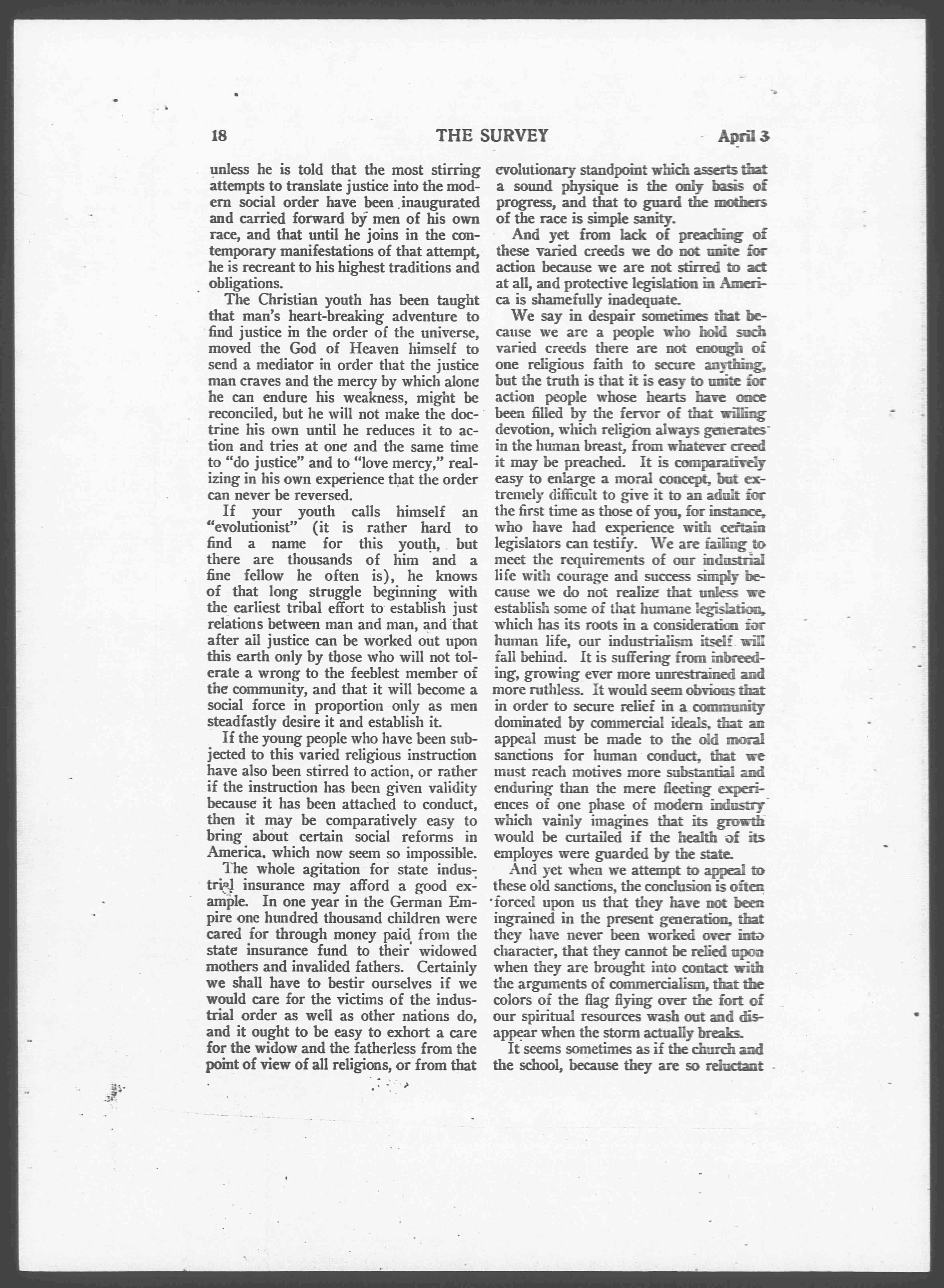 The particular faith from which it is preached is not so important as that it should be connected with actual social movements, in such wise, that the eager youth might feel a tug upon his faculties and a sense of participation in the moral life about him. The youth of Jewish birth has been taught that prophets and statesmen for three thousand years declared Jehovah to be a God of Justice who hated oppression and desired righteousness more than sacrifice. But there is no real appeal to his spirit of moral adventure [page 2] unless he is told that the most stirring attempts to translate justice into the modern social order have been inaugurated and carried forward by men of his own race, and that until he joins in the contemporary manifestations of that attempt, he is recreant to his highest traditions and obligations.