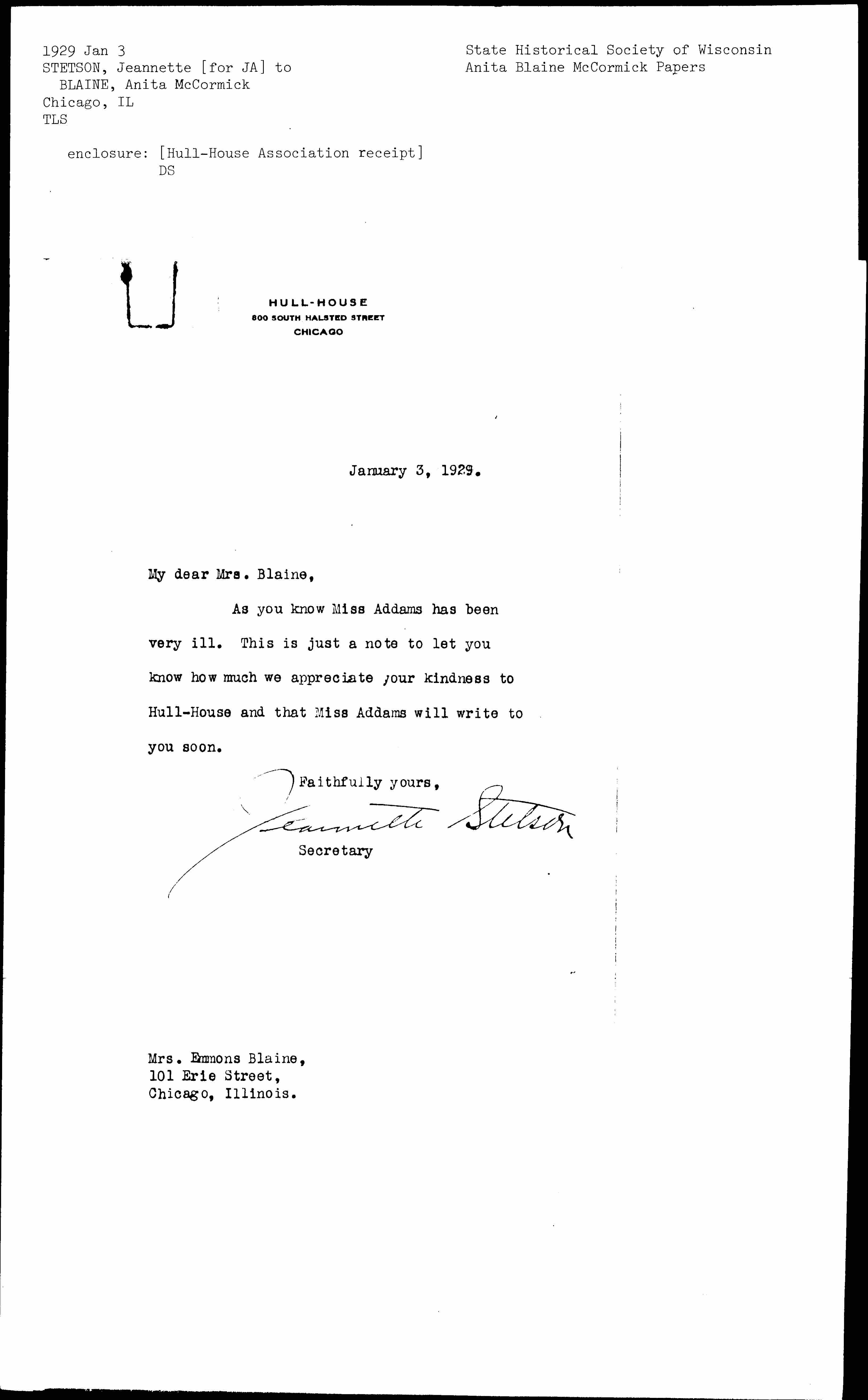 Jeannette Flitcraft Stetson to Anita McCormick Blaine, January 3, 1929