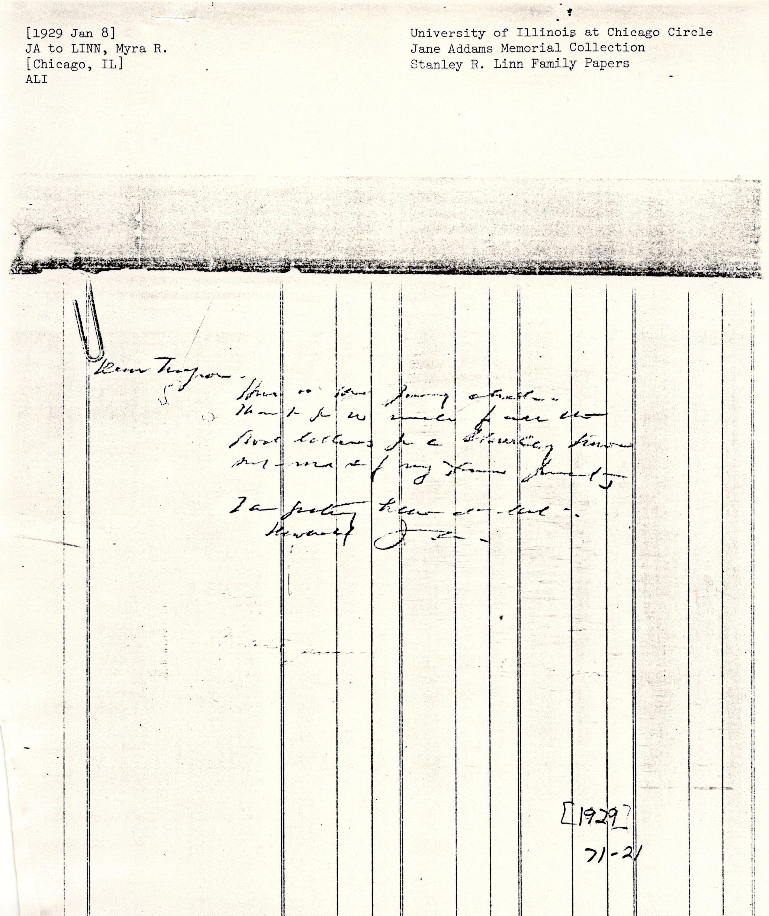 Jane Addams to Myra Harriet Reynolds Linn, January 8, 1929