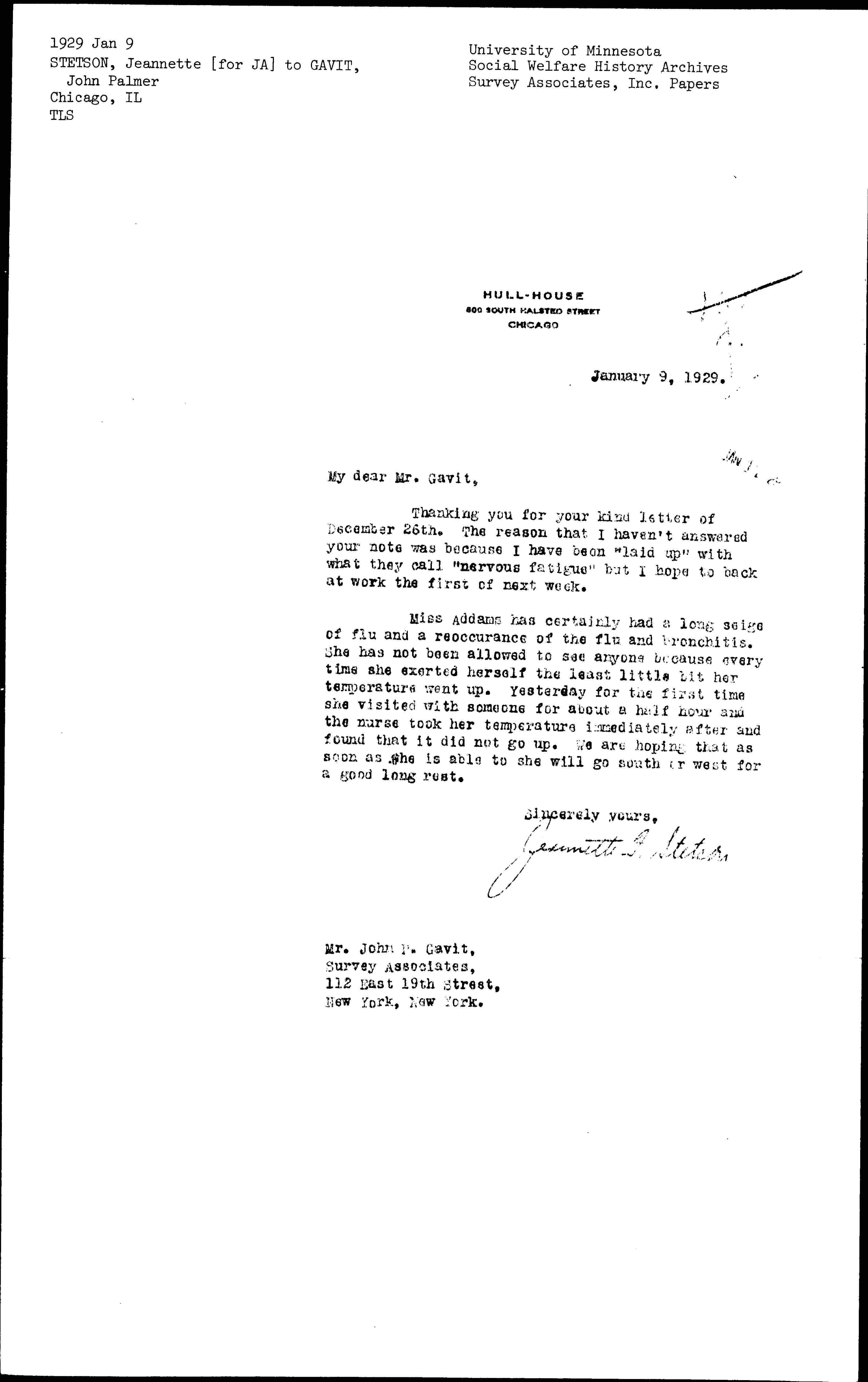 Jeannette Flitcraft Stetson to John Palmer Gavit, January 9, 1929