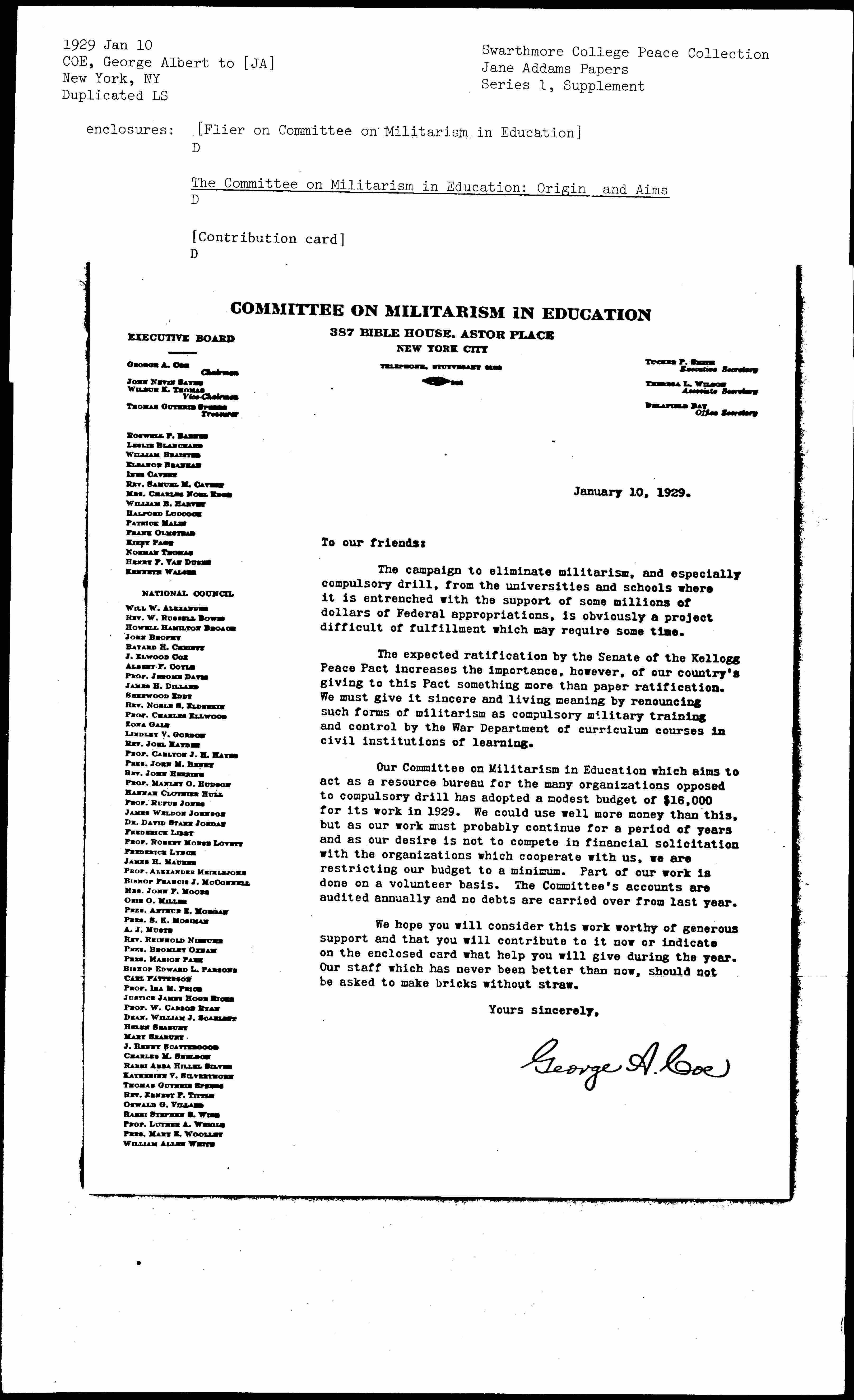 The Committee on Militarism in Education: Origin and Aims, ca. January, 1929