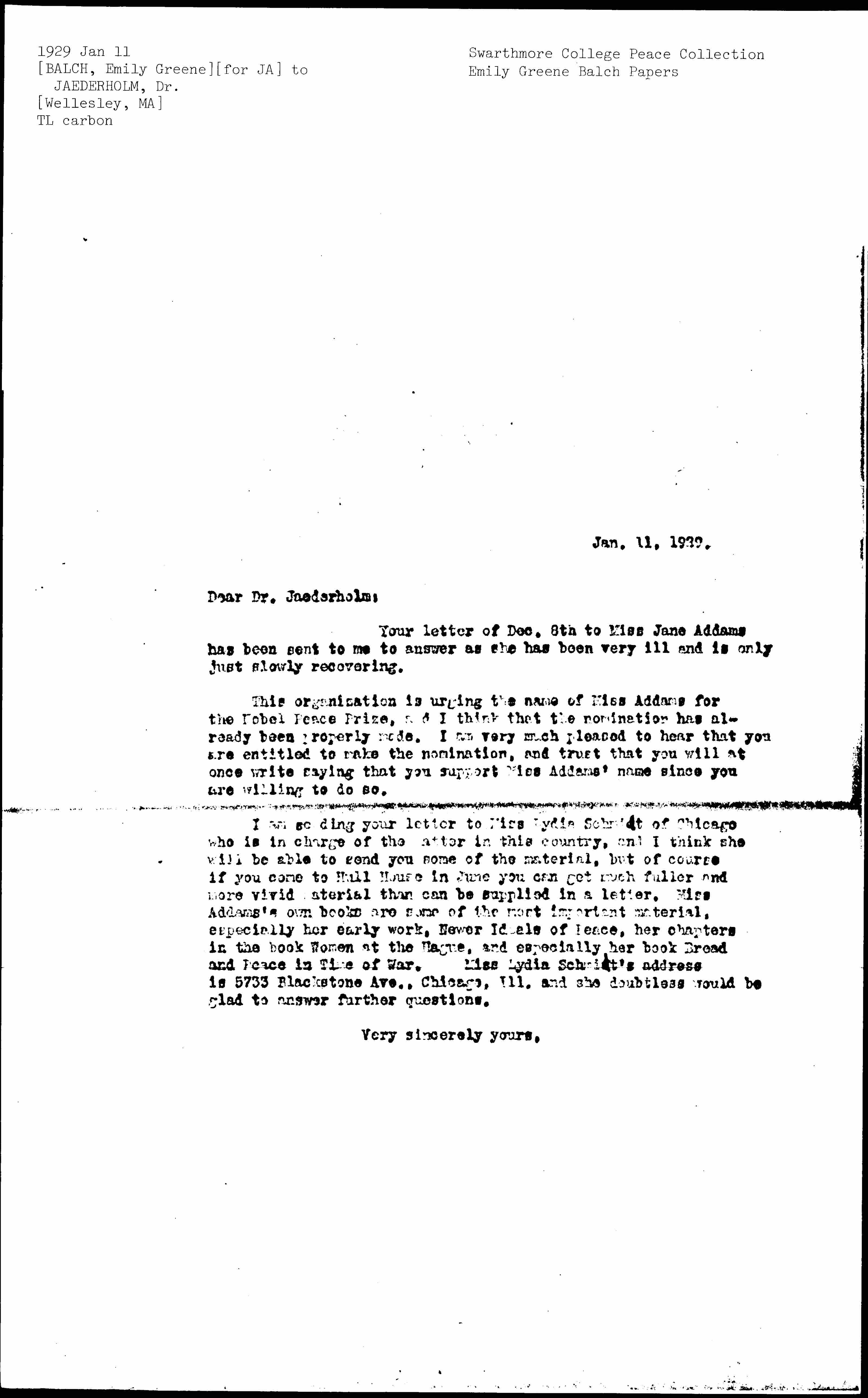Emily Greene Balch to Gustaf Axel Jäederholm, January 11, 1929