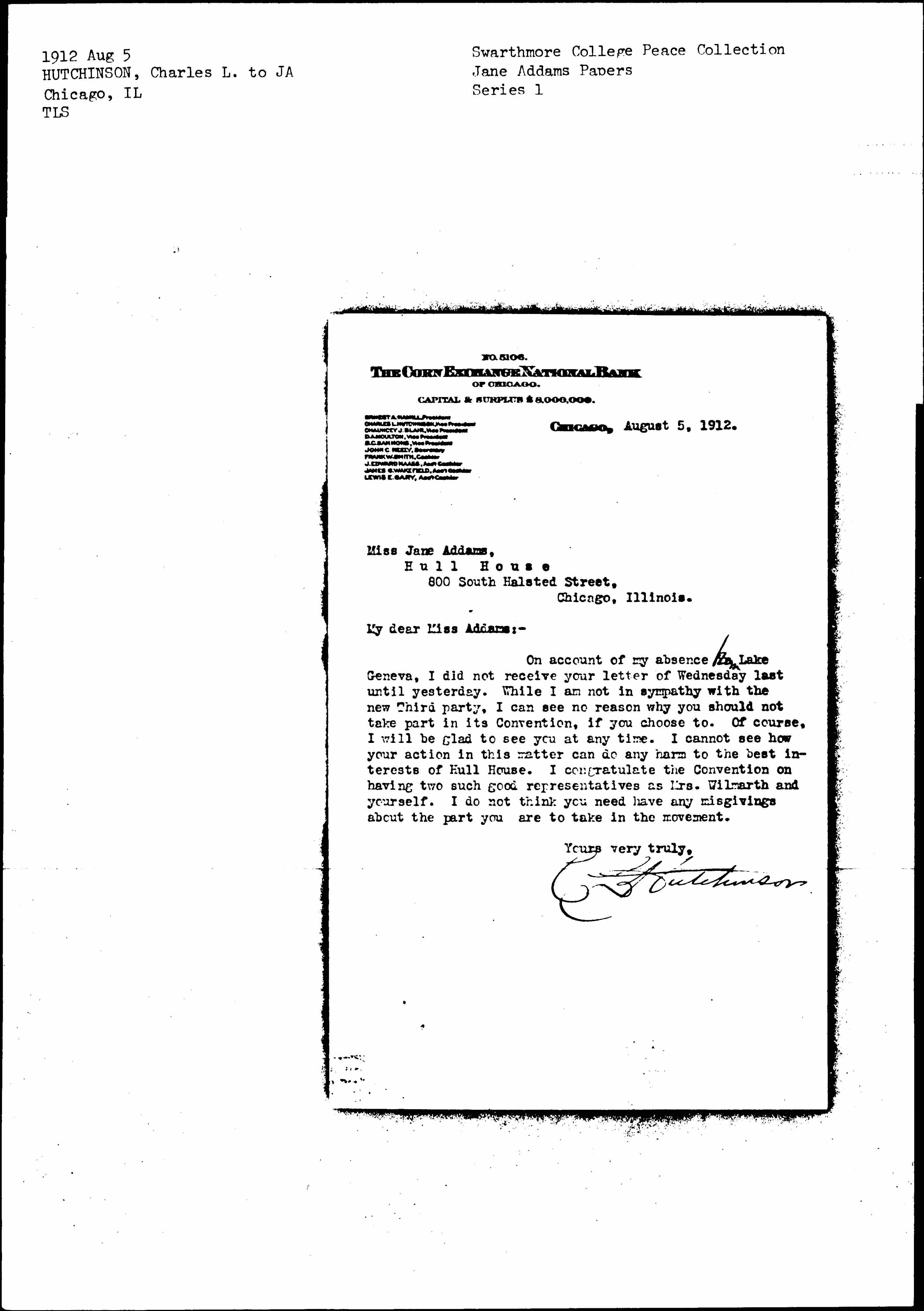 On account of my absence <from> Lake Geneva, I did not receive your letter of Wednesday last until yesterday. While I am not in sympathy with the new Third party, I can see no reason why you should not take part in its Convention, if you choose to. Of course, I will be glad to see you at any time. I cannot see how your action in this manner can do any harm to the best interests of Hull House. I congratulate the Convention on having two such good representatives as Mrs. Wilmarth and yourself. I do not think you need have any misgivings about the part you are to take in the movement.