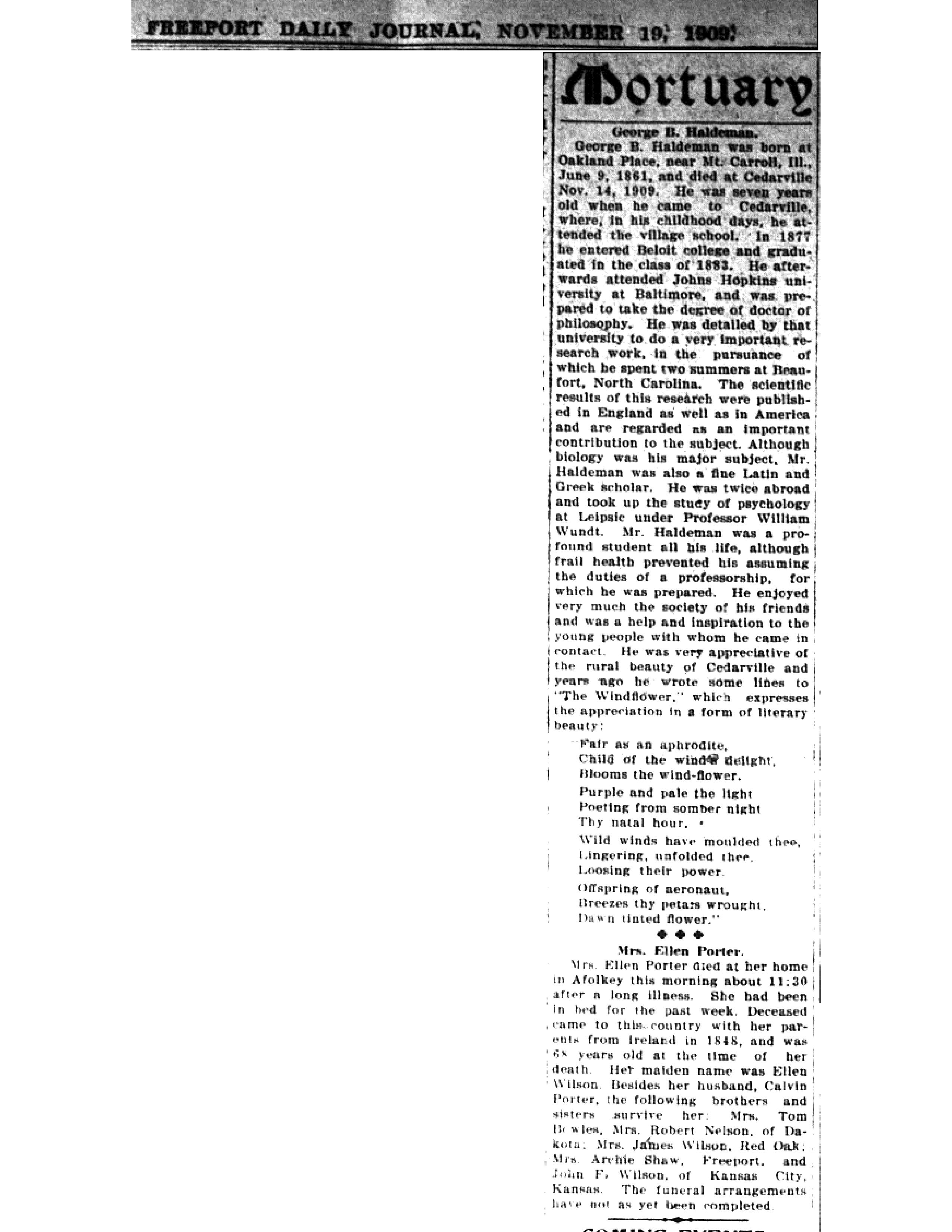George B. Haldeman was born at Oakland Place, near Mt. Carroll, Ill., June 9, 1861, and died at Cedarville Nov. 14, 1909. He was seven years old when he came to Cedarville, where, in his childhood days, he attended the village school. In 1877 he entered Beloit college and graduated in the class of 1883. He afterwards attended John Hopkins university at Baltimore, and was prepared to take the degree of doctor of philosophy. He was detailed by that university to do a very important research work, in the pursuance of which he spent two summers at Beaufort, North Carolina. The scientific results of this research were published in England as well as in America and are regarded as an important contribution to the subject. Although biology was his major subject, Mr. Haldeman was also a fine Latin and Greek scholar. He was twice abroad and took up the study of psychology at [Leipzig] under Professor William Wundt. Mr. Haldeman was a profound student all his life, although frail health prevented his assuming the duties of a professorship, for which he was prepared. He enjoyed very much the society of his friends and was a help and inspiration to the young people with whom he came into contact. He was very appreciative of the rural beauty of Cedarville and years ago he wrote some lines to "The Wildflower," which expresses the appreciation in a form of literary beauty:
