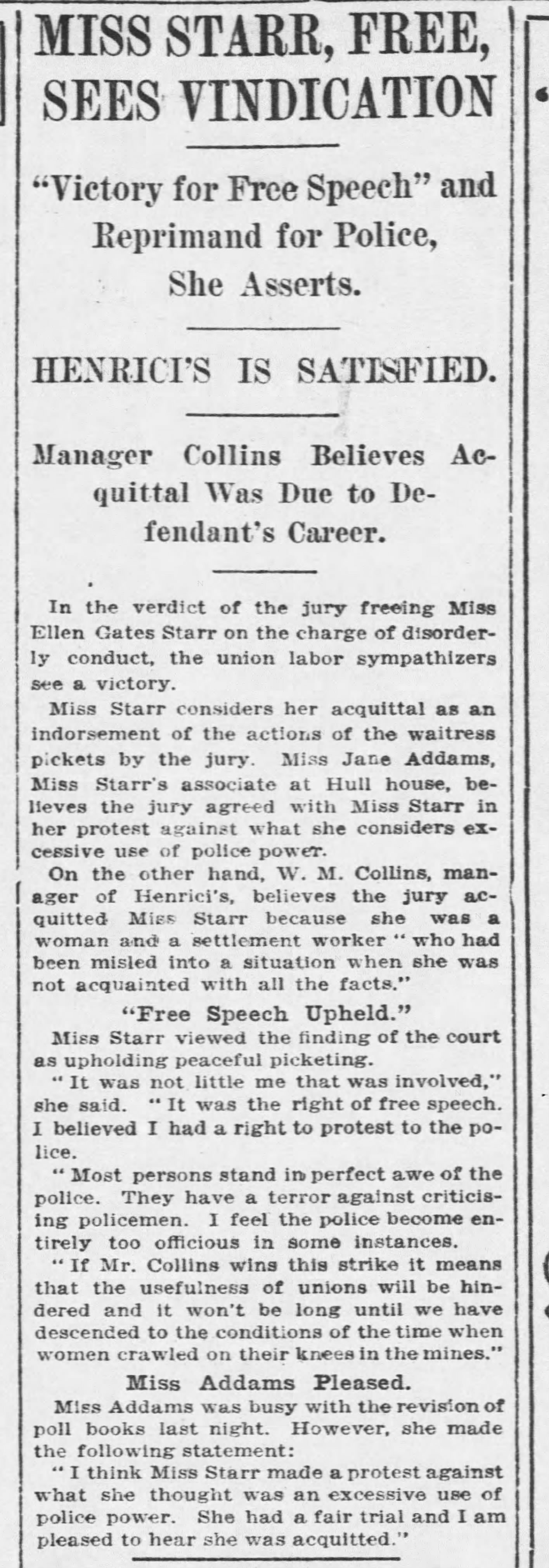 Statement on Acquittal of Ellen Gates Starr, March 21, 1914
