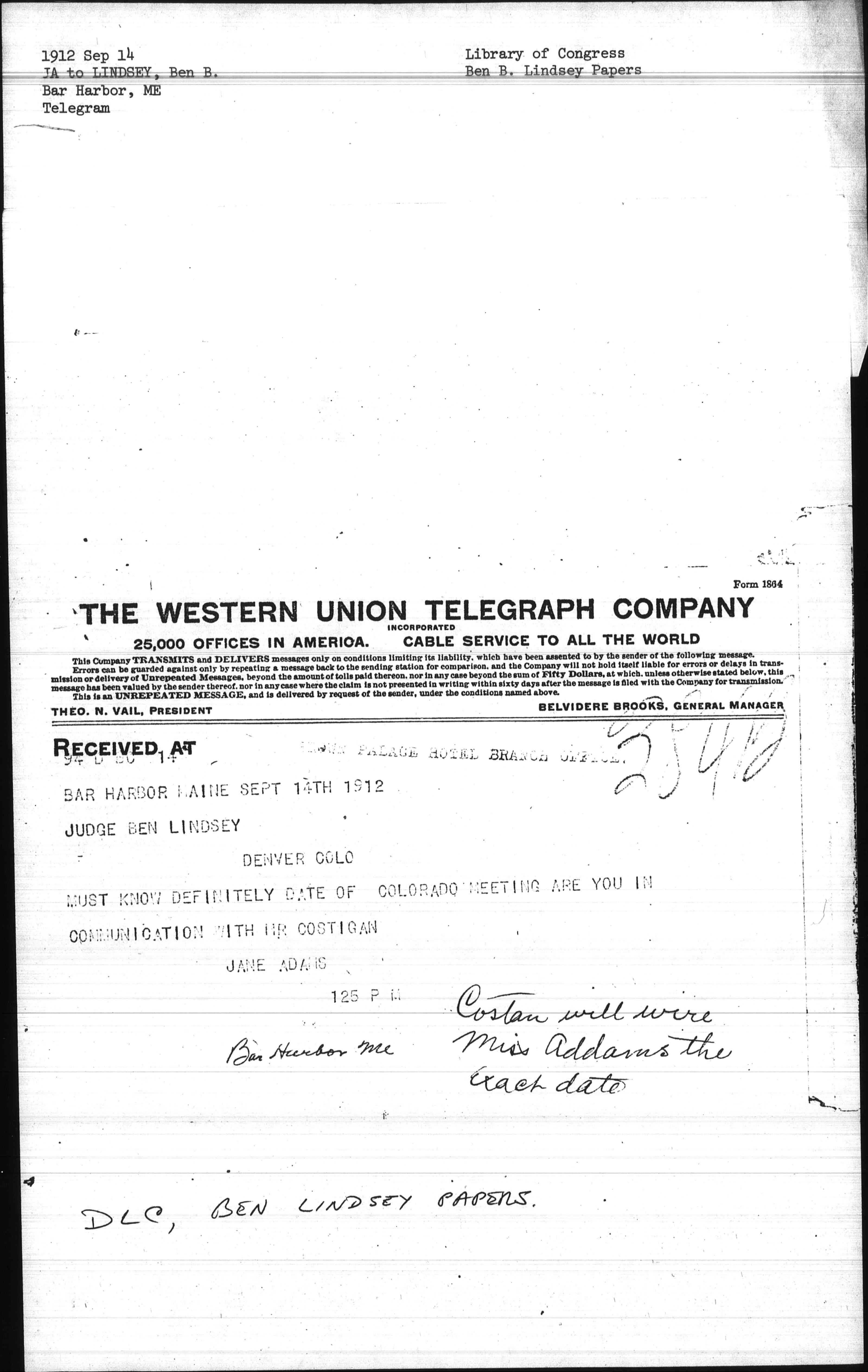 RECEIVED AT BROWN PALACE HOTEL BRANCH OFFICE. [stamped]
