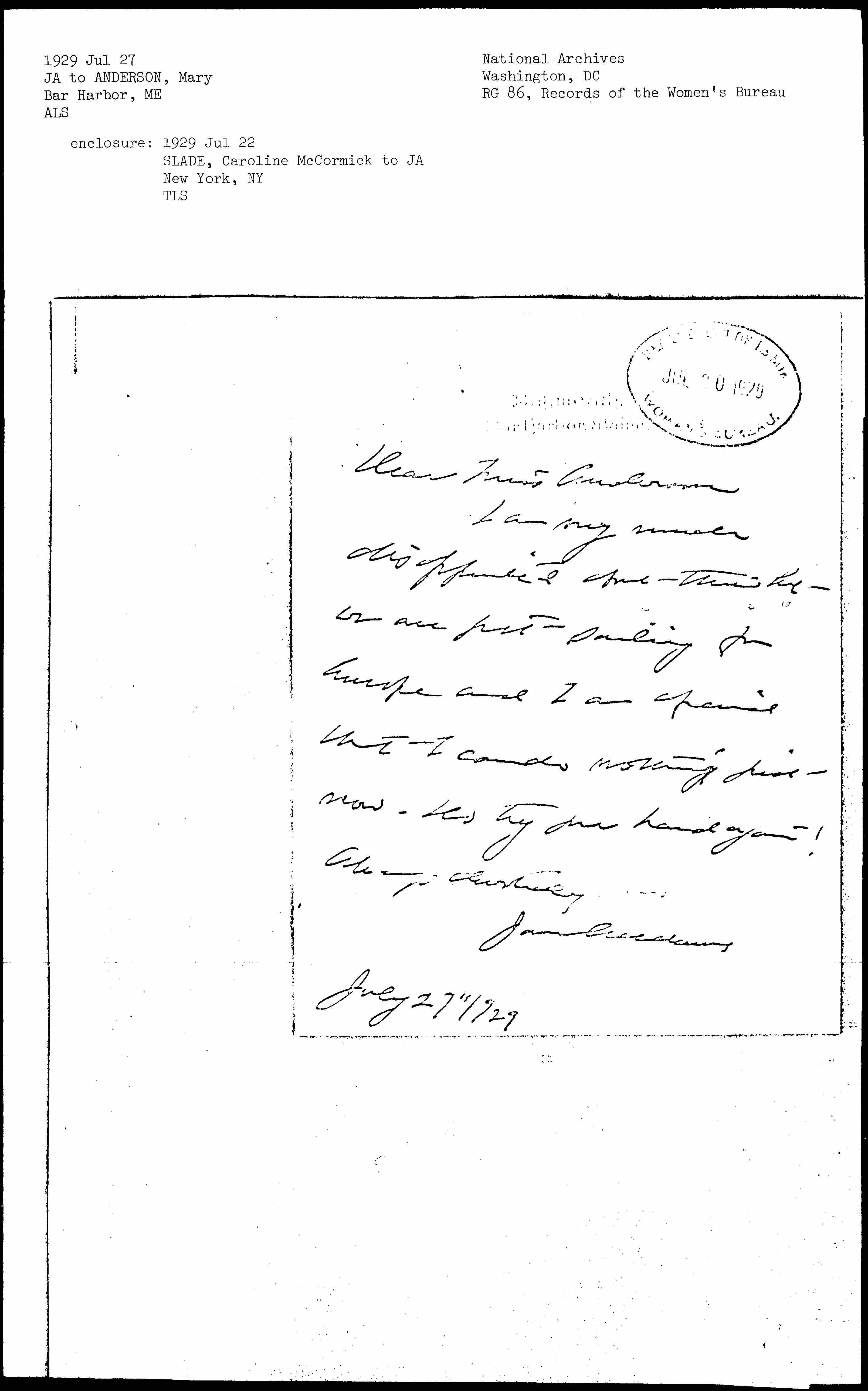 Caroline McCormick Slade to Jane Addams, July 22, 1929