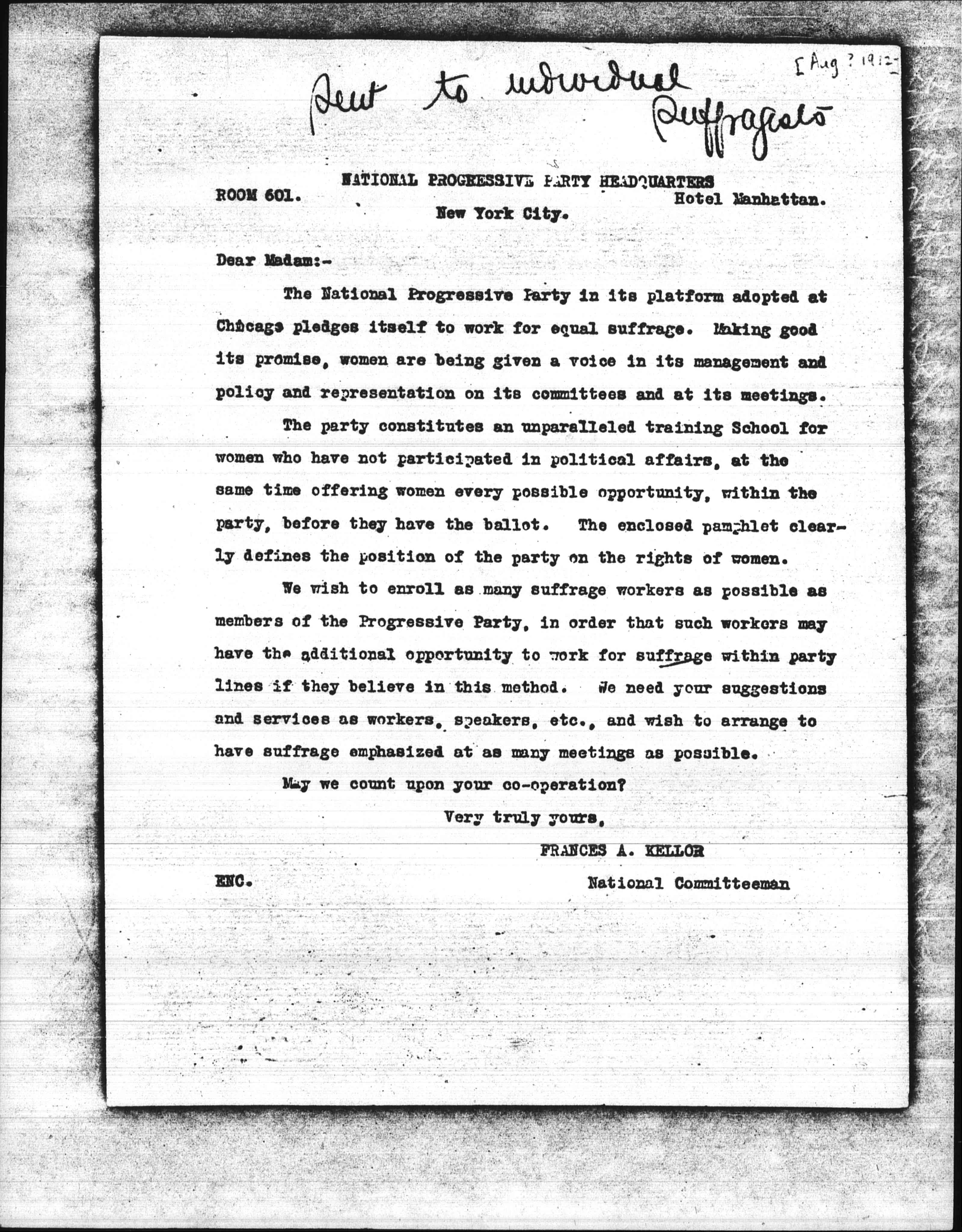 We wish to enroll as many suffrage workers as possible as members of the Progressive Party, in order that such workers may have the additional opportunity to work for suffrage within party lines if they believe in this method. We need your suggestions and services as workers, speakers, etc., and wish to arrange to have suffrage emphasized at as many meetings as possible.