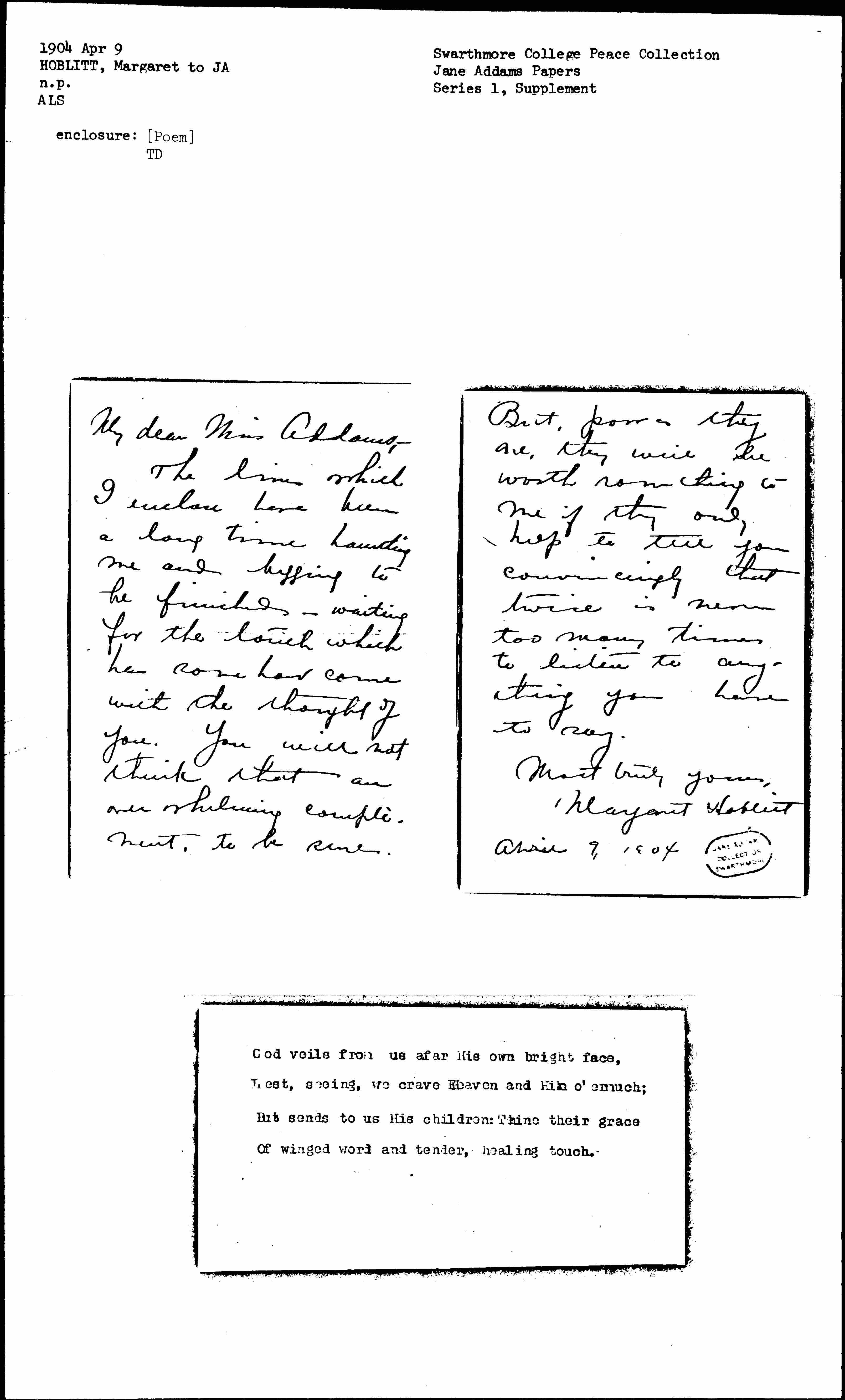The lines which I include have been a long time haunting me and begging to be finished--waiting for the touch which has somehow come with the thought of you. You will not think that an overwhelming compliment, to be sure. [page 2] But, poor as they are, they will be worth something to me if they only help to tell you convincingly that twice is none too many times to listen to anything you have to say.