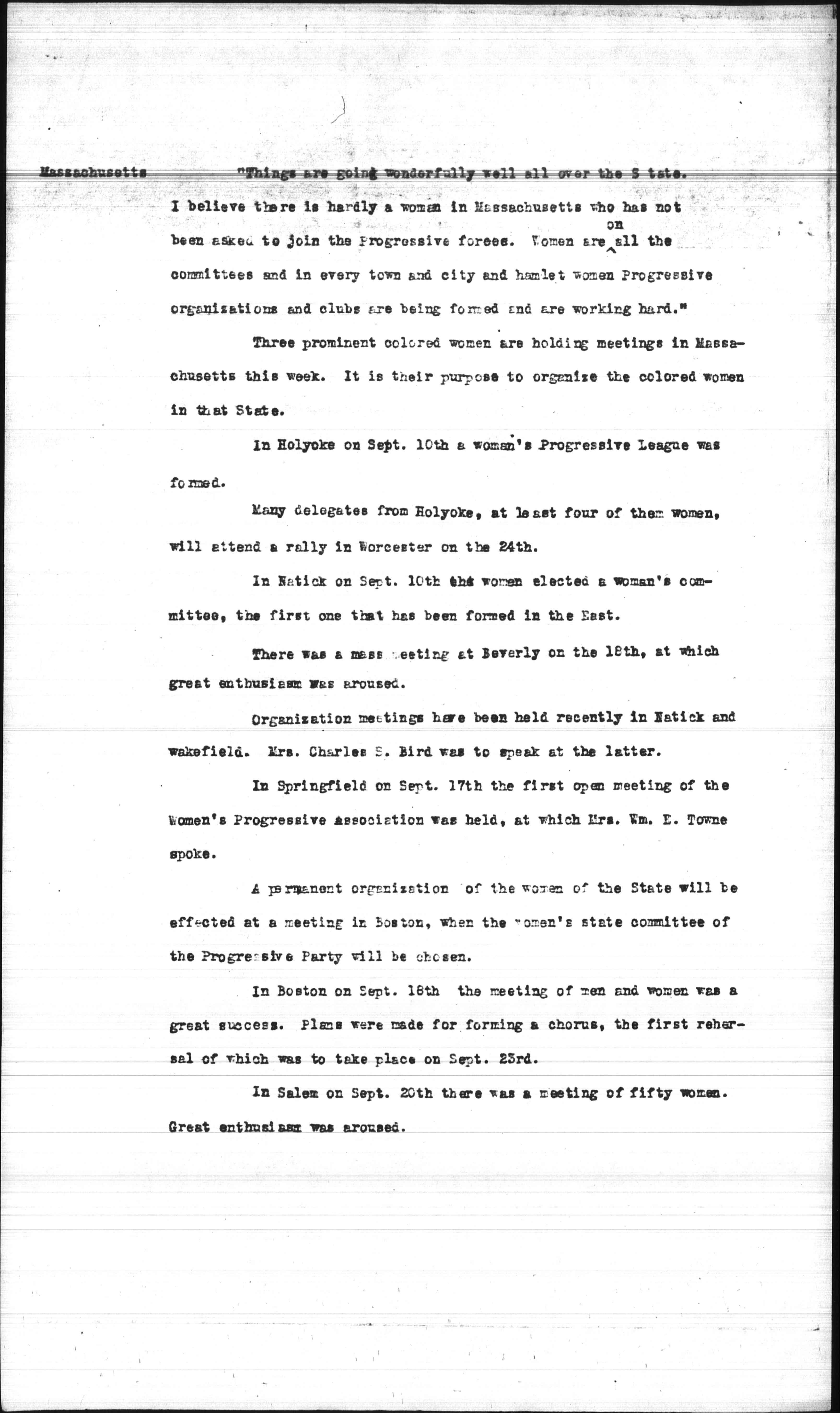 "Things are going wonderfully well all over the State. I believe there is hardly a woman in Massachusetts who has not been asked to join the Progressive forces. Women are <on> all the committees and in every town and city and hamlet women Progressive organizations and clubs are being formed and are working hard."