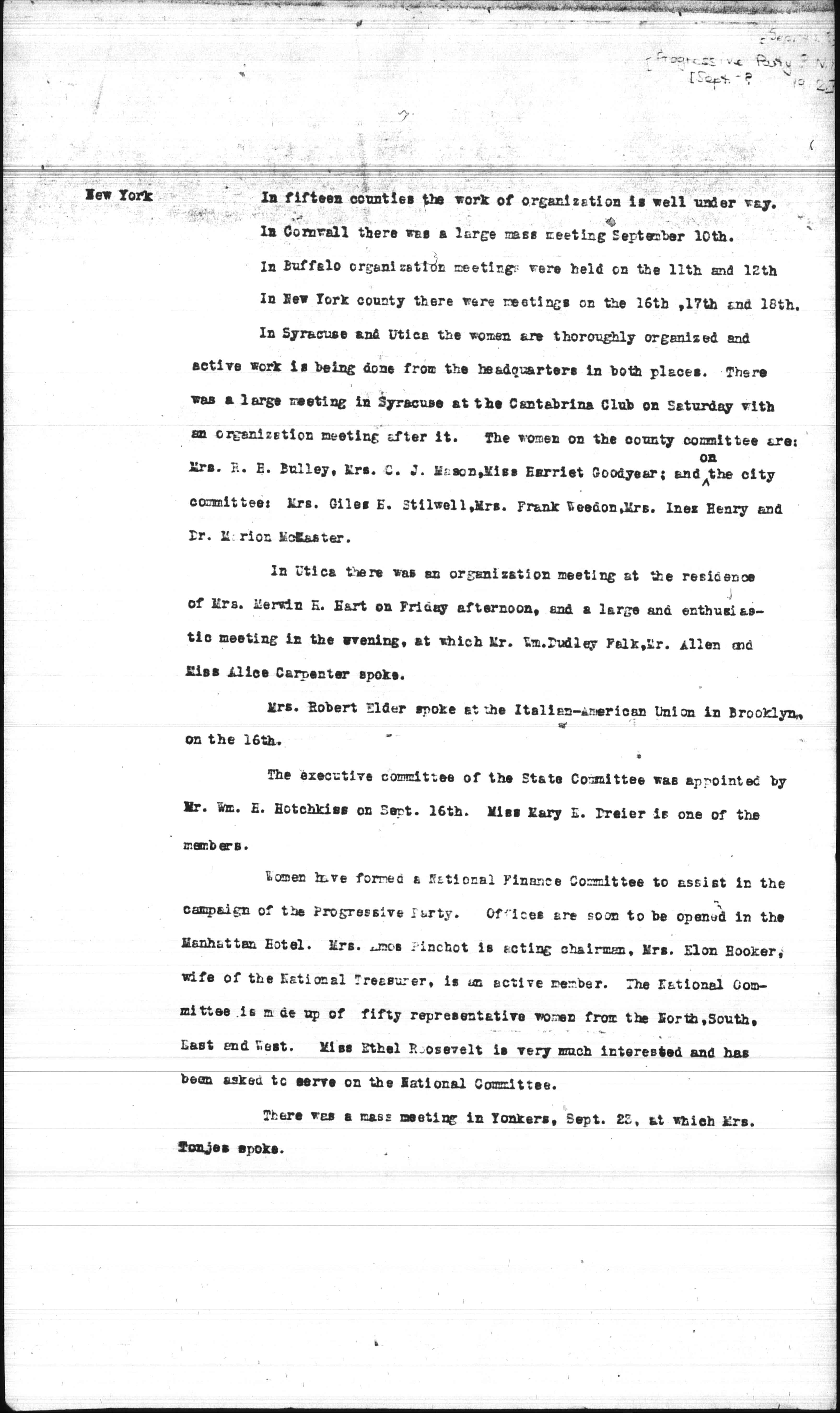 In fifteen counties the work of organization is well under way. In Cornwall there was a large mass meeting September 10th. In Buffalo organization meetings were held on the 11th and 12th. In New York county there were meetings on the 16th, 17th, and 18th. In Syracuse and Utica the women are thoroughly organized and active work is being done from the headquarters in both places. There was a large meeting in Syracuse at the Cantabrina Club on Saturday with an organization meeting after it. The women on the county committee are: Mrs. R. H. Bulley, Mrs. C. J. Mason, Miss Harriet Goodyear; and <on> the city committee: Mrs. Giles E. Stilwell, Mrs. Frank Weedon, Mrs. [Innes] Henry and Dr. Marion [McMaster].