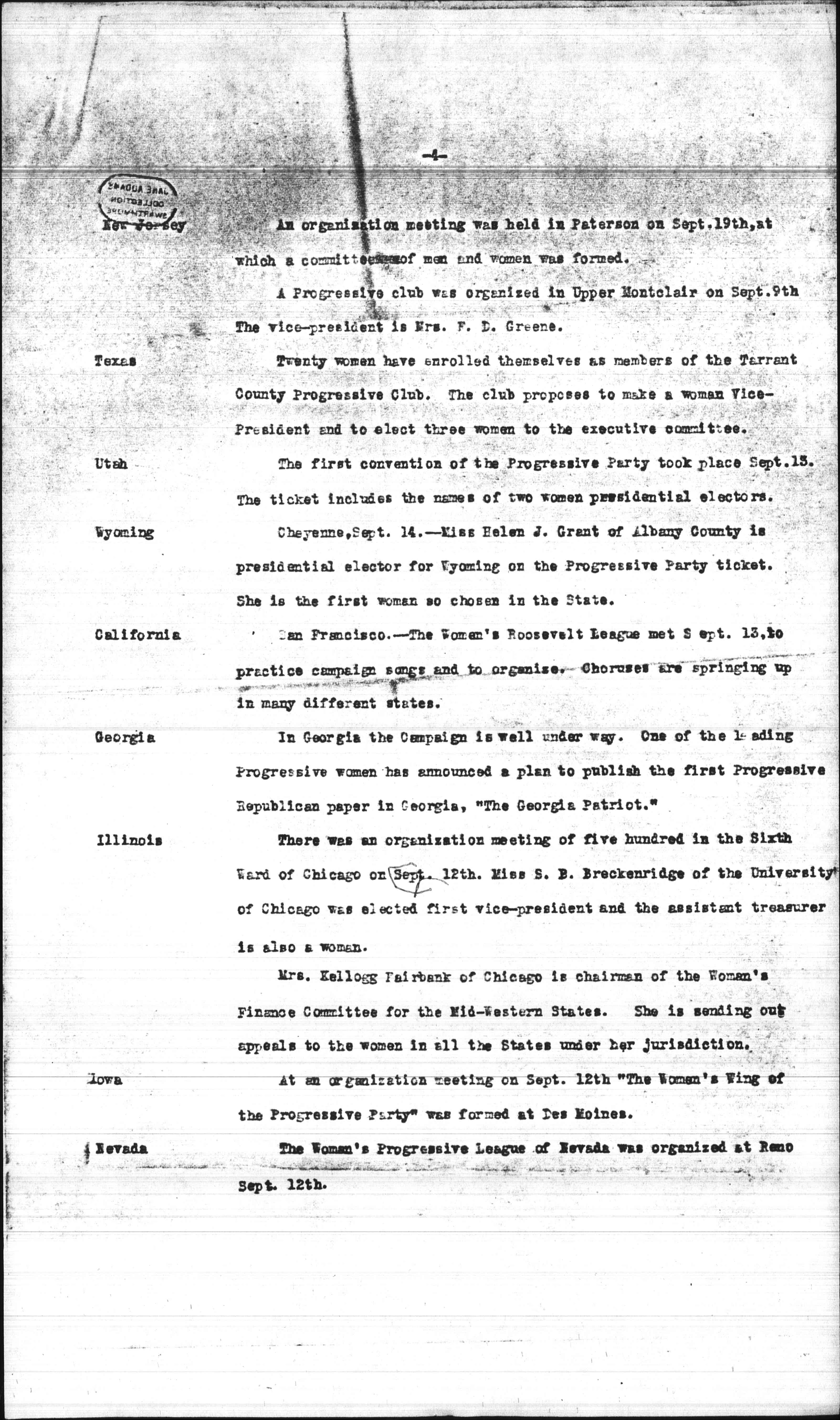 A Progressive club was organized in Upper Montclair on Sept. 9th. The vice-president is Mrs. F.D. Greene.