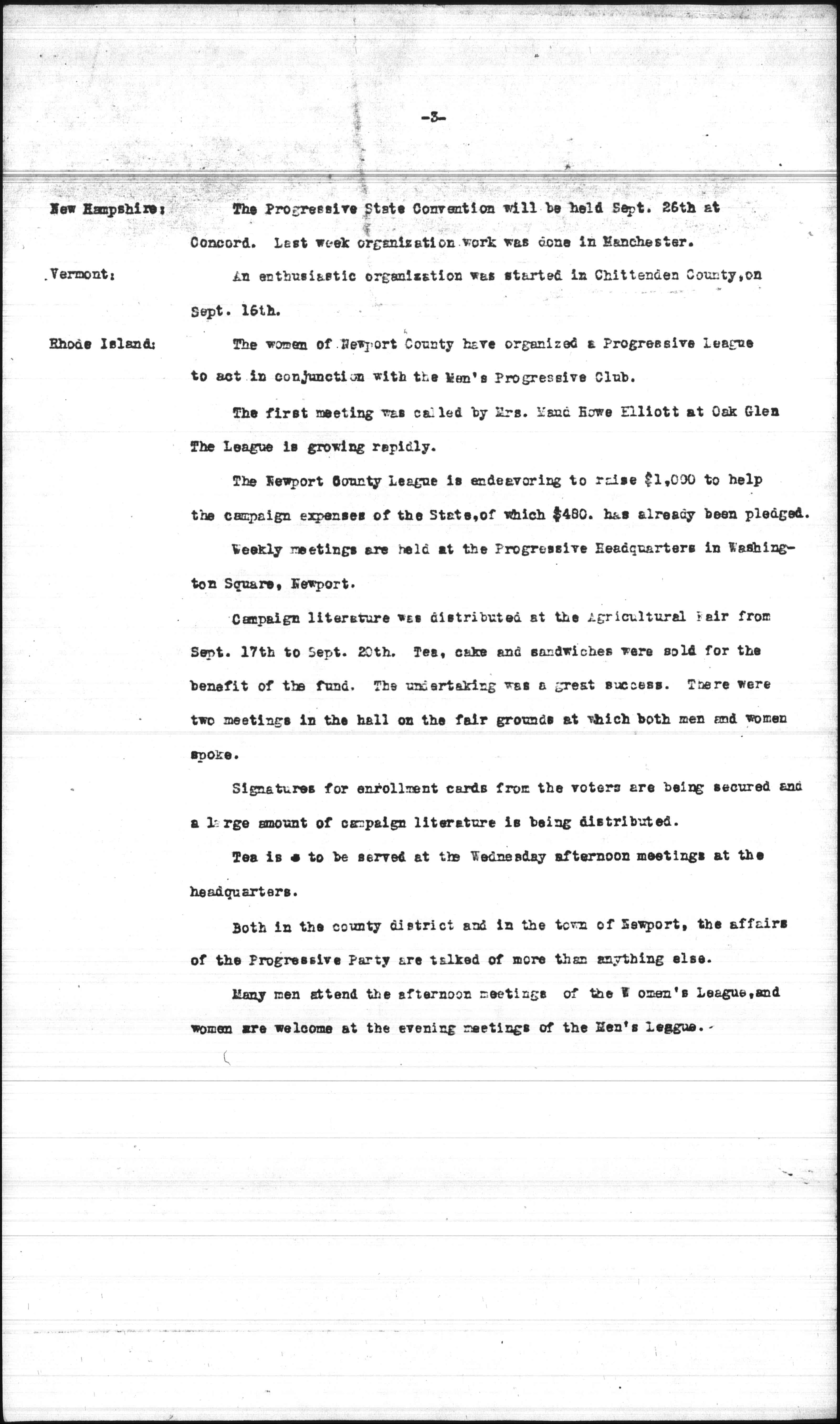 The Newport County League is endeavoring to raise $1,000 to help the campaign expenses of the State, of which $480, has already been pledged.