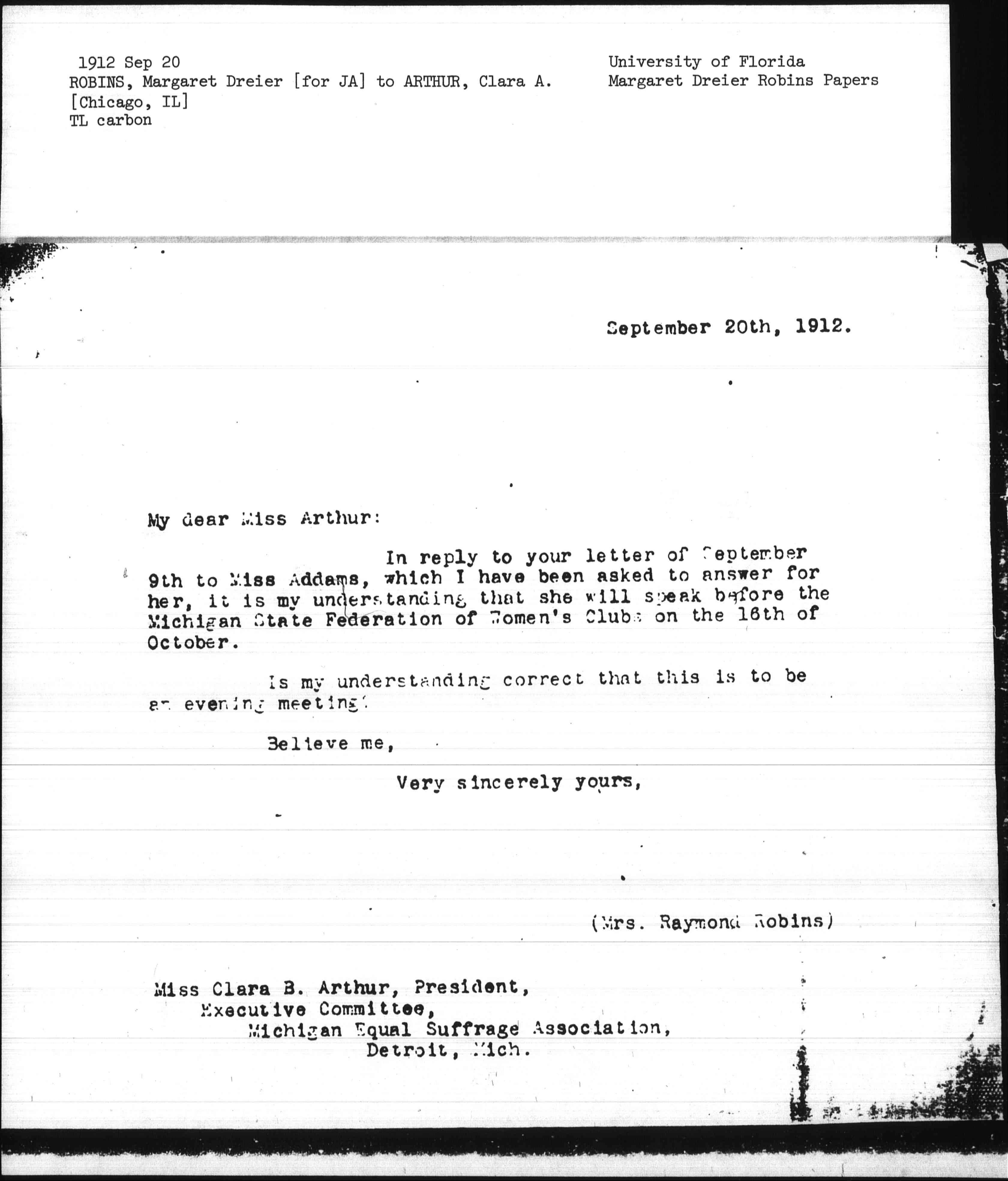 In reply to your letter of September 9th to Miss Addams, which I have been asked to answer for her, it is my understanding that she will speak before the Michigan State Federation of Women's Clubs on the 16th of October.