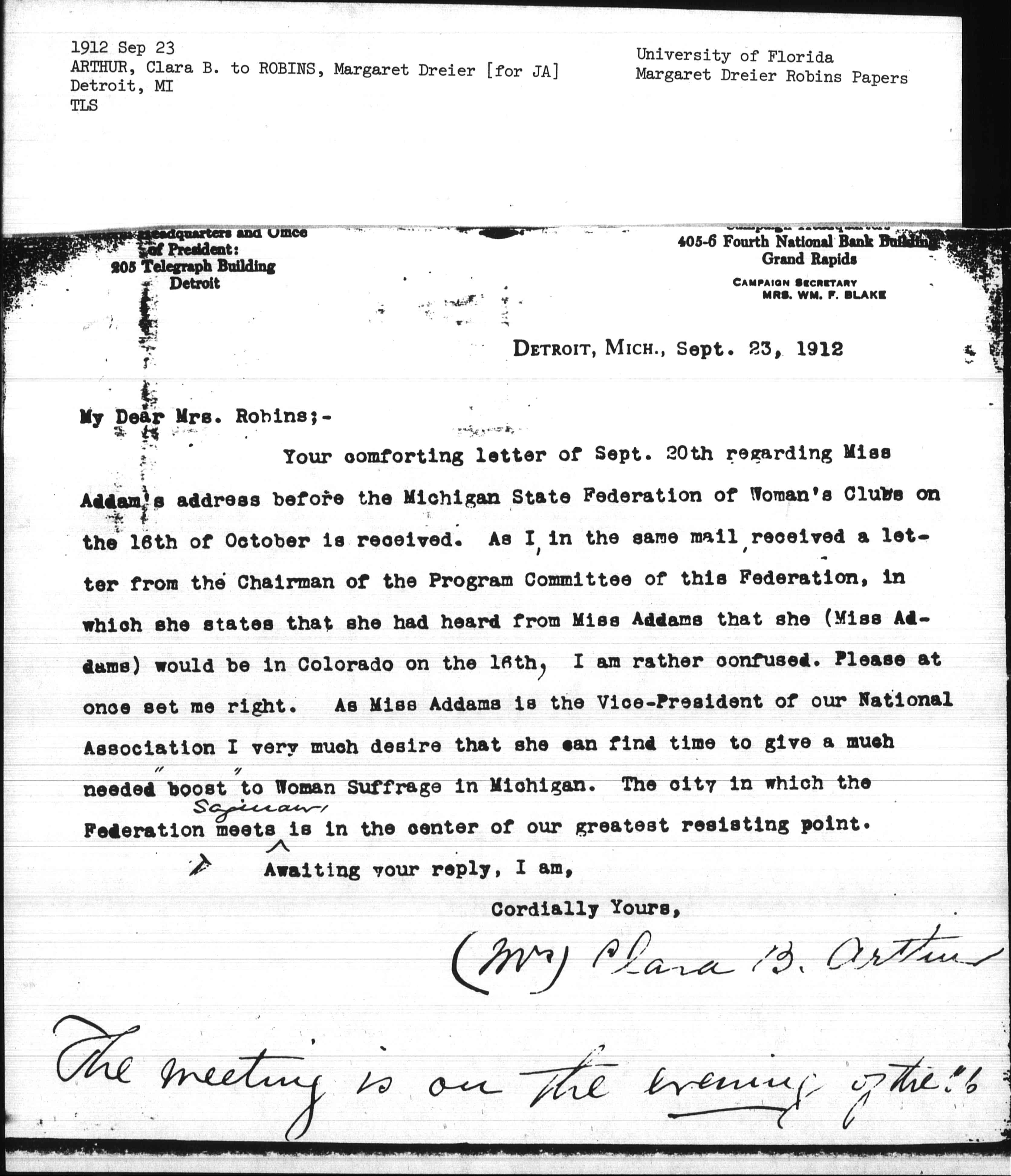 Your comforting letter of Sept. 20th regarding Miss Addams' address before the Michigan State Federation of Women's Clubs on the 16th of October is received. As I in the same mail received a letter from the Chairman of the Program Committee of the Federation, in which she states that she had heard from Miss Addams that she (Miss Addams) would be in Colorado on the 16th. I am rather confused. Please at once set me right. As Miss Addams is the Vice-President of our National Association I very much desire that she can find time to give a much needed "boost" to Woman Suffrage in Michigan. The city in which the Federation meets <Saginaw> is in the center of our greatest resisting point.