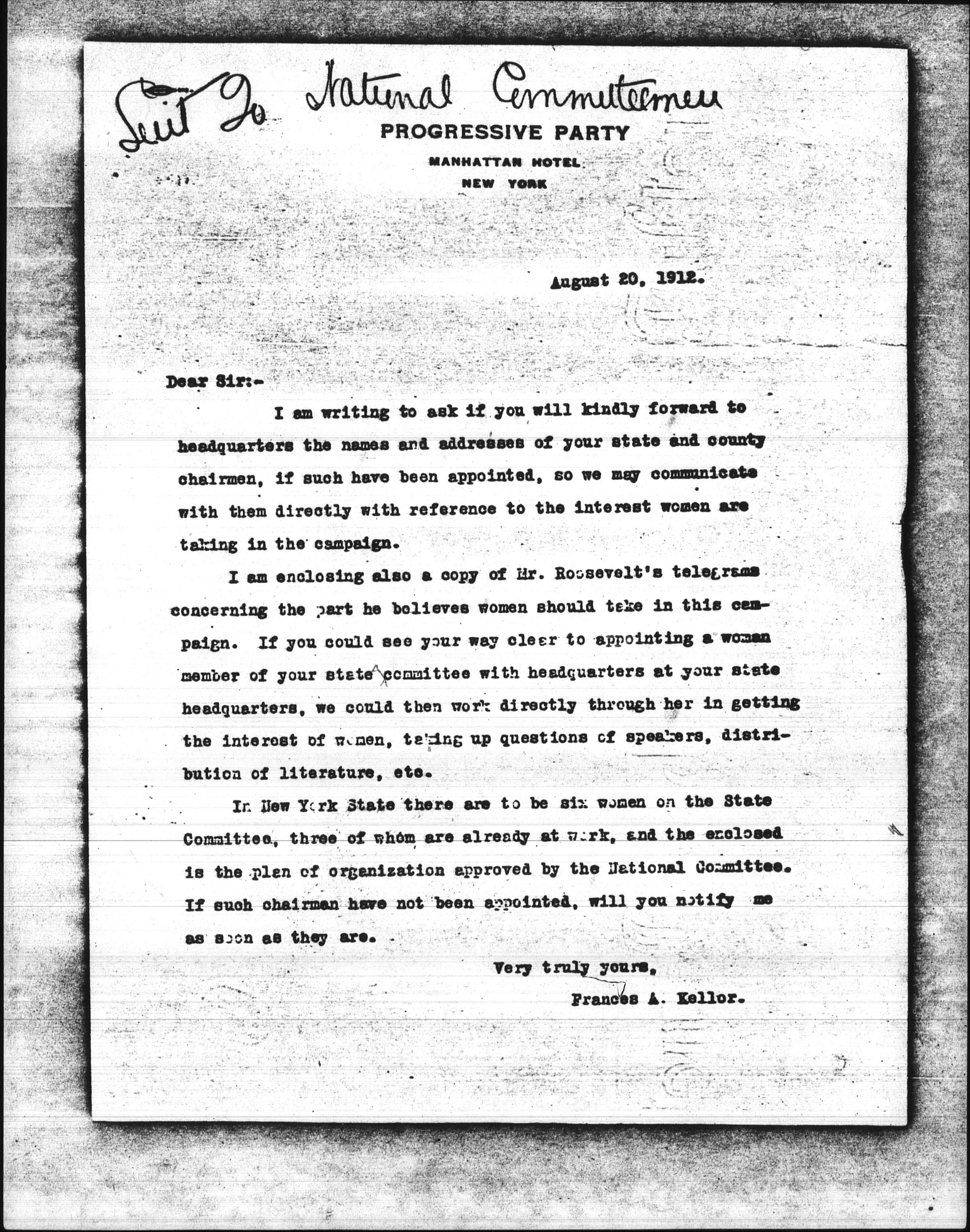 I am enclosing also a copy of Mr. Roosevelt's telegram concerning the part he believes women should take in this campaign. If you could see your way clear to appointing a woman member of your state committee with headquarters at your state headquarters, we could then work directly through her in getting the interest of women, taking up questions of speakers, distribution of literature, etc.