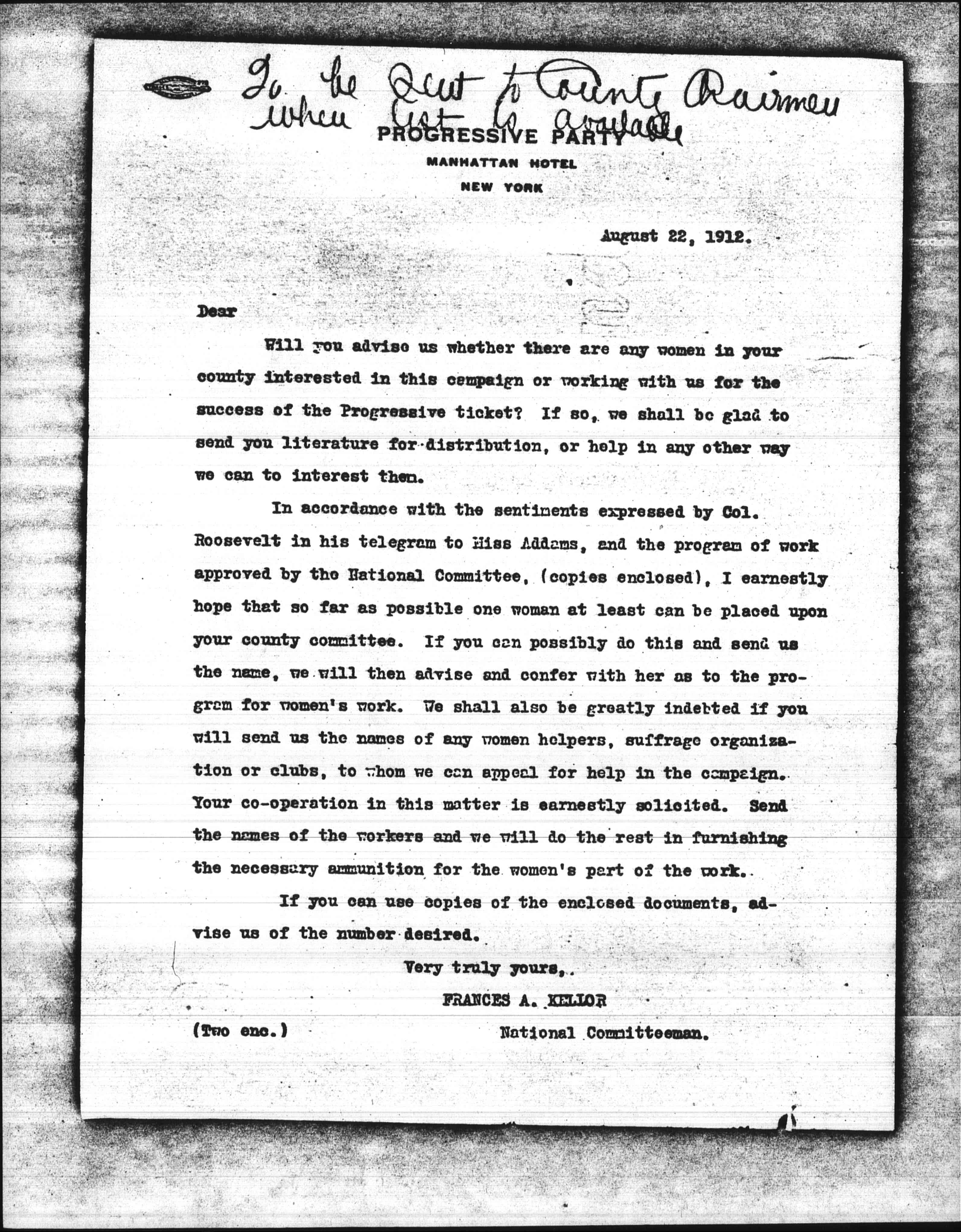 In accordance with the sentiments expressed by Col. Roosevelt in his telegram to Miss Addams, and the program of work approved by the National Committee, (copies enclosed), I earnestly hope that so far as possible one woman at least can be placed upon your county committee. If you can possibly do this and send us the name, we will then advise and confer with her as to the program for women's work. We shall also be greatly indebted if you will send us the names of any women helpers, suffrage organization or clubs, to whom we can appeal for help in the campaign. Your [cooperation] in this matter is earnestly solicited. Send the names of the workers and we will do the rest in furnishing the necessary ammunition for the women's part of the work.