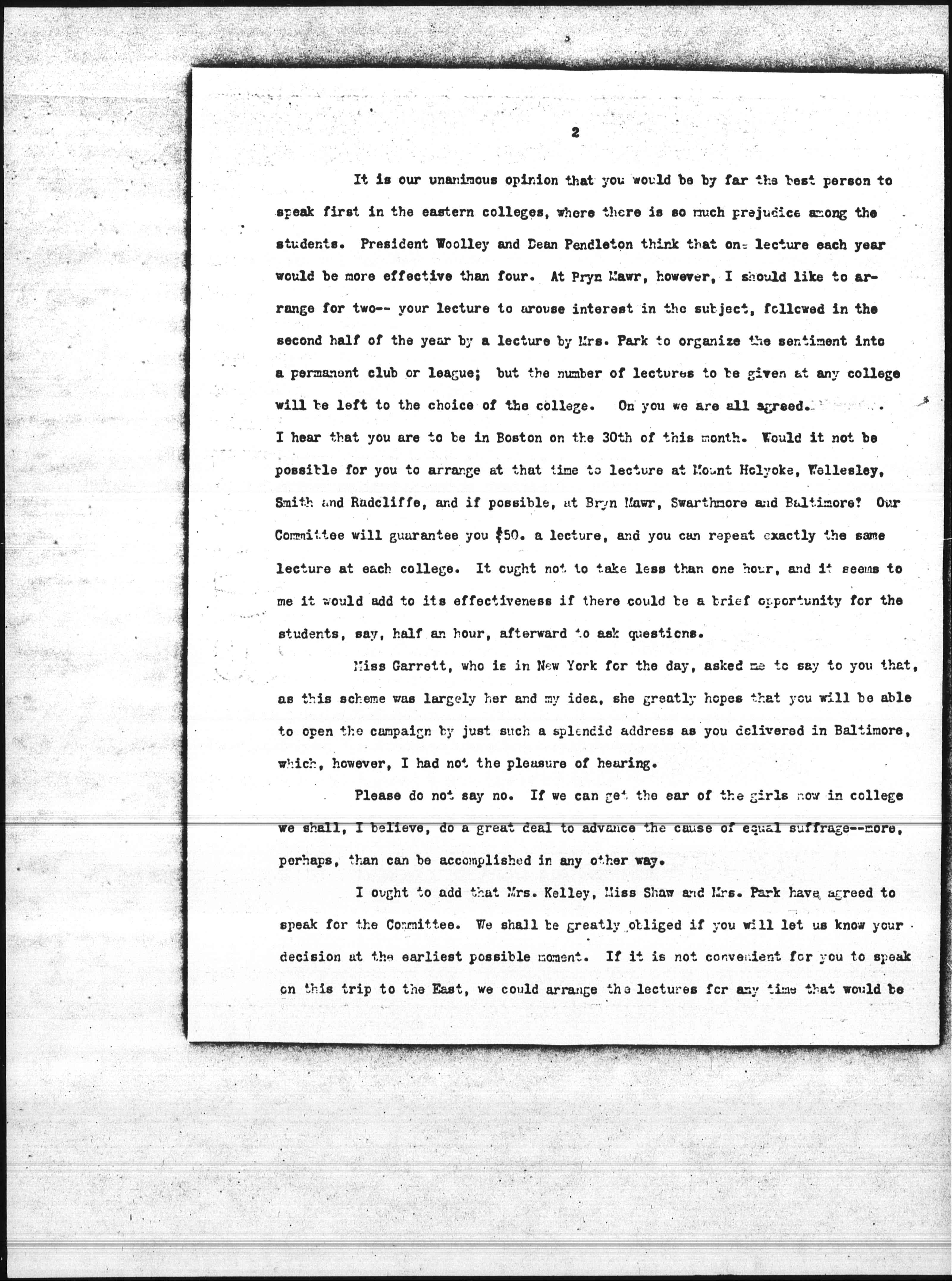 I ought to add that Mrs. Kelley, Miss Shaw and Mrs. Park have agreed to speak for the Committee. We shall be greatly obliged if you will let us know your decision at the earliest possible moment. If it is not convenient for you to speak on this trip to the East, we could arrange the lectures for any time that would be [page 3] convenient for you. The main thing is to have you.