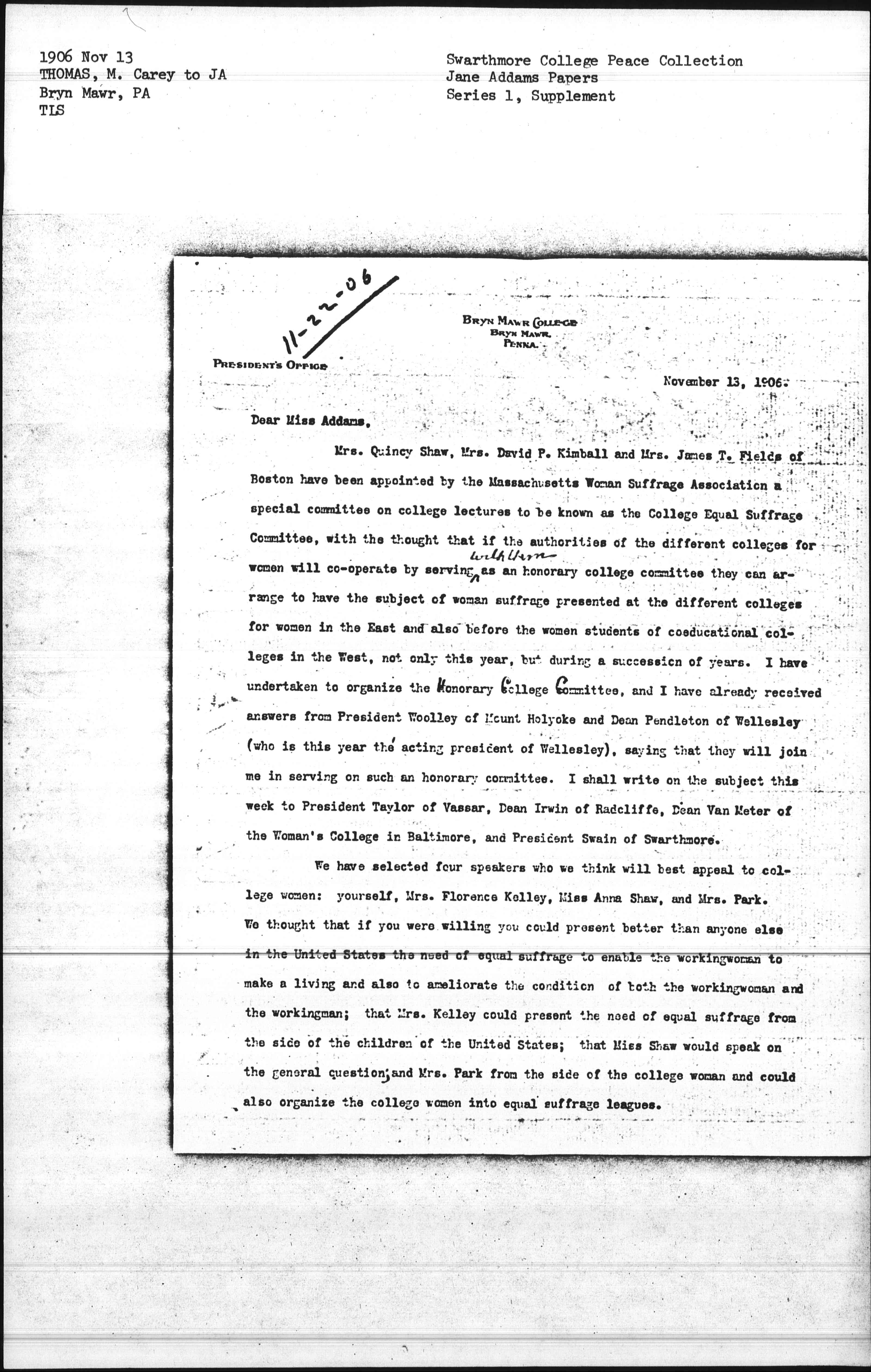 Mrs. Quincy Shaw, Mrs. David P. Kimball and Mrs. James T. Fields of Boston have been appointed by the Massachusetts Woman Suffrage Association a special committee on college lectures to be known as the College Equal Suffrage Committee, with the thought that if the authorities of the different colleges for women will [cooperate] by serving ↑with them↓ as an honorary college committee they can arrange to have the subject of woman suffrage presented at the different colleges for women in the East and also before the women students of coeducational colleges in the West, not only this year, but during a succession of years. I have undertaken to organize the Honorary College Committee, and I have already received answers from President Woolley of Mount Holyoke and Dean Pendleton of Wellesley (who is this year the acting president of Wellesley), saying that they will join me in serving on such an honorary committee. I shall write on the subject this week to President Taylor of Vassar, Dean Irwin of Radcliffe, Dean Van Meter of the Woman's College in Baltimore, and President Swain of Swarthmore.