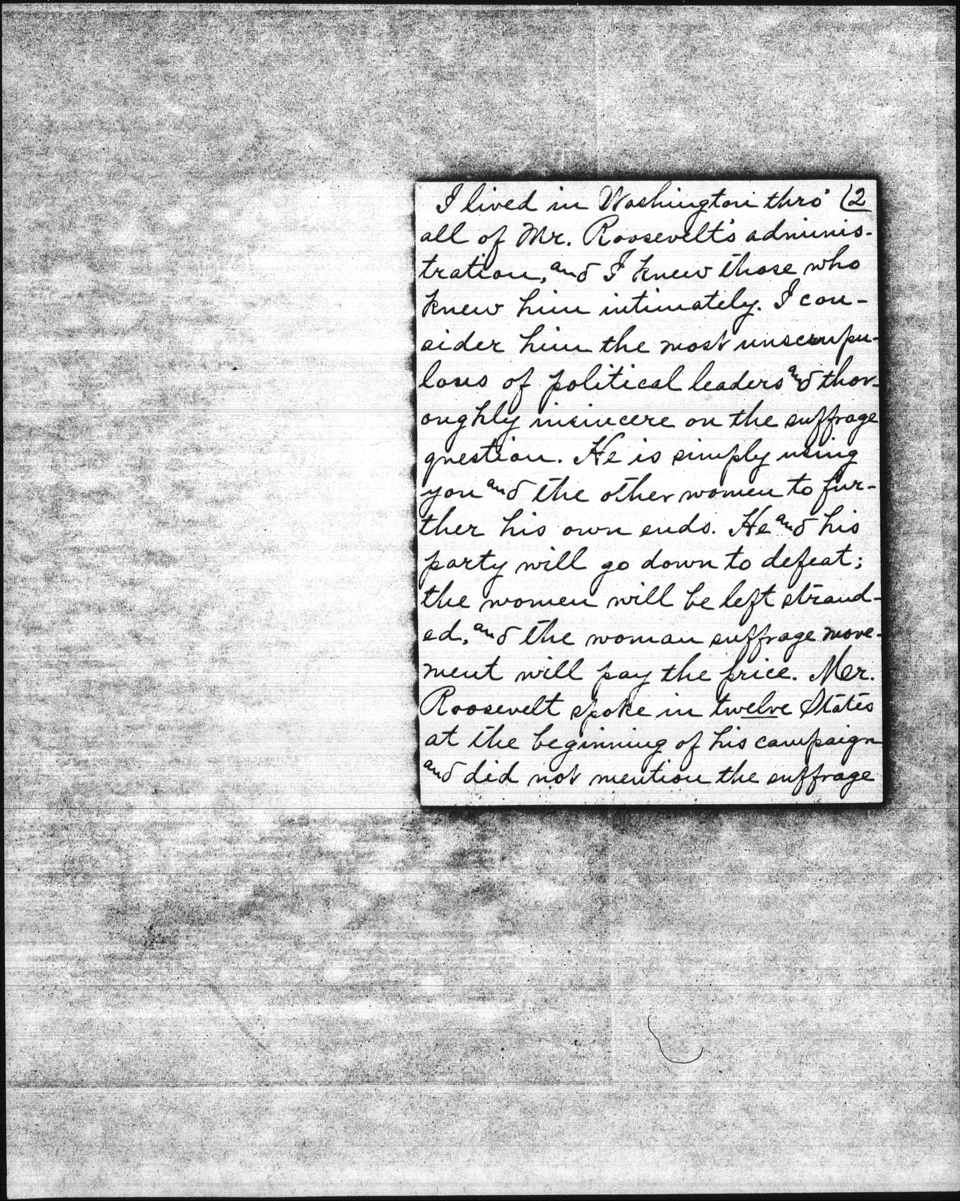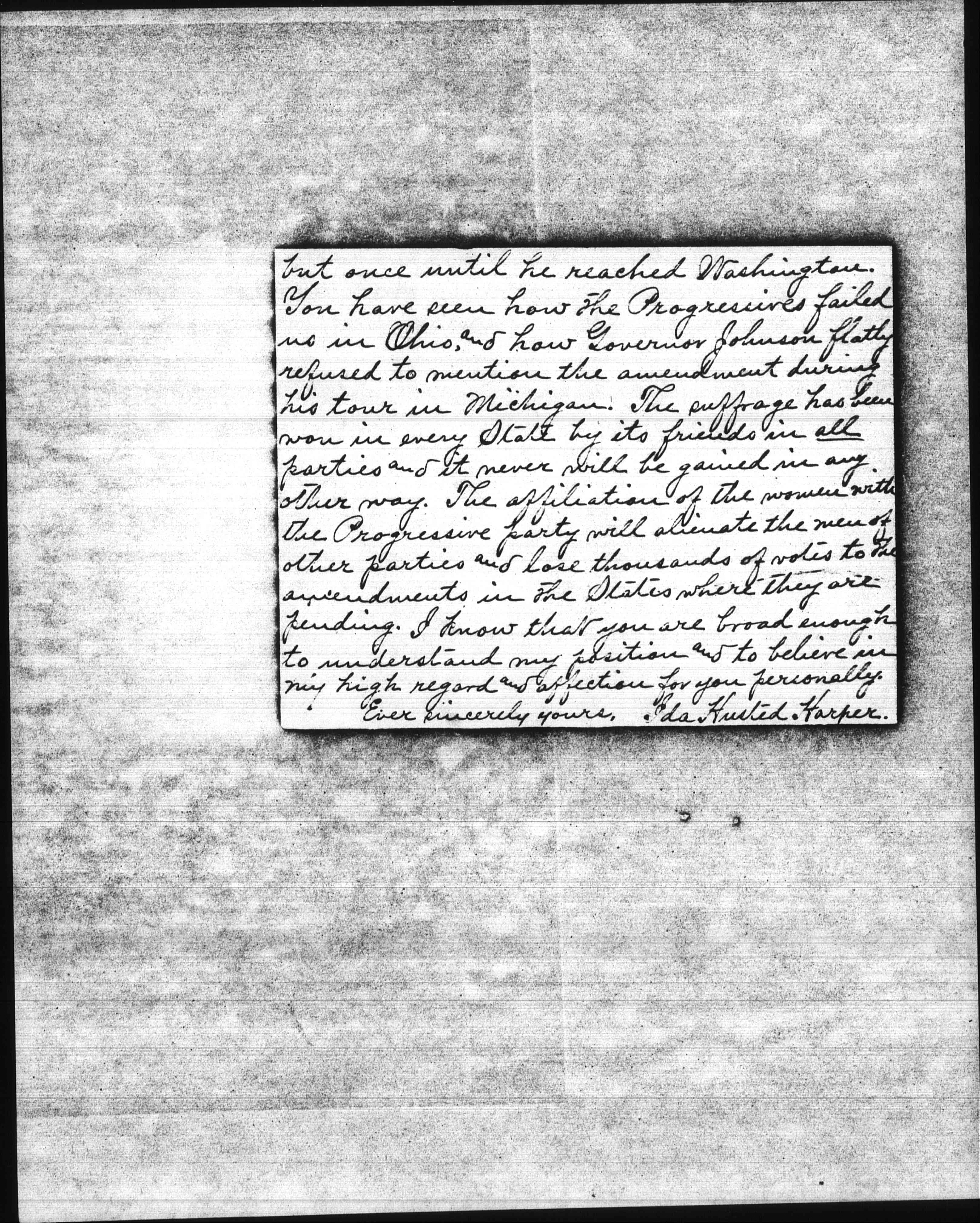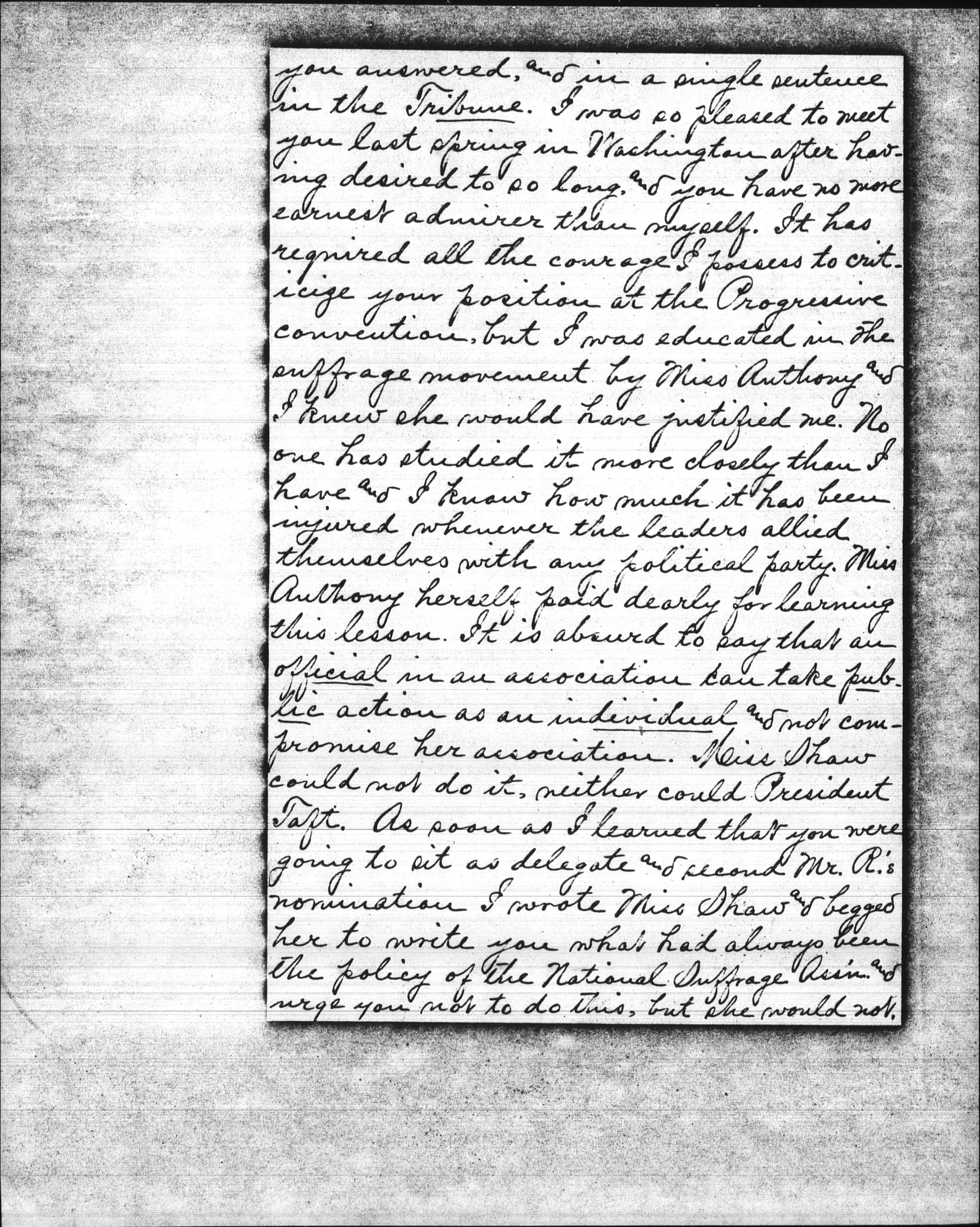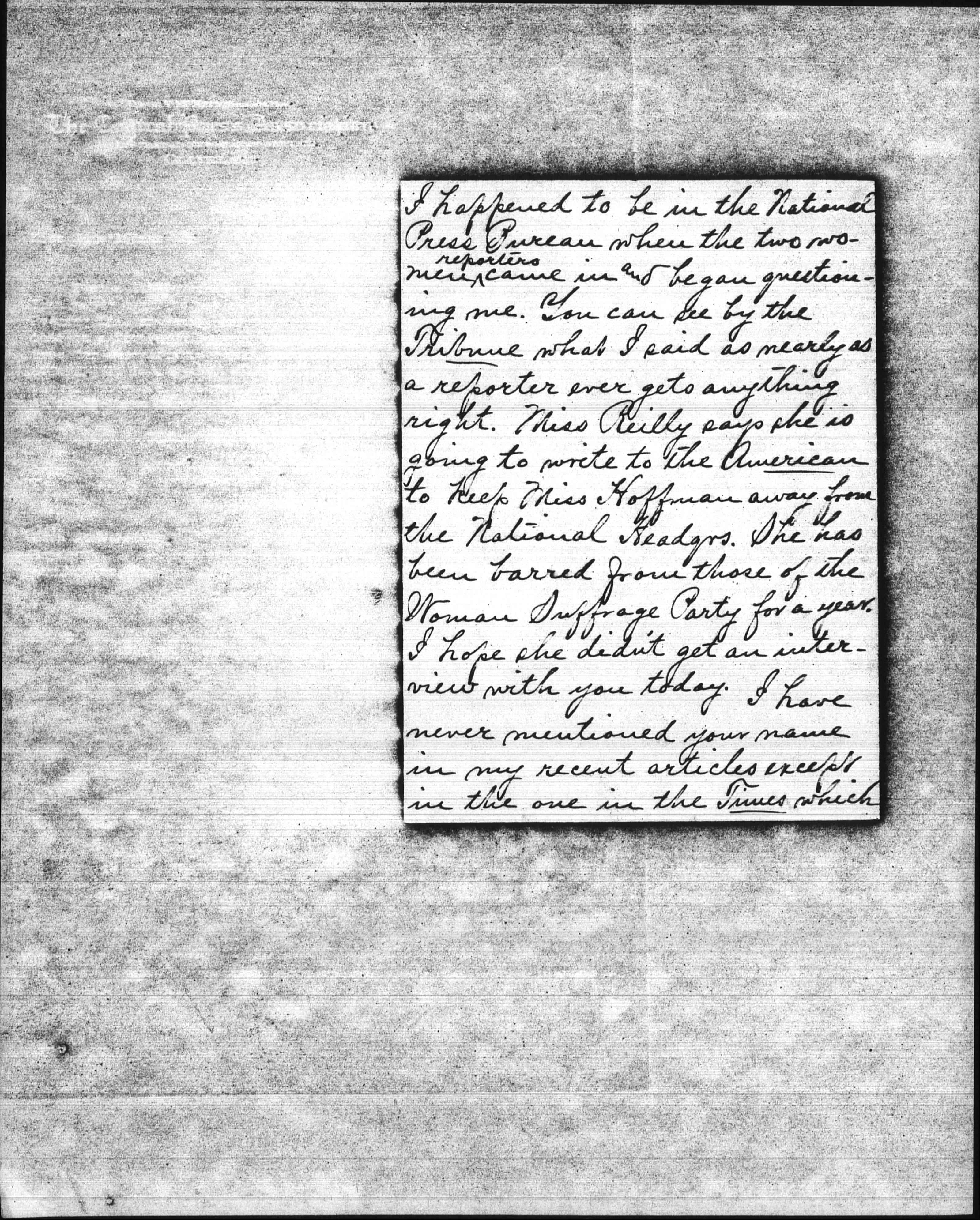 I was about to write you yesterday when Mrs. Dennett told me you were coming to New York. An alleged interview with me was published in the American Sunday or Monday in which I was made to say things about you which I never thought, much less expressed. I was anxious lest it should be used in the Chicago edition and was going to write you that it was absolutely false. [page 2] I happened to be in the National Press Bureau when the two women <reporters> came in and began questioning me. You can see by the Tribune what I said as nearly as a reporter ever gets anything right. Miss Reilly says she is going to write to the American to keep Miss Hoffman away from the National Headgrs. She has been barred from those of the Woman Suffrage Party for a year. I hope she didn't get an interview with you today. I have never mentioned your name in my recent articles except in the one in the Times which [page 3] you answered, and in a single sentence in the Tribune. I was so pleased to meet you last spring in Washington after having desired to so long, and you have no more earnest admirer than myself. It has required all the courage I possess to criticize your position at the Progressive convention, but I was educated in the suffrage movement by Miss Anthony and I knew she would have justified me. No one has studied it more closely than I have and I know how much it has been injured whenever the leaders allied themselves with any political party. Miss Anthony herself paid dearly for learning this lesson. It is absurd to say that an official in an association can take public action as an individual and not compromise her association. Miss Shaw could not do it, neither could President Taft. As soon as I learned that you were going to sit as delegate and second Mr. R's nomination I wrote Miss Shaw and begged her to write you what had always been the policy of the National Suffrage Ass'n. and urge you not to do this, but she would not. [page 4] I lived in Washington [through] all of Mr. Roosevelt's administration, and I knew those who knew him intimately. I consider him the most unscrupulous of political leaders and thoroughly insincere on the suffrage question. He is simply using you and the other women to further his own ends. He and his party will go down to defeat; the women will be left stranded, and the woman suffrage movement will pay the price. Mr. Roosevelt spoke in twelve States and the beginning of his campaign and did not mention the suffrage [page 5] but once until he reached Washington. You have seen how the Progressives failed us in Ohio, and how Governor Johnson flatly refused to mention the amendment during his tour in Michigan. The suffrage has been won in every State by its friends in all parties and it never will be gained in any other way. The affiliation of the women with the Progressive party will alienate the men of other parties and lose thousands of votes to the amendments in the States where they are pending. I know that you are broad enough to understand my position and to believe in my high regard and affection for you personally.