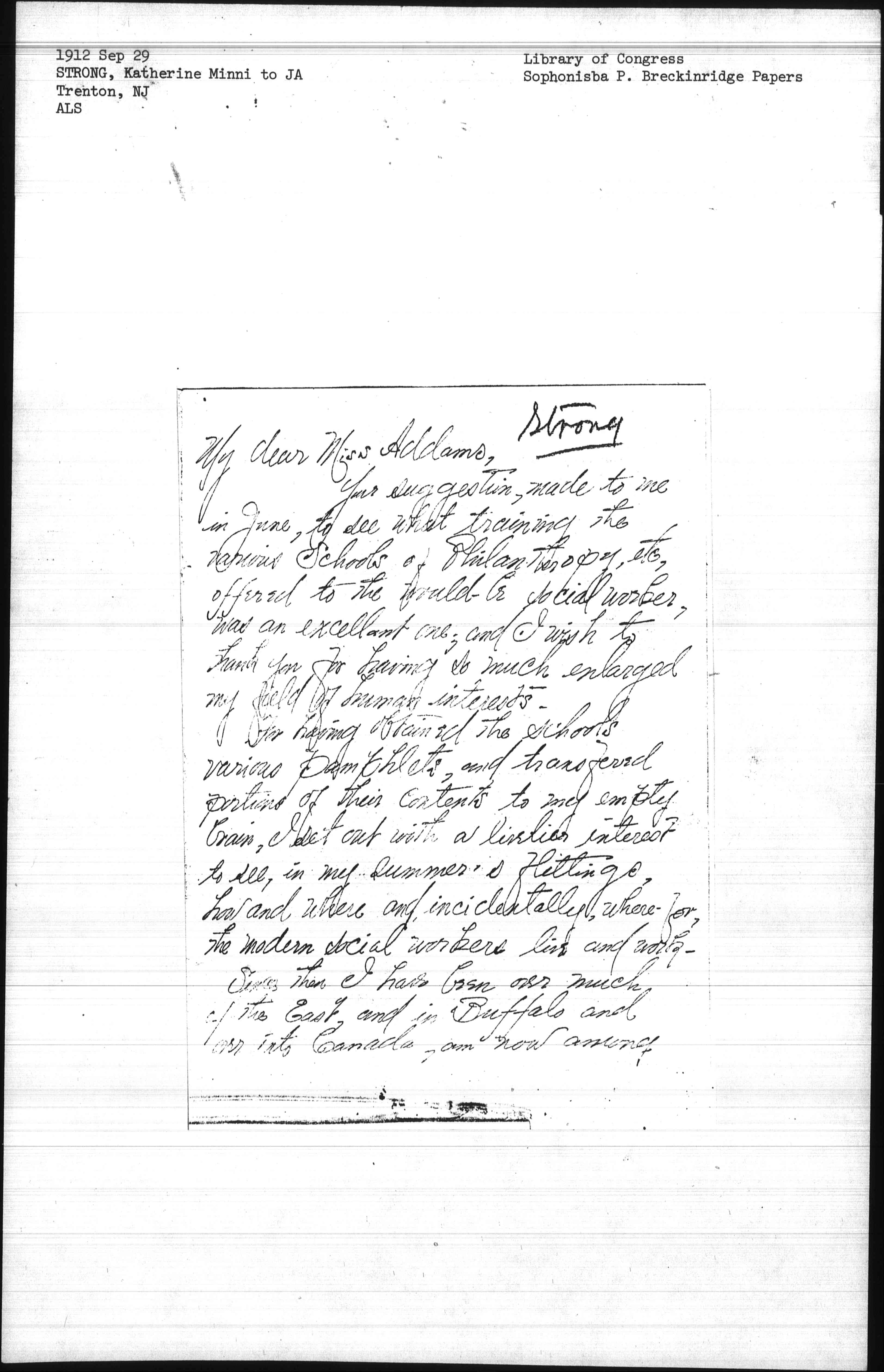 Your suggestion, made to me in June, to see what training the various Schools of Philanthropy, etc, offered to the would-be social worker, was an excellent one; and I wish to thank you for having so much enlarged my field of human interests.