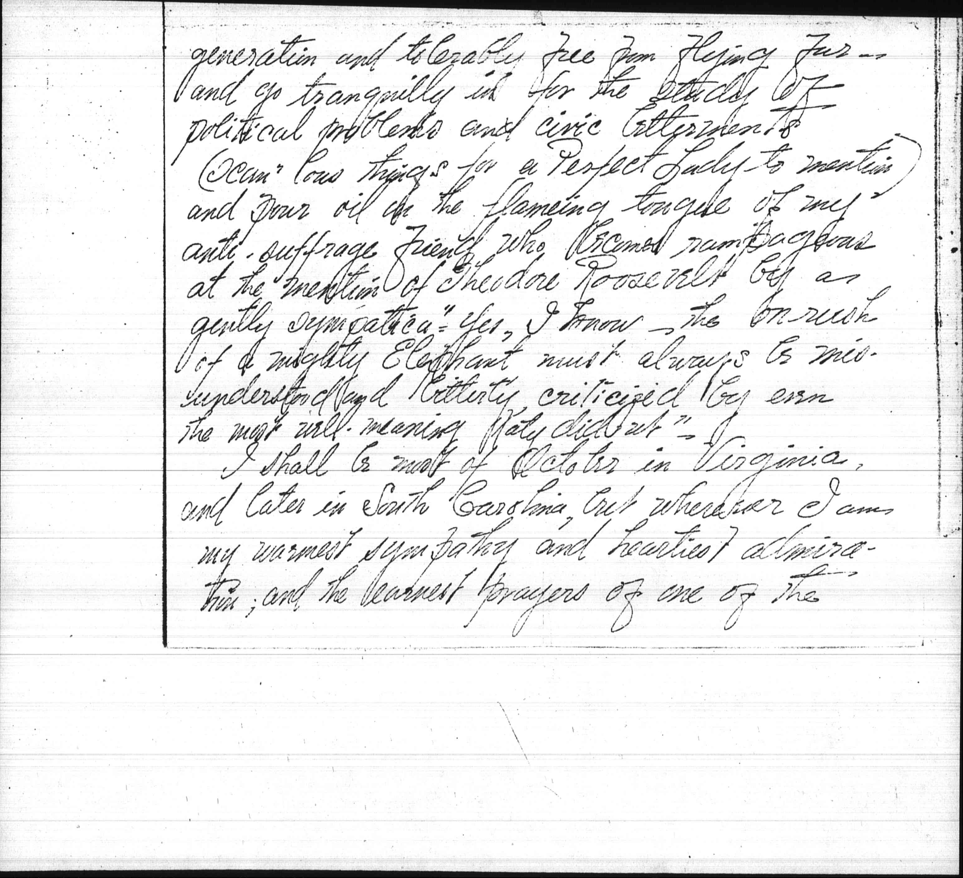 I look with indulgent amusement at my cat-like sister woman perched precariously upon the Fence -- almighty safe place from which to view the prettiest flight of our [page 4] generation and tolerably free from flying far -- and go tranquilly in for the study of political problems and civic betterments (I can [low] things for a Perfect Lady to mention) and pour oil on the flaming tongue of my anti-suffrage friend who becomes rampageous at the mention of Theodore Roosevelt by a gently sympathetic "Yes, I know -- the onrush of a mighty Elephant must always be misunderstood and bitterly criticized by even the most well-meaning Katy didn't" --