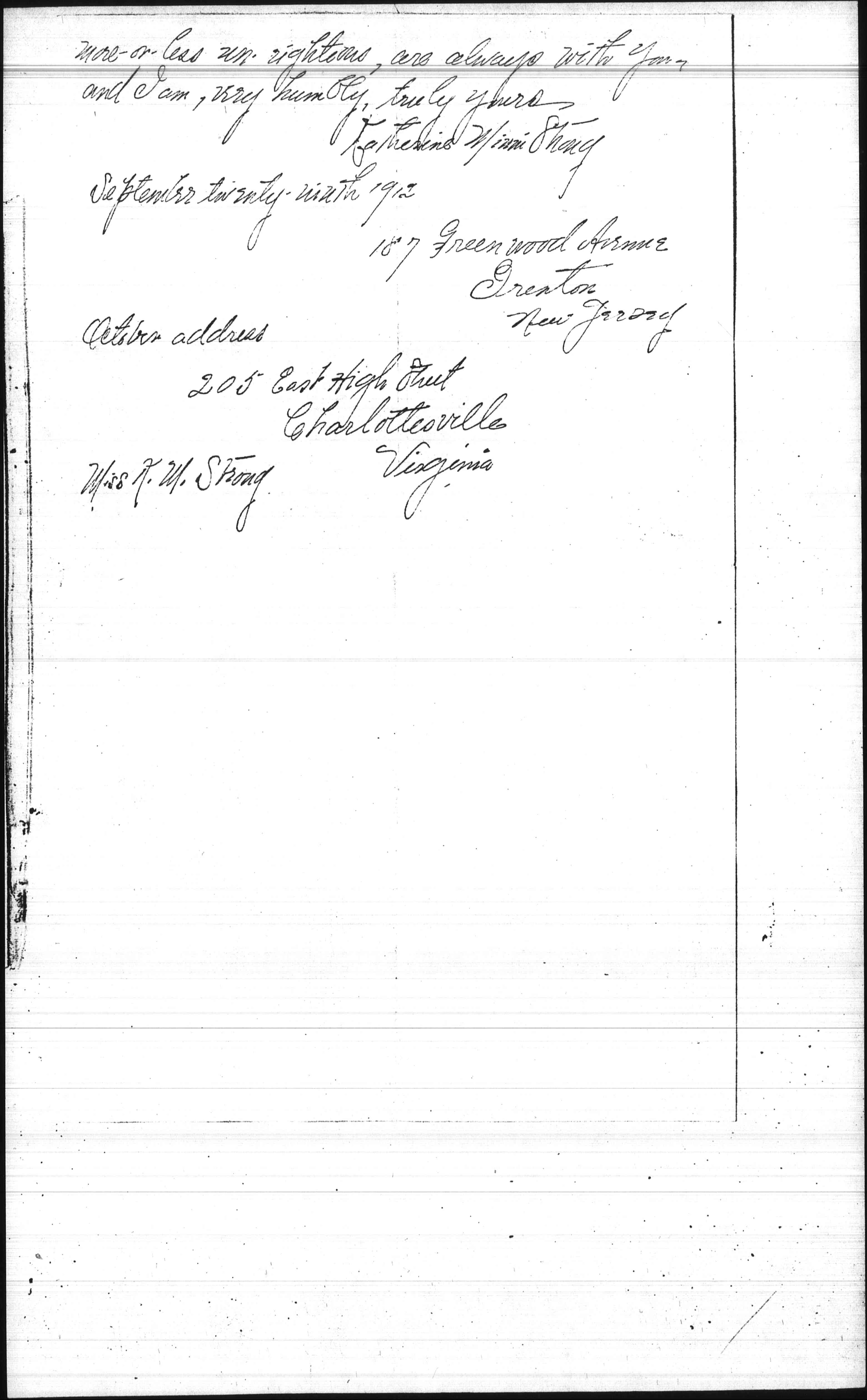 I shall be most of October in Virginia, and later in South Carolina, but wherever I am my warmest sympathy and heartiest admiration; and the earnest prayers of one of the [page 5] more-or-less un-righteous, are always with you, and I am, very humbly, truly yours
