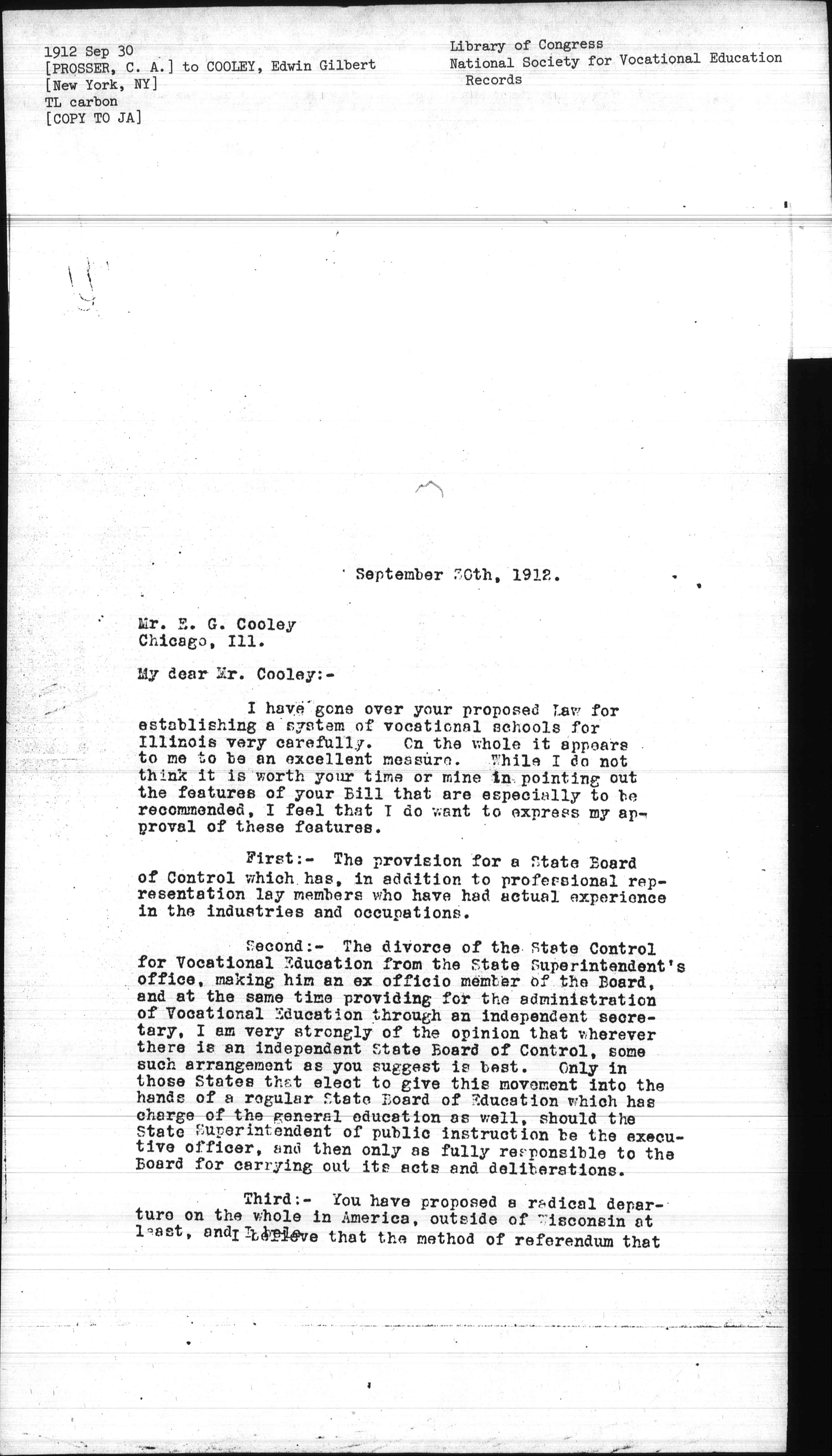Fifth: -- I believe it would be for the best interest of Vocational Education should the citizenship of Illinois be willing to try it that vocational education should for the next quarter of a century at least, be permitted to develop entirely independent of the regular public schools. From this view-point your arrangement for the local Board of Control is an excellent one.