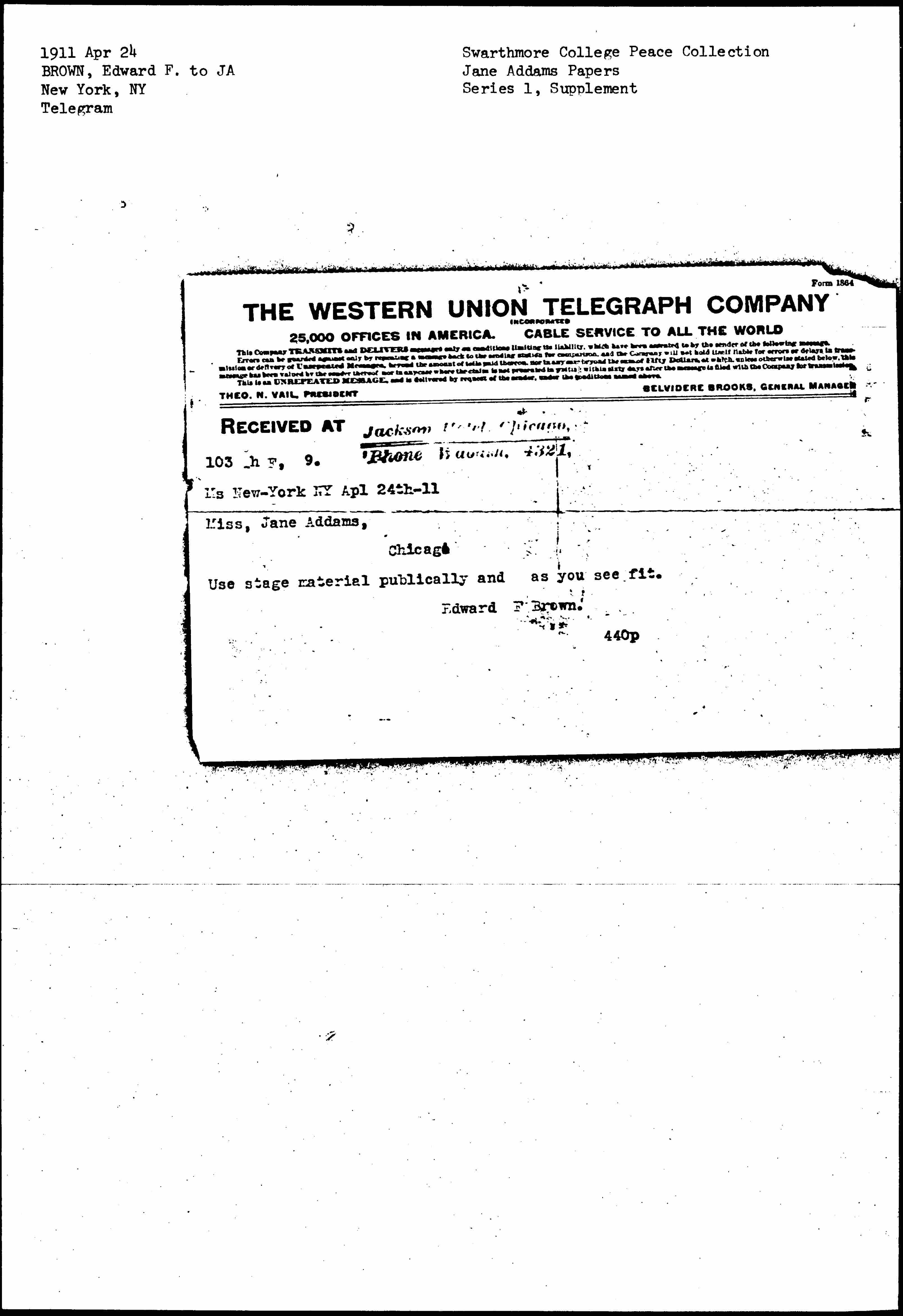 RECEIVED AT Jackson Hotel, Chicago Phone Wbasah 4321