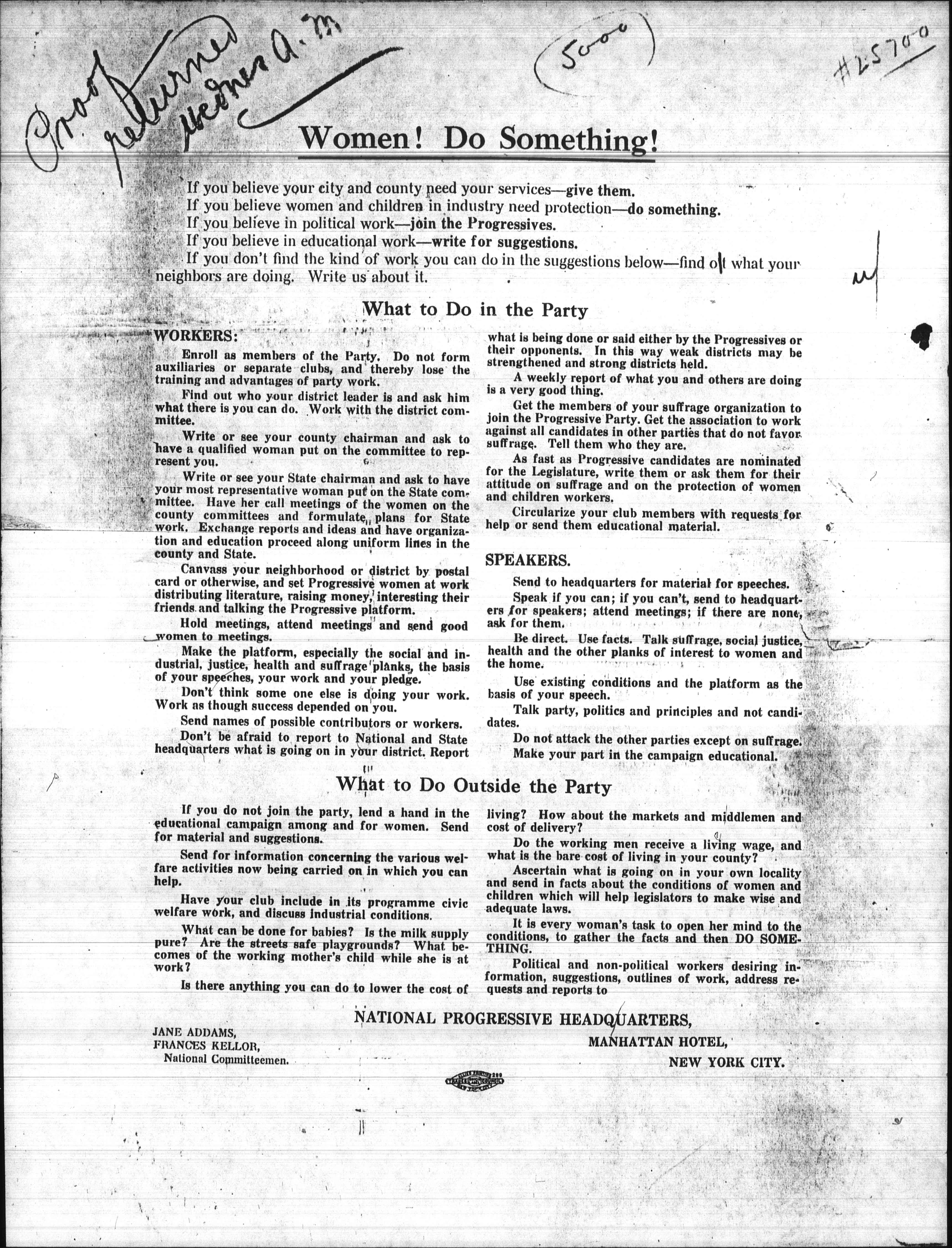 Canvass your neighborhood or district by postal card or otherwise, and set Progressive women at work distributing literature, raising money, interesting their friends and talking the Progressive platform.
