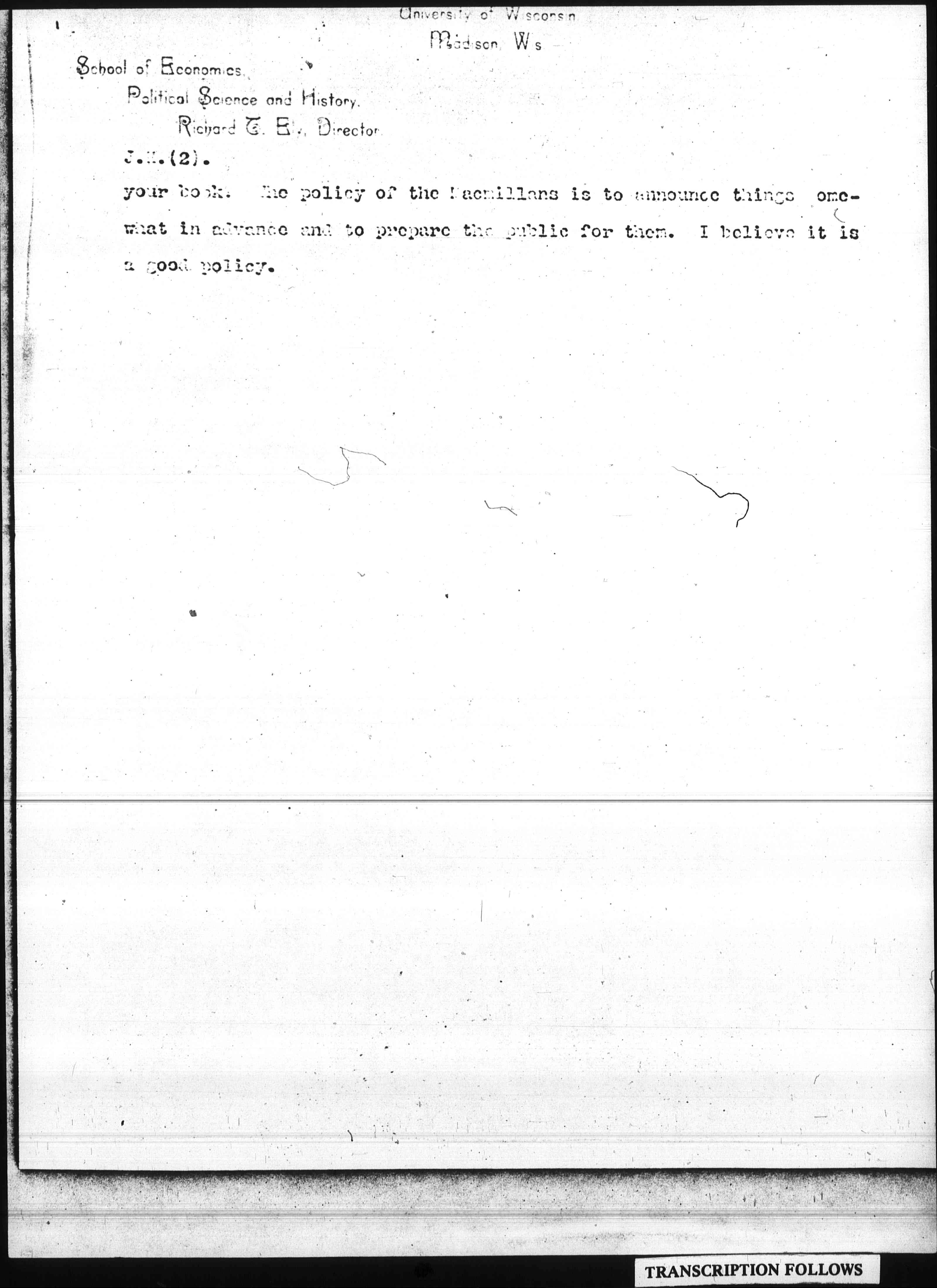 P. S. Can you not, without going into details and mentioning chapters give me ten or a dozen lines indicative of the general character of [page 2] your book. The policy of the Macmillans is to announce things somewhat in advance and to prepare the public for them. I believe it is a good policy.
