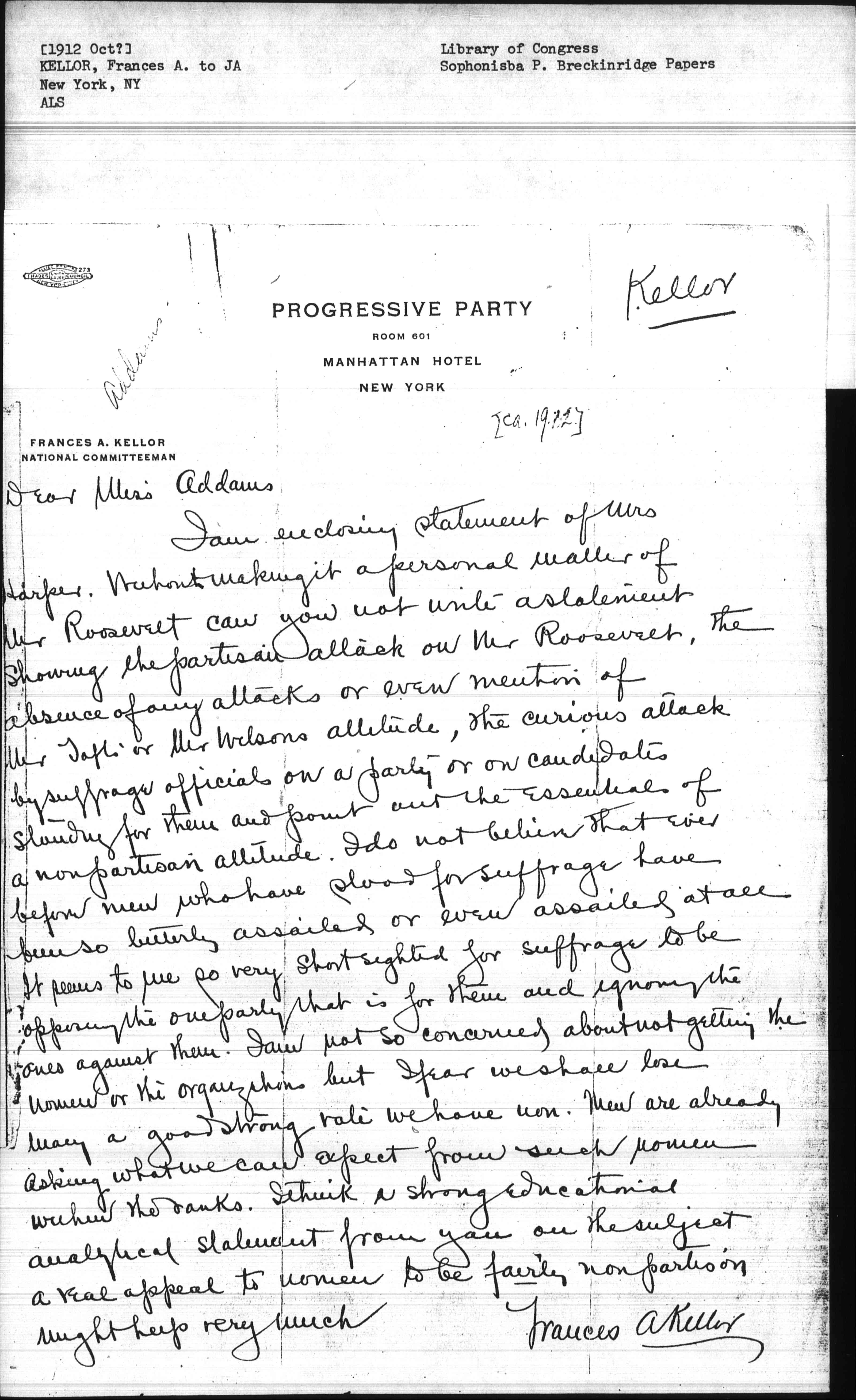 I am enclosing statement of Mrs Harper. Without making it a personal matter of Mr Roosevelt can you not write a statement showing the partisan attack on Mr Roosevelt, the absence of any attacks or even mention of Mr Taft or Mr Wilsons attitude, the curious attack by suffrage officials on a party or on candidates standing for them and point out the essentials of a nonpartisan attitude. I do not believe that ever before now who have stood for suffrage have been so bitterly assailed or ever assailed at all. It seems to me so very short sighted for suffrage to be opposing the one party that is for them and ignoring the ones against them. I am not so concerned about not getting the women or the organization but I fear we shall lose many a good strong vote we have won. Men are already asking what we can expect from such women within the ranks. I think a strong educational analytical statement from you on the subject a real appeal to women to be fairly nonpartisan might help very much