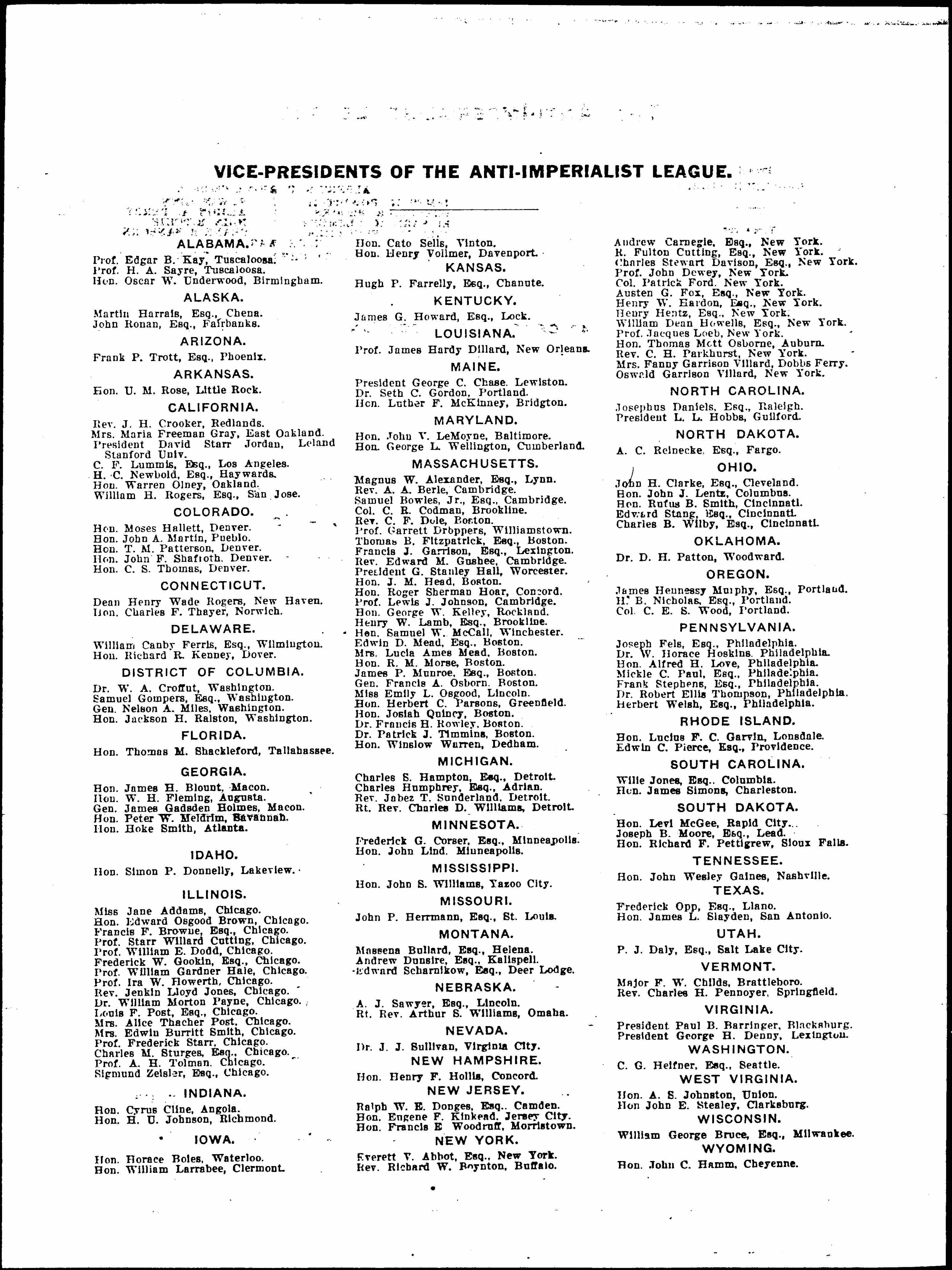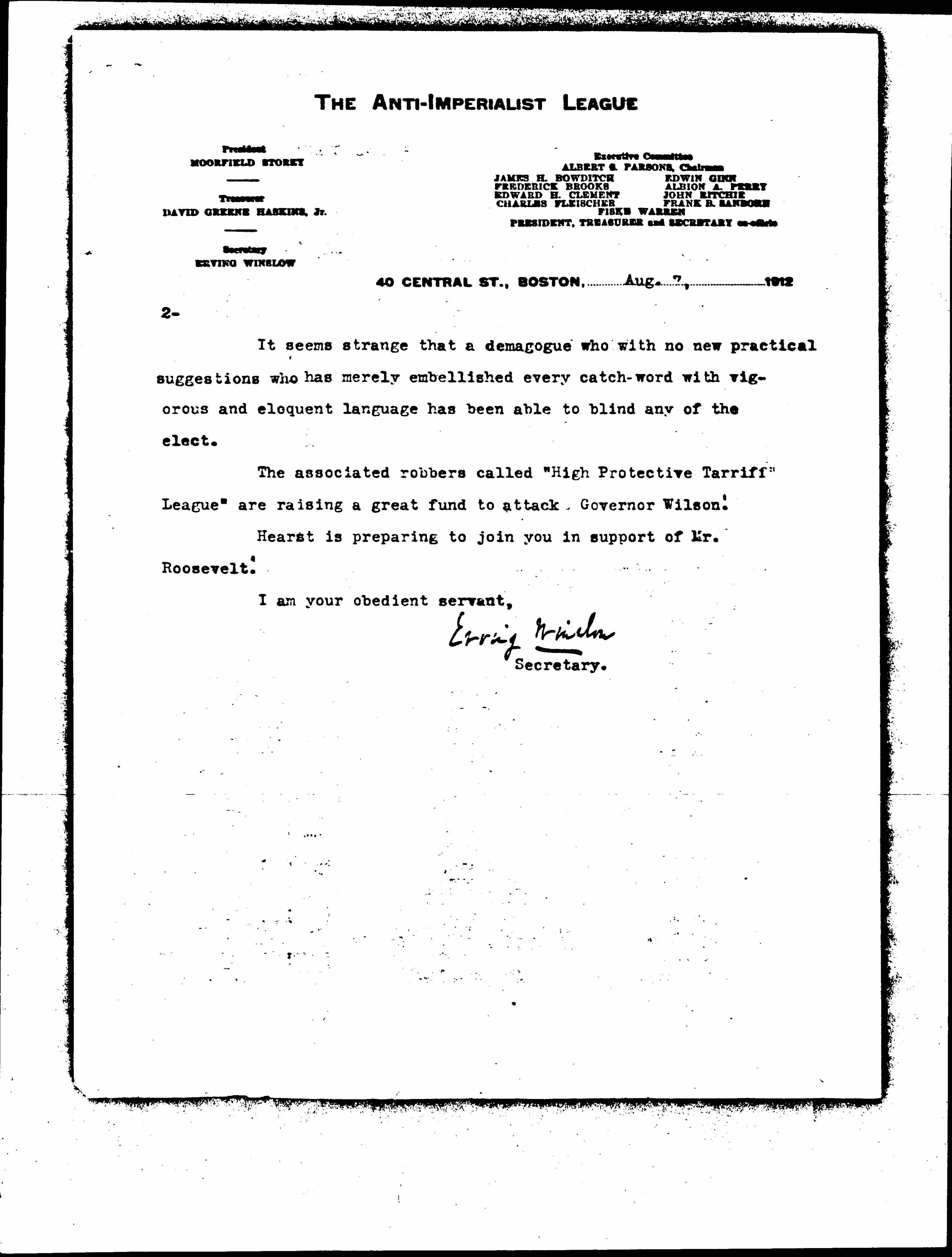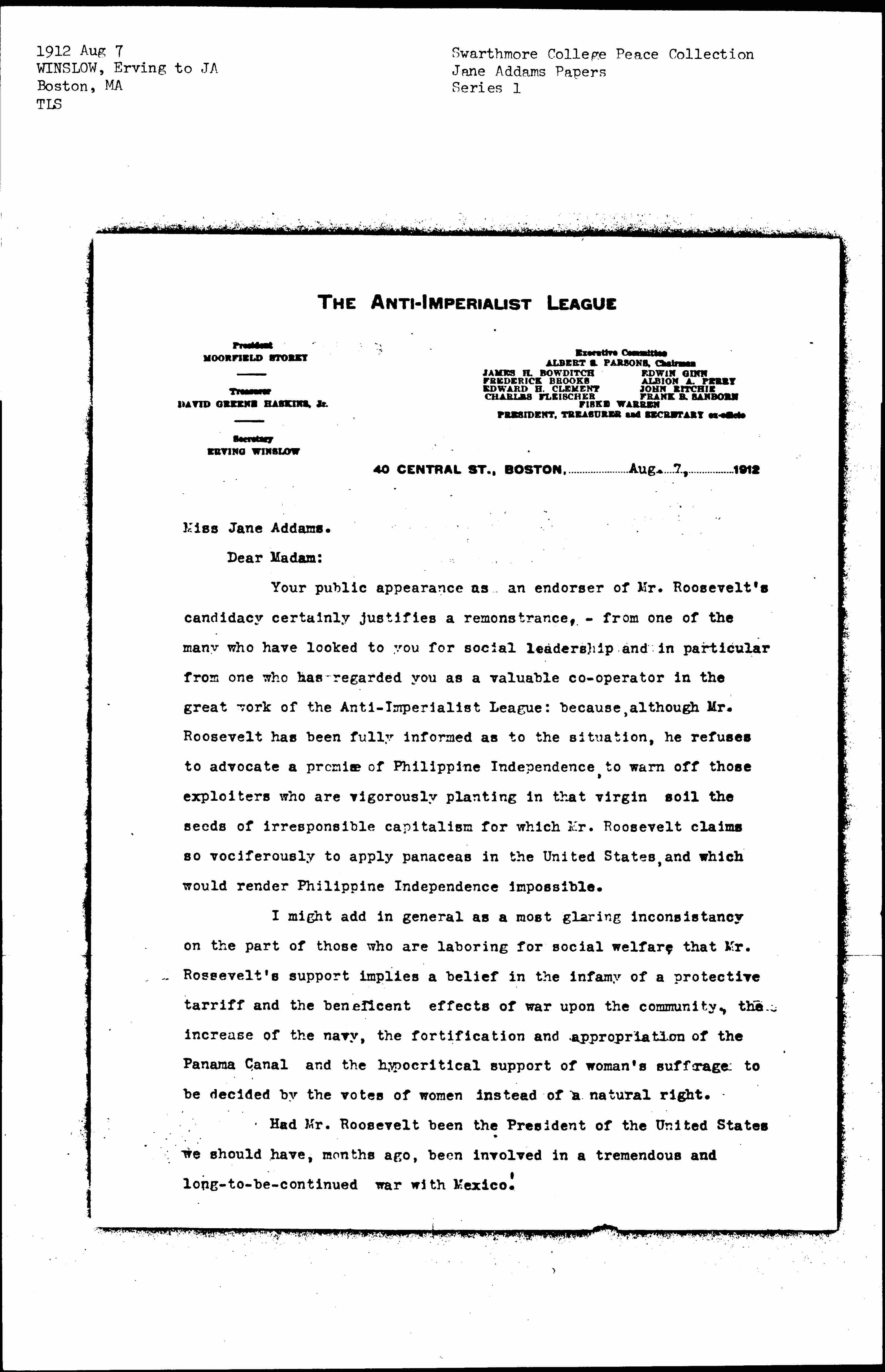 Your public appearance as an endorser of Mr. Roosevelt's candidacy certainly justifies a remonstrance, -- from one of the many who have looked to you for social leadership and in particular from one who has regarded you as a valuable [cooperator] in the great work of the Anti-Imperialist League: because, although Mr. Roosevelt has been fully informed as to the situation, he refuses to advocate a promise of Philippine Independence, to warn off those exploiters who are vigorously planting in that virgin soil the seeds of irresponsible capitalism for which Mr. Roosevelt claims so vociferously to apply panaceas in the United States, and which would render Philippine Independence impossible.